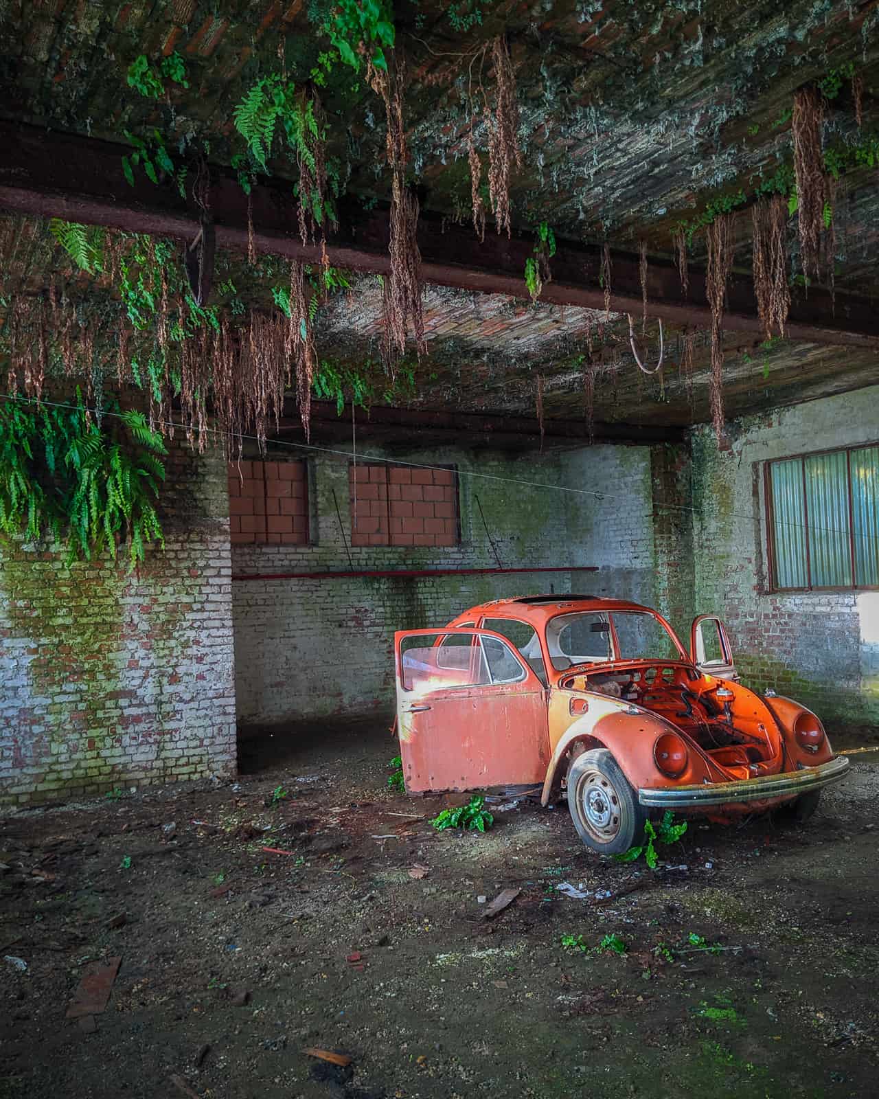 My favourite location of the trip was the Napoleon Beatle; a red VW Beatle in an old garage. The walls and ceiling on one side of the room were green with ferns. Likewise, ferns have also sprouted in scattered patches around the car. This contrast of red and green appeals to my love of bright colours.