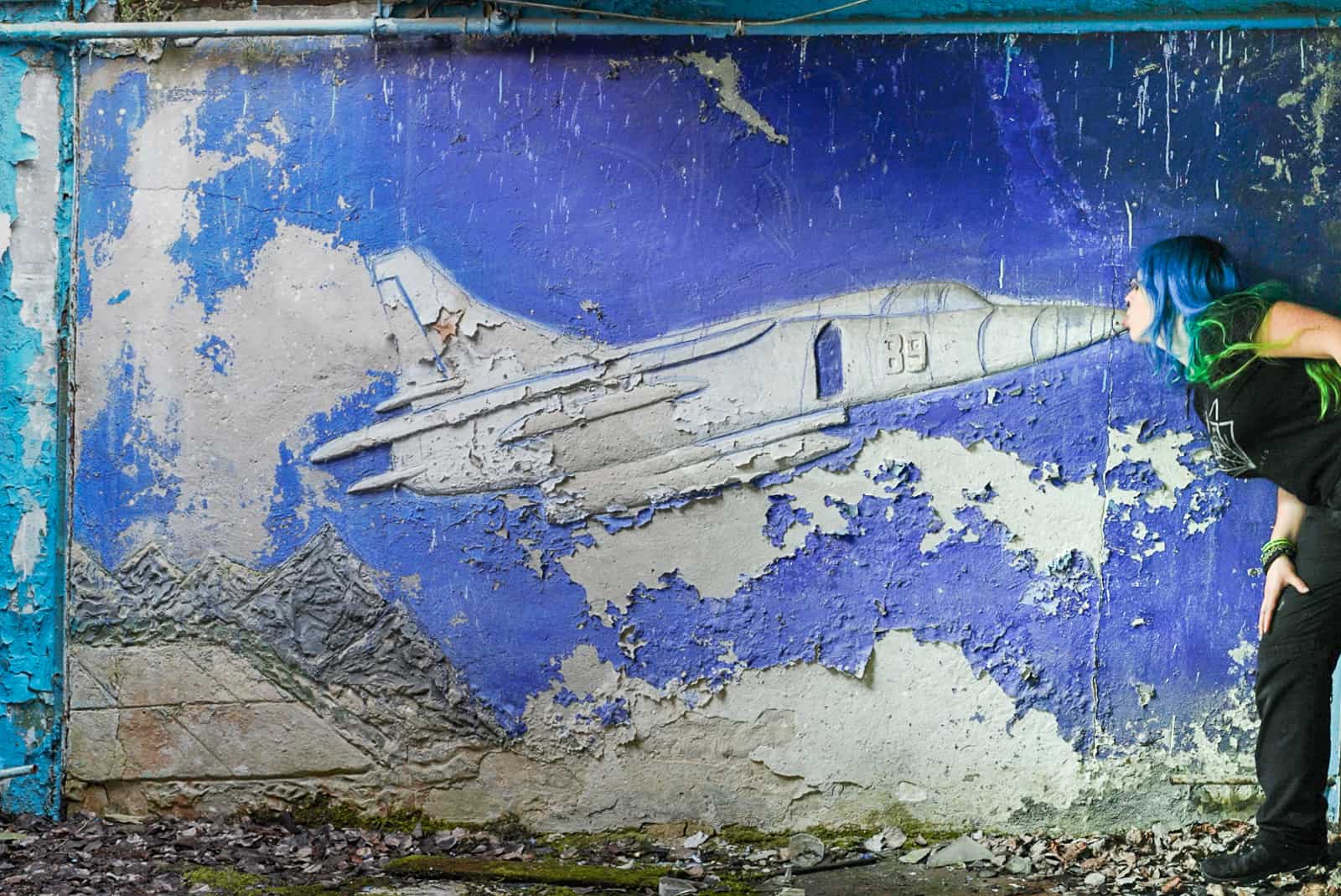 I am always keen to photograph Soviet murals. On this trip I had my heart set on two examples, featuring my favourite airplane (the intimidating MiG-21). After much searching I found both (at least, in a fashion). Unfortunately, one had almost completely disintegrated and I only recognised the wall based on the blue and yellow sunburst pattern background. The part with the MiG, was complete gone. The second one, although slightly tarnished, was treasure worth seeking out (and worthy of my usual MiG love selfie)!