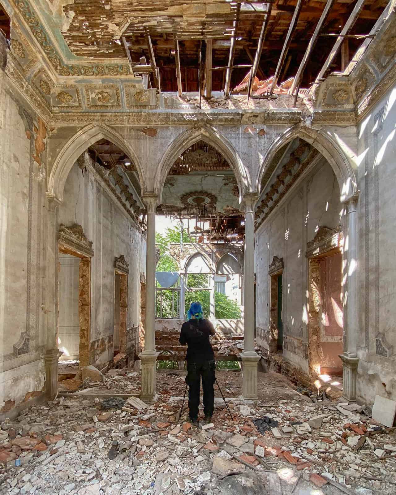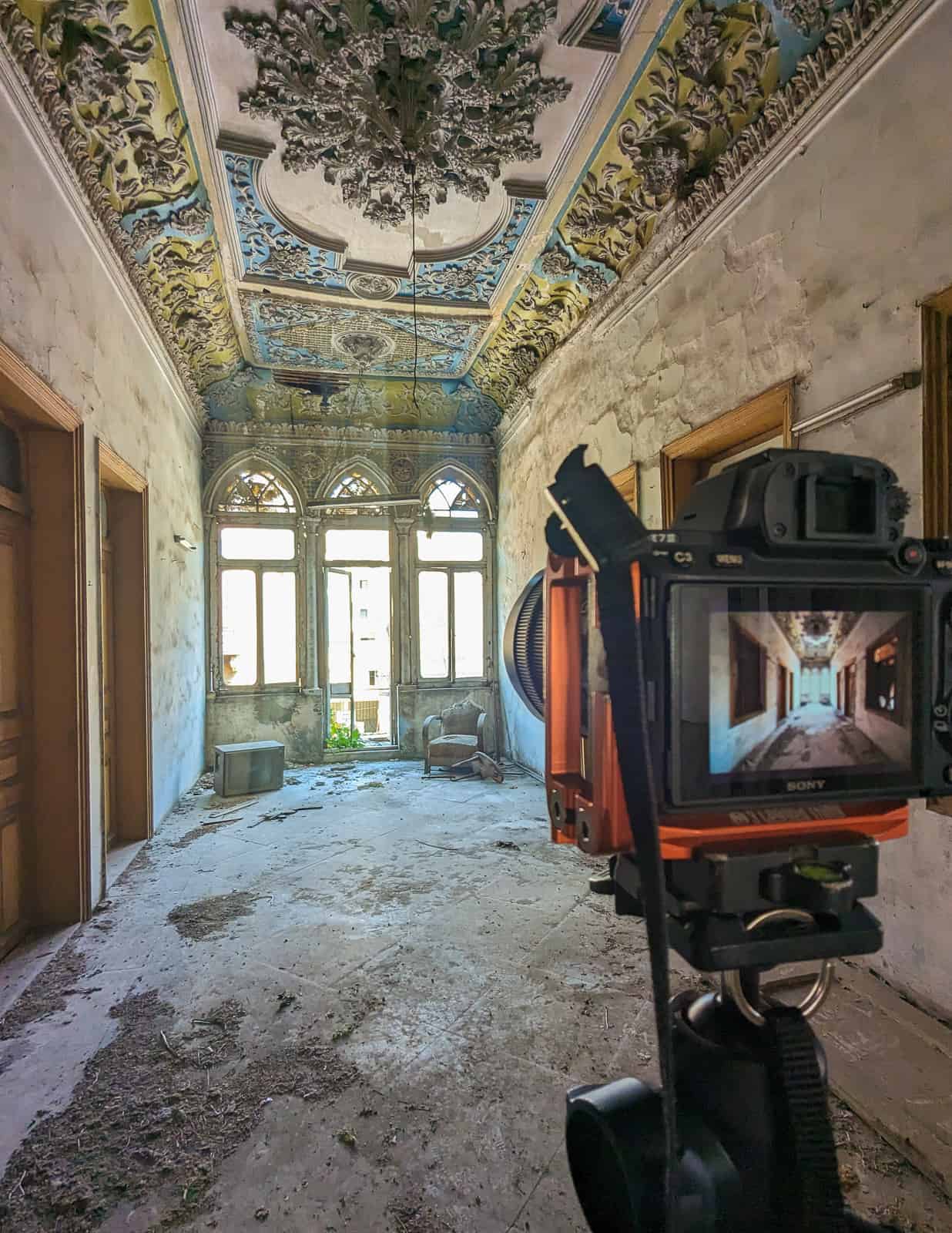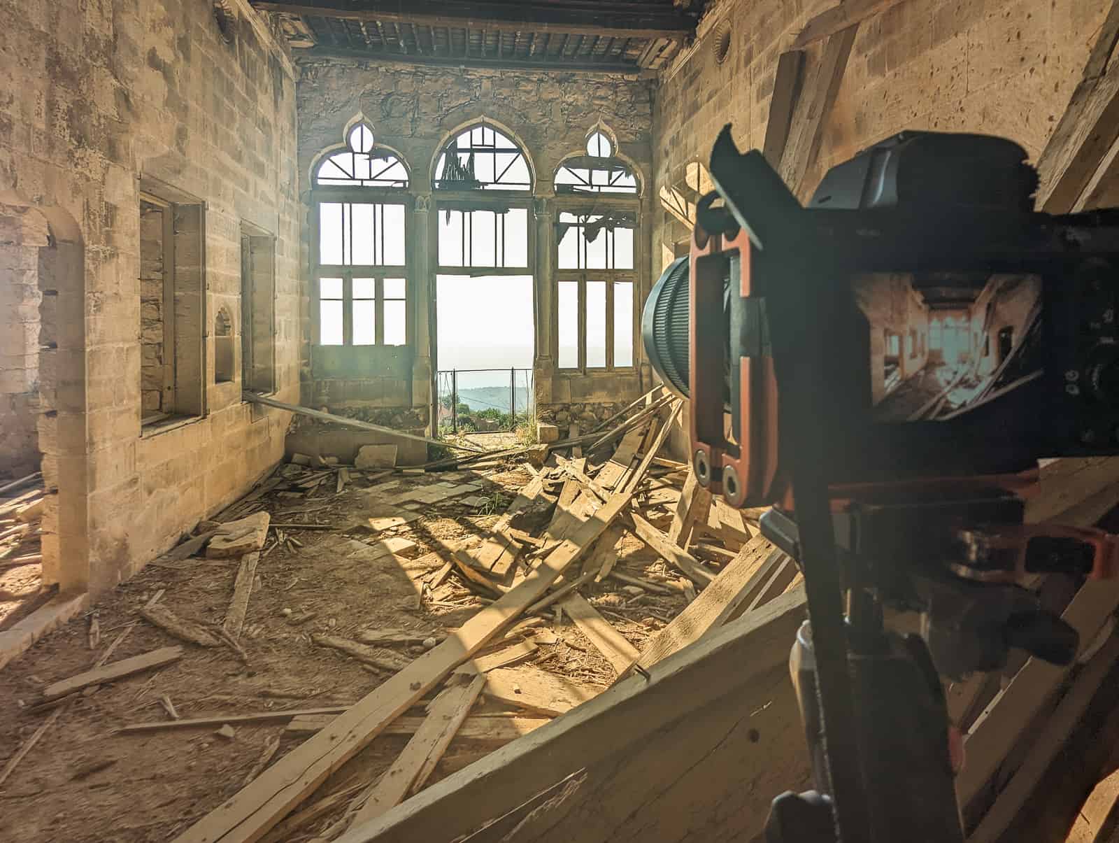 The beauty of the exotic architecture drew me to Lebanon in the summer of 2023. The Lebanese building style is so different from anything else I have previously photographed. Many of the high-society houses and palaces from the 19th century conform to a certain style. Their key features are: red roof tiles, high ceilings, interior arcades, and three pointed arch windows/balconies on the street-facing wall of a large central room. These triple (or quintuple, five) arch windows are stunning, often accompanied by ornate ceilings of the large adjacent room. Add in some natural decay or some vivid green plant growth, and you can find the most beautiful motifs.