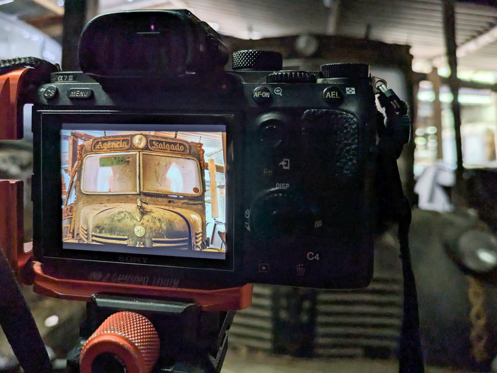 On the final day of the trip, I explored a mammoth collection of cars tucked away inside some large warehouse-sized garages. Inside is a fascinating treasure trove and an eclectic collection of vehicles. From Portuguese taxis and ornate funeral cars to an Art Deco Buick and a sporty red MG convertible. Curiously, an old armoured personnel carrier sits against one wall. Locked up tight, but I managed to shoot through a propped-open viewport slit.