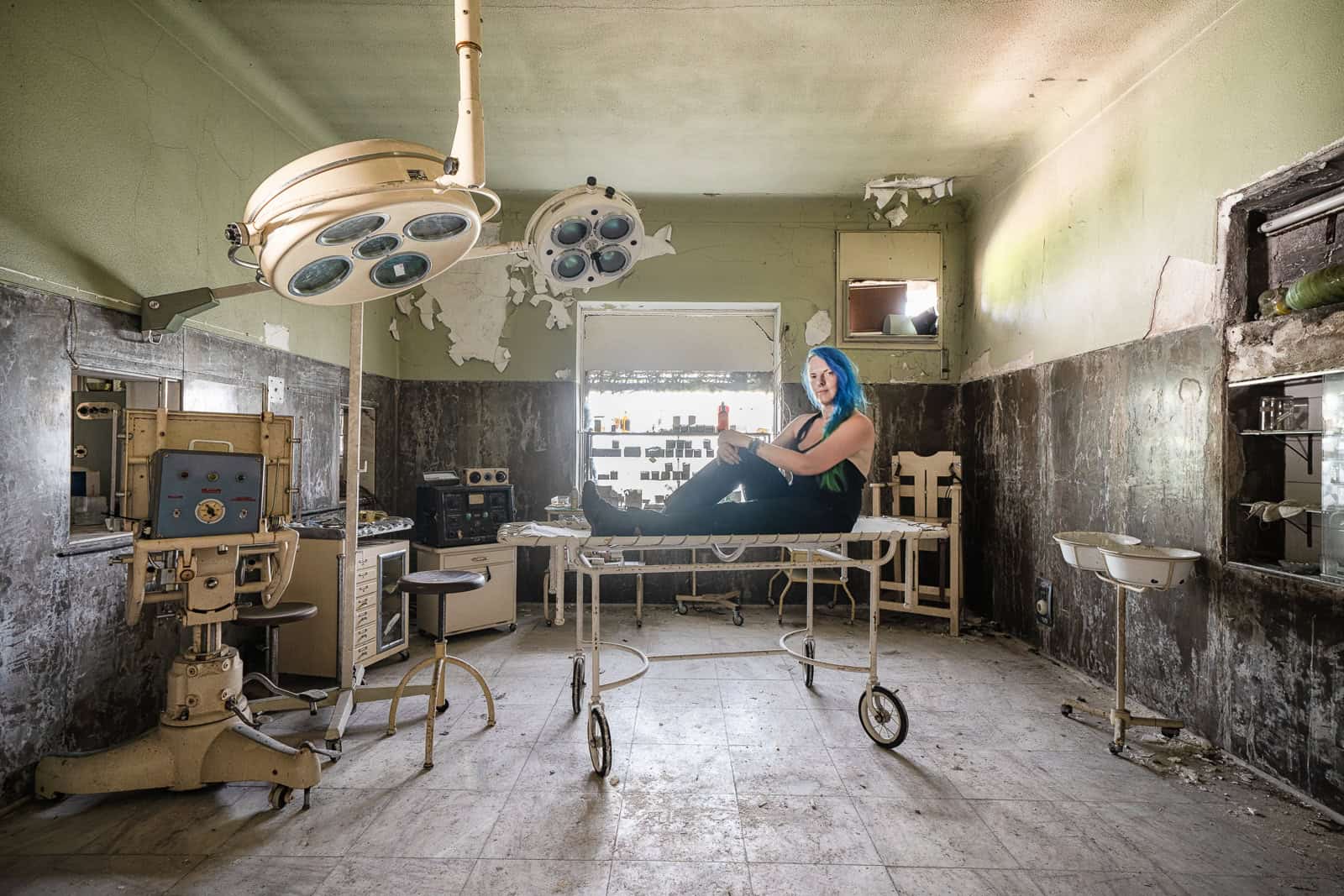 Every trip needs a beacon, that spot that captures my interest enough to begin the road trip plan. On this occasion, a wonderfully creepy atmospheric clinic often called “The Horror Hospital”. This small town clinic and surgery closed down many years ago and stands frozen in time, filled with curious treasures to photograph. The main attraction, undoubtedly, was the upper-floor surgery. This room is well-preserved with operating lights and a plethora of medical equipment. Bottles of medicines and boxes of medical supplies still lined the shelves, making for fascinating detail photos.