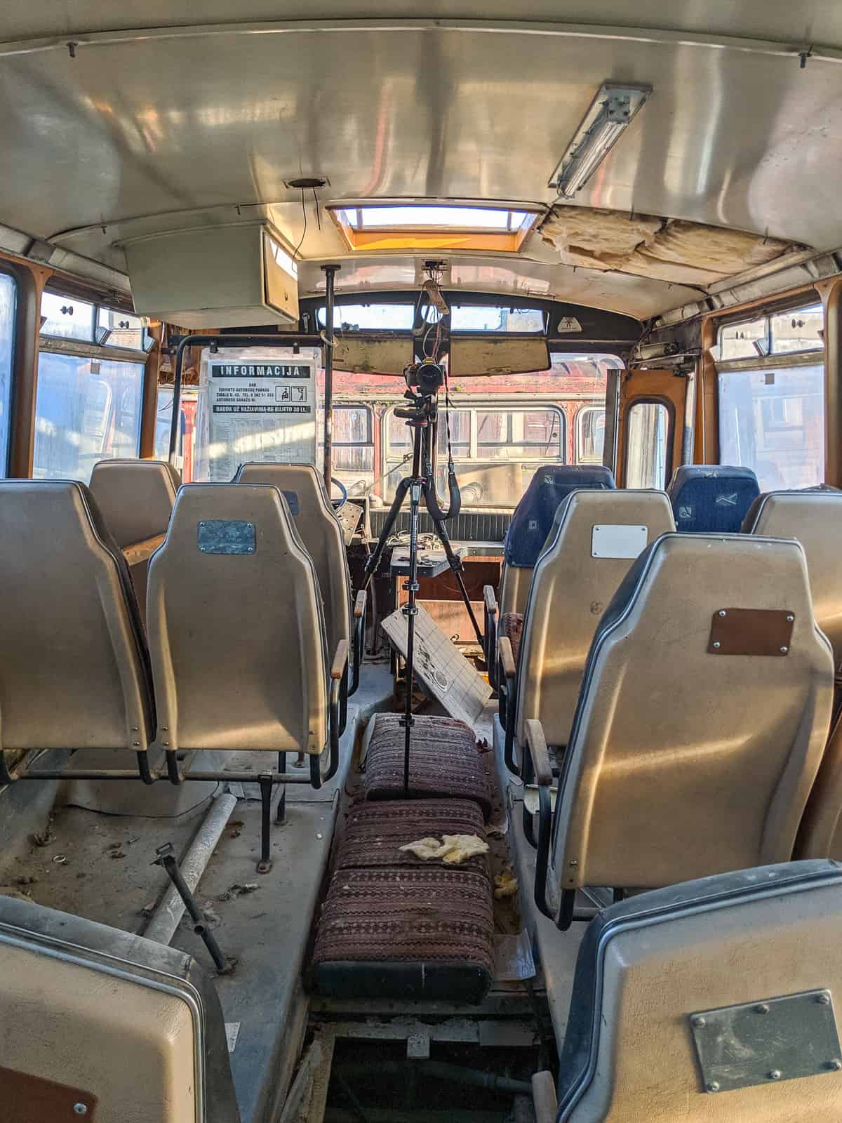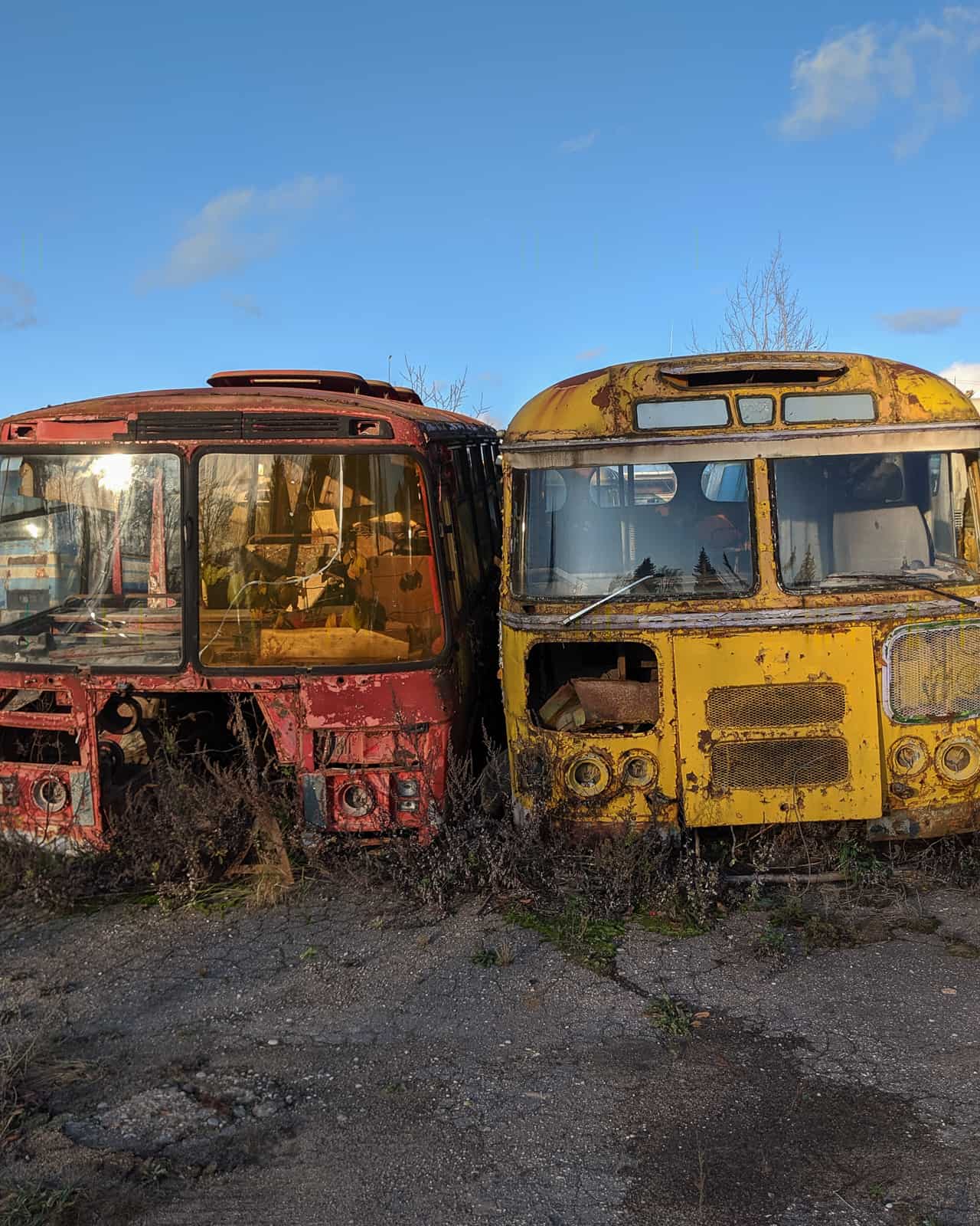 One of the final locations of our trip was a bus depot with a fantastic selection of abandoned Soviet-era buses. These were a polychrome of colours; red, yellow and blue. All rusting, and all with peeling paint.