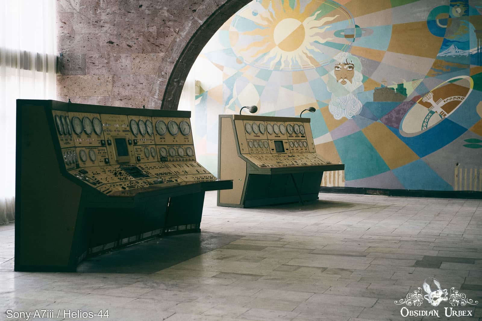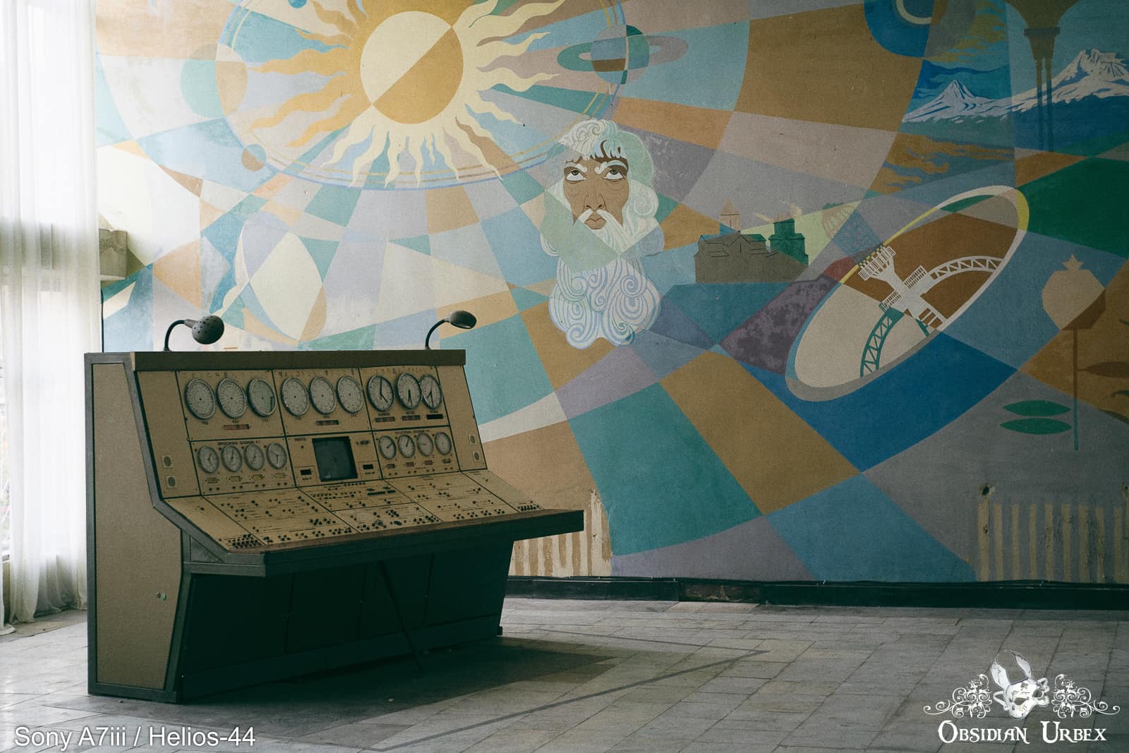 Two: The shot with the two ?desks? with dials and the mural in the background, presumably some control station for astronomy or rockets or something. It’s a shot that is totally unfamiliar, stark and abandoned yet dominated by the fascinating mural.