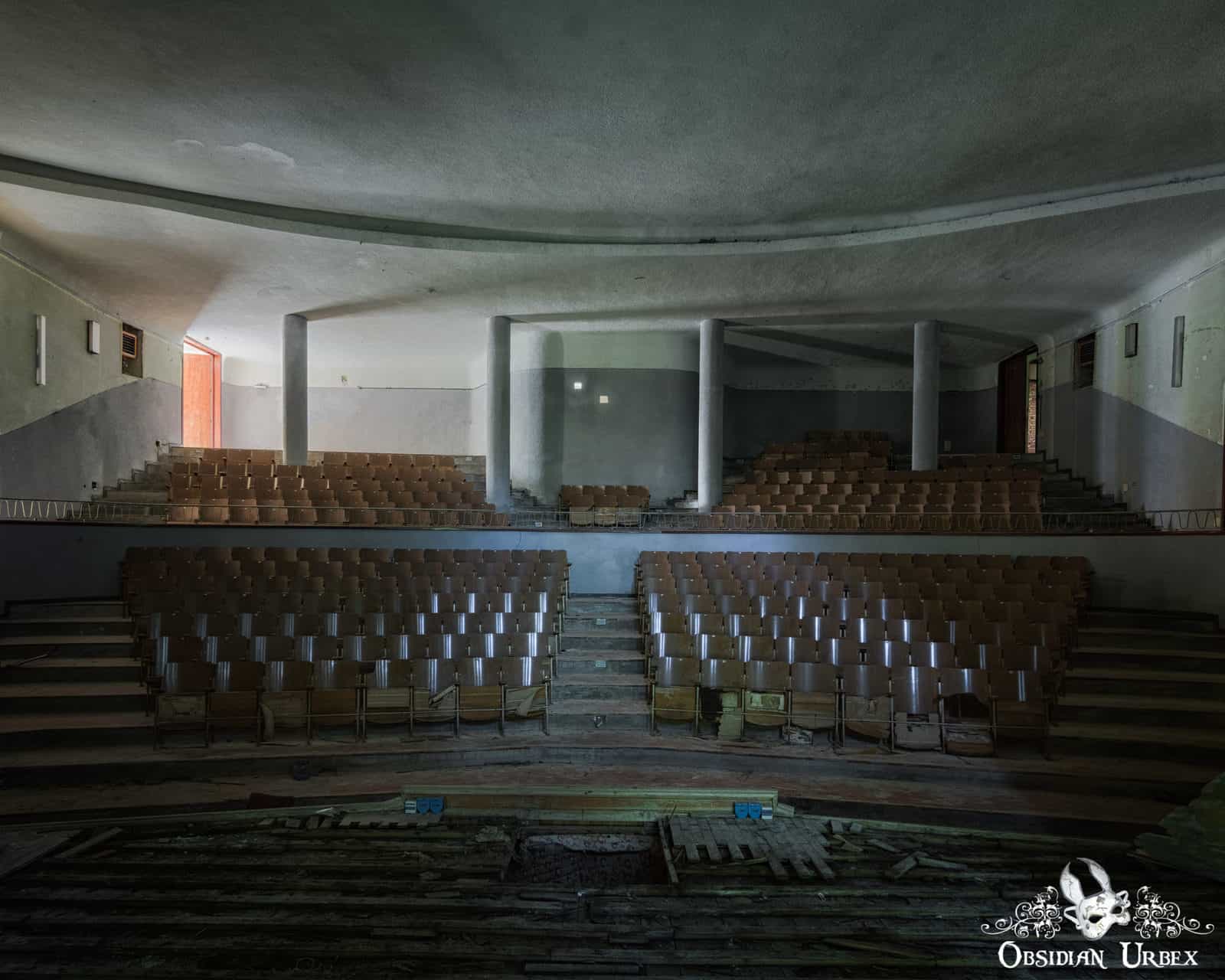 Additionally, there is also a large abandoned auditorium at the Dark Music School. The wooden floor of the stage has been mostly removed. In order to reach the centre stage, you must walk across the beams which would have supported the now-missing floor. The theatre has retained the original folding chairs.