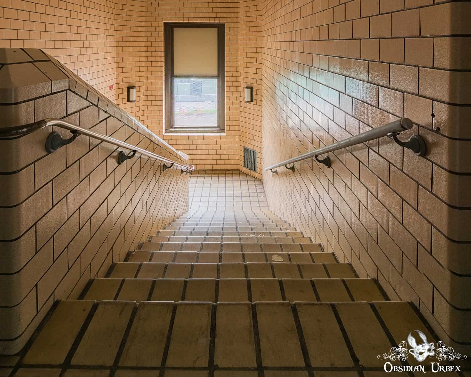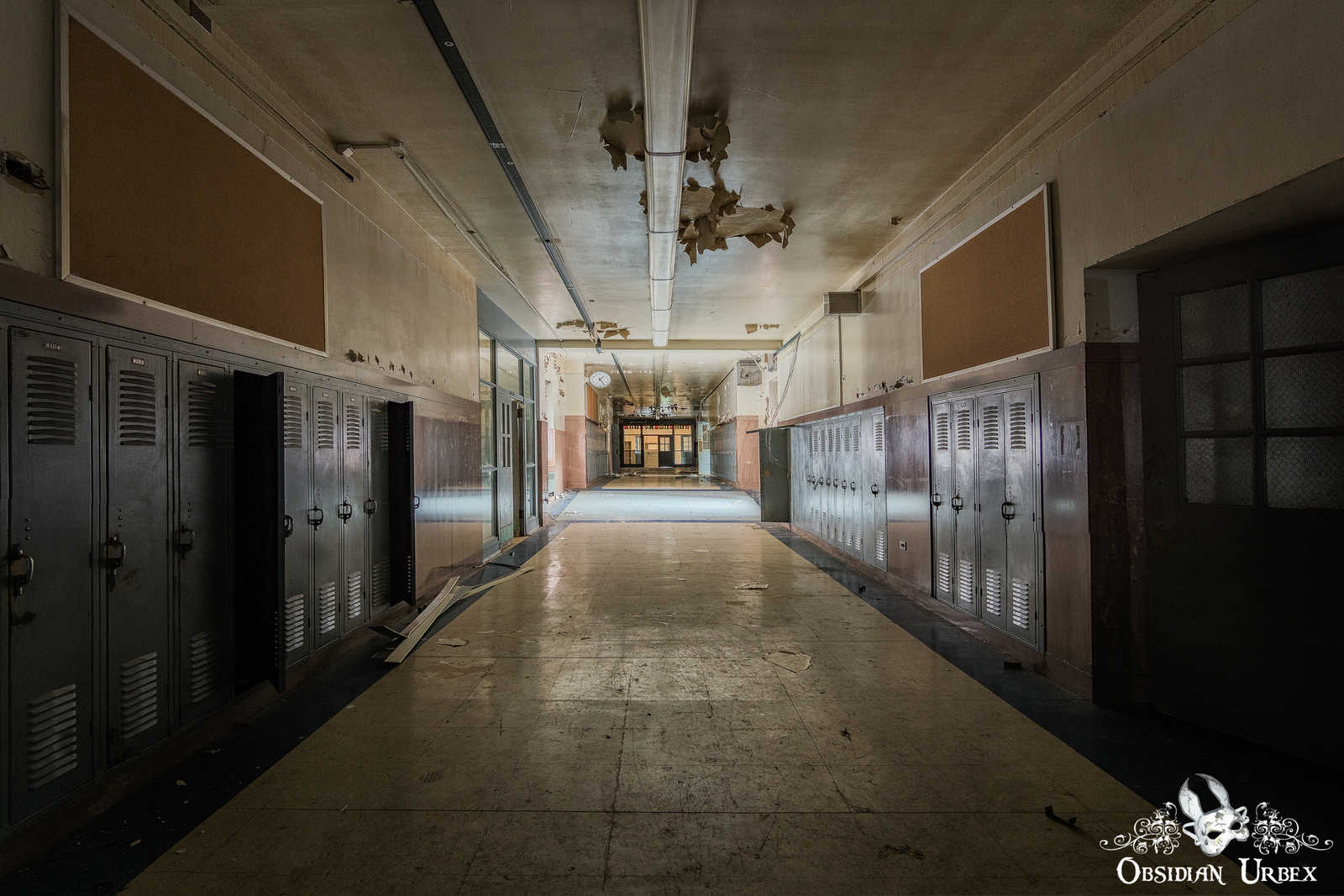 The school is remarkably well-preserved, and almost entirely free of graffiti. There are many long, dark corridors lined with grey or blue lockers. Numerous classrooms lead off from these corridors, most are bare and relatively unphotogenic. On the lower floors, peeling paint hangs from the ceilings and lays scattered on the