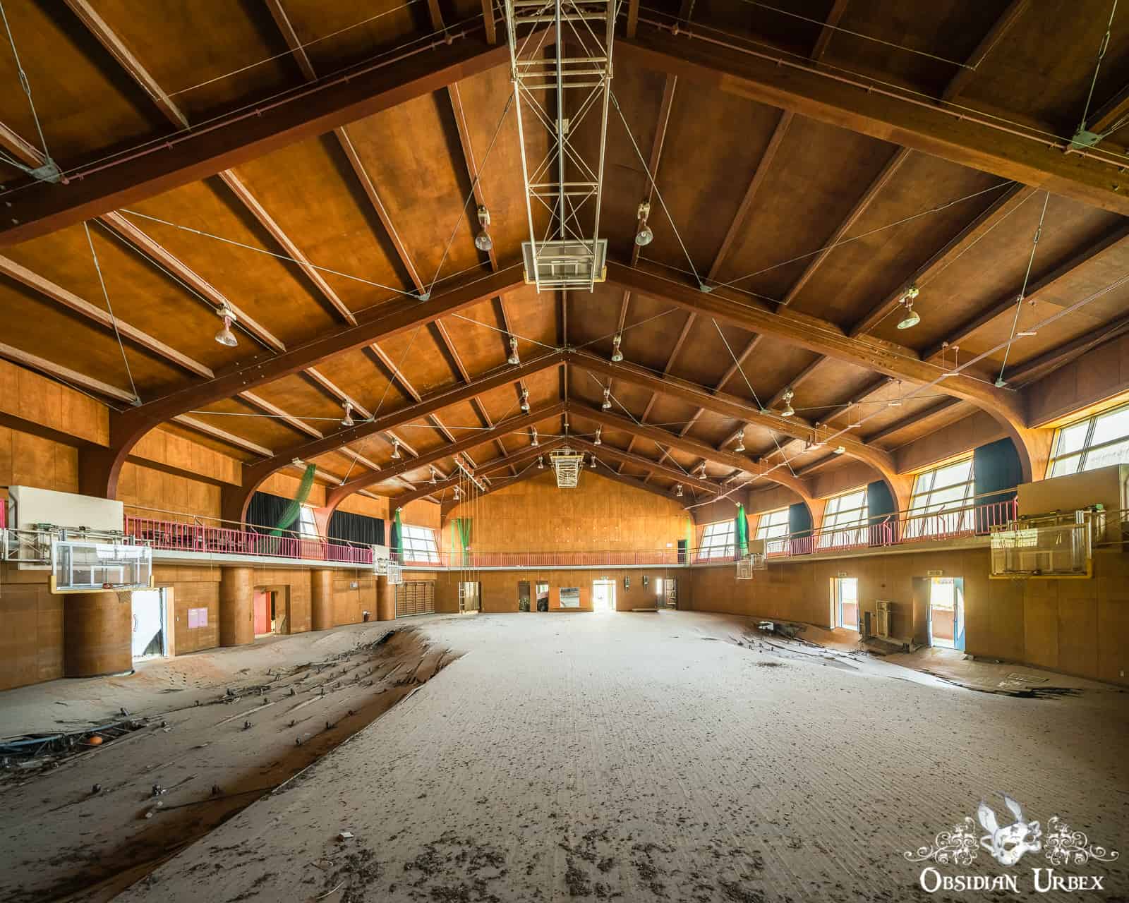 The gymnasium ceiling design is reminiscent of the bow of a boat. This is reflecting the strong maritime industry of the town. Reports state the tsunami waters reached the very top of the gym walls. The floor has partially collapsed due to the water damage.