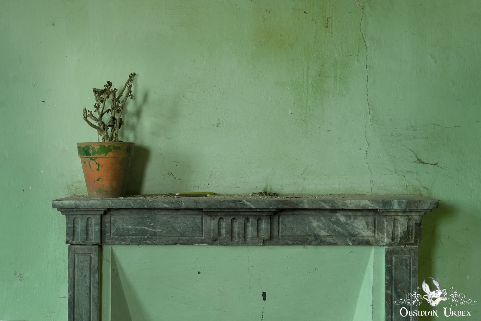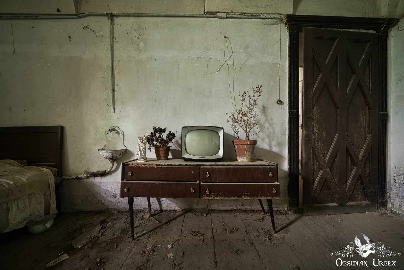 Eventually, my wandering feet and peeping eyes were rewarded. Yes, Globe School did have more to offer! I opened a door that was precariously hanging from only one of its hinges. Inside was a bedroom, the living area of the teacher. A neatly made bed, and a long table on which stand a delightfully retro TV and some crispy-textured dead plants. Additionally, the central blue staircase offered a nice photo or two (requiring a bit of squashing into a corner to make the shot work, but I was happy with the result in the end). A small kitchen, a corridor, and a side room with a desk against a window also made interesting additional photos to the main classroom.