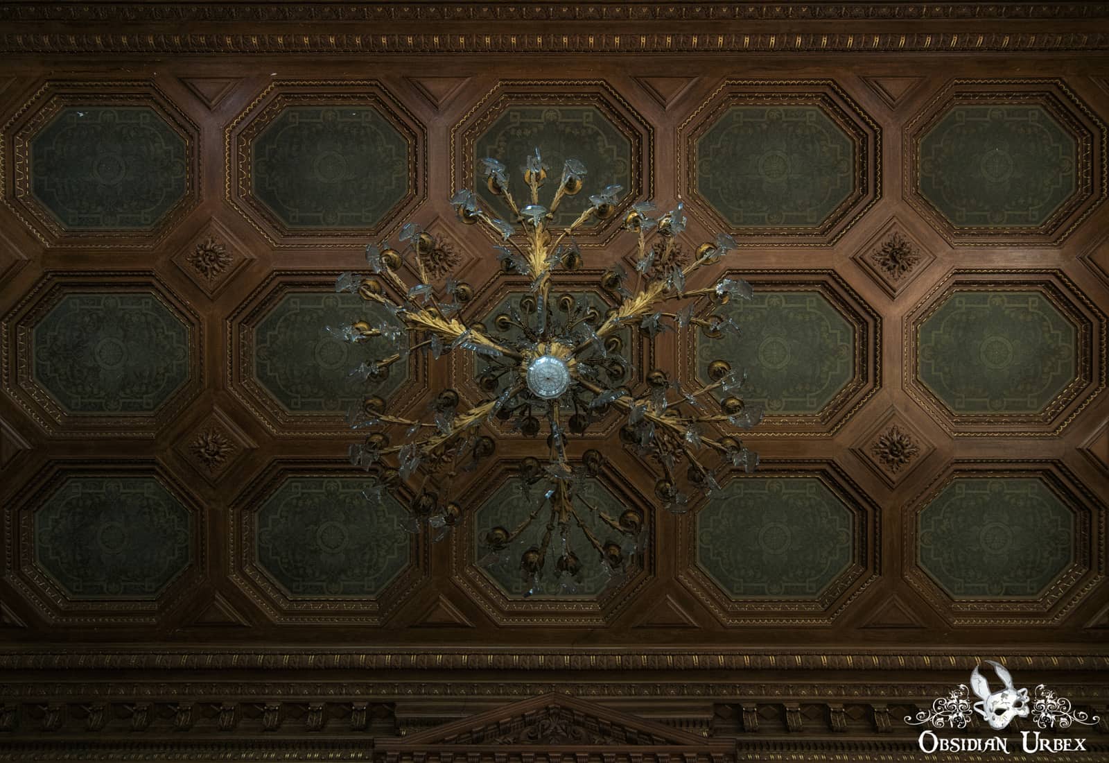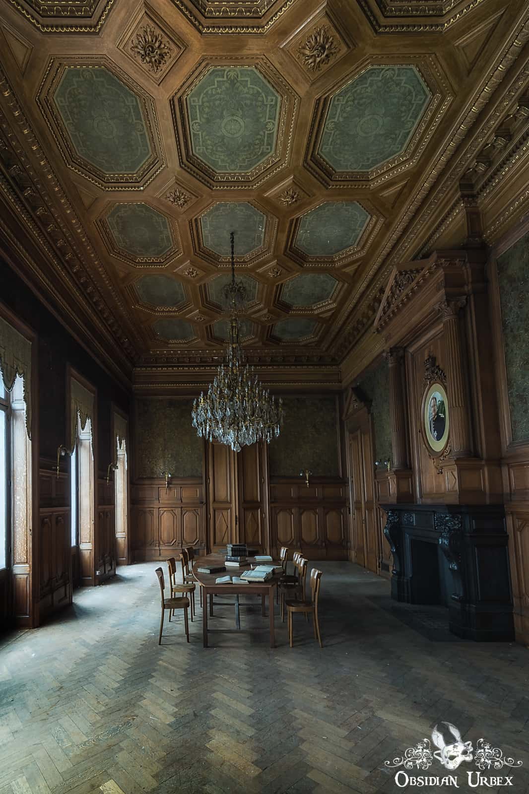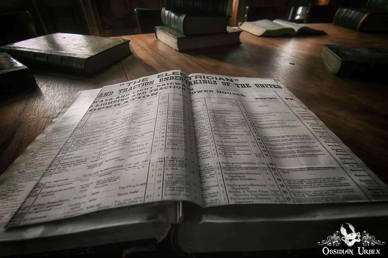 By far the best building, is the library and study rooms. Sadly the books were in the process of being removed at the time of our visit, and were piled up in front of an old fire-place and at the sides of the corridors. The large study room houses a gold coloured ornate chandelier, hanging above a large solid wood table complete with chairs. A portrait still hangs on the wall above the fireplace. The books are mainly electrical engineering books, most of which are certainly rare editions. The walls and ceiling are dark wood with detailed engravings, with contrasting rich dark green inserts.