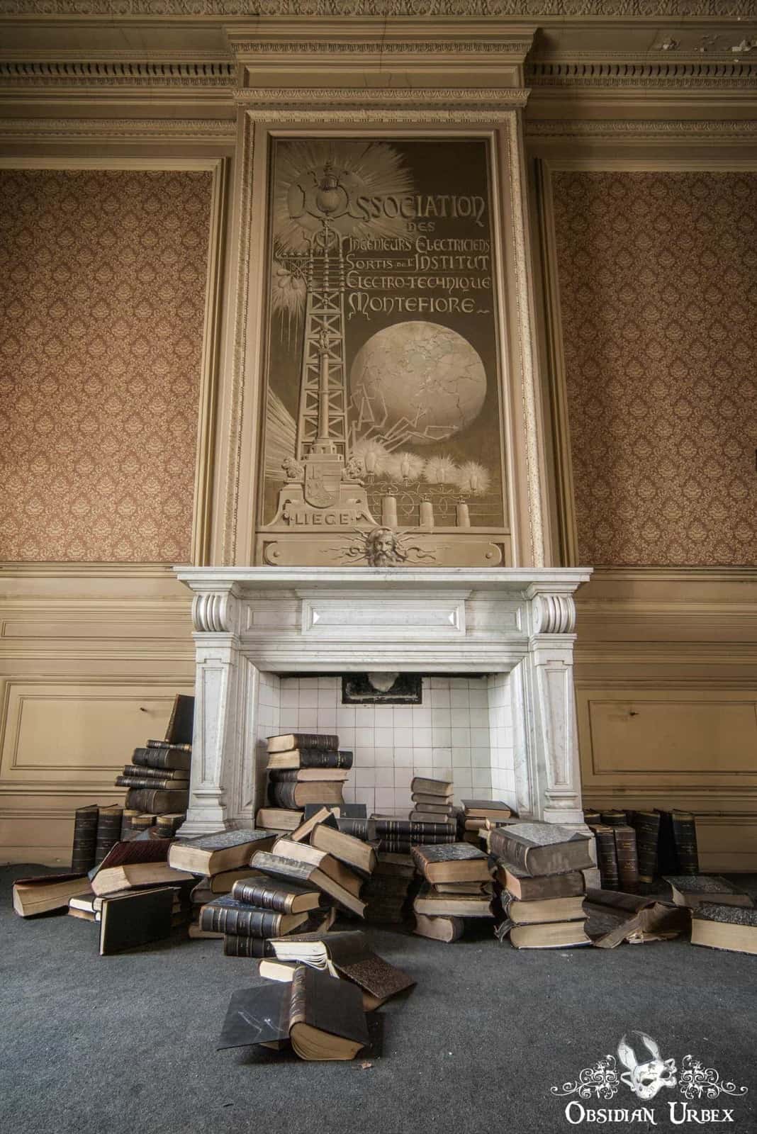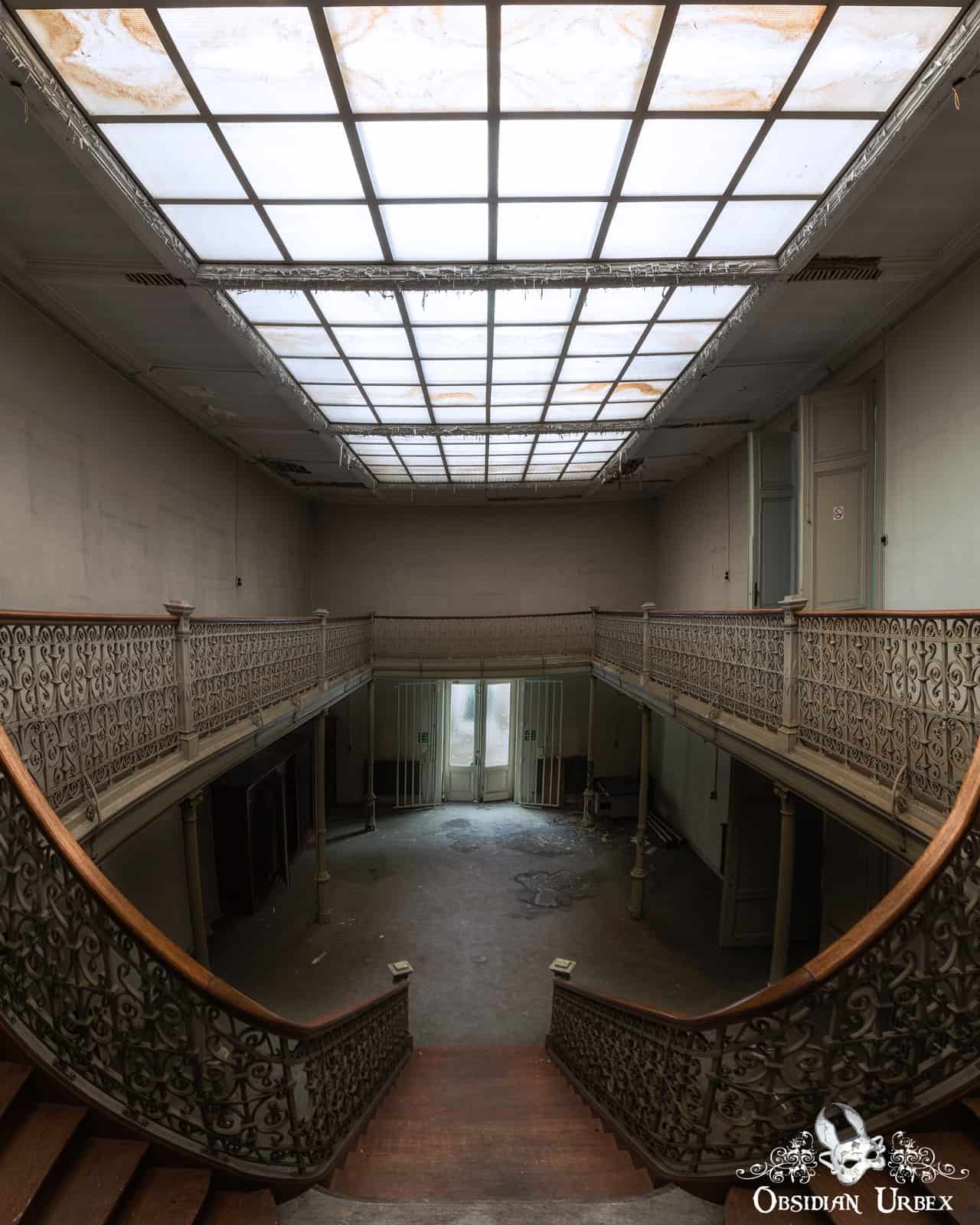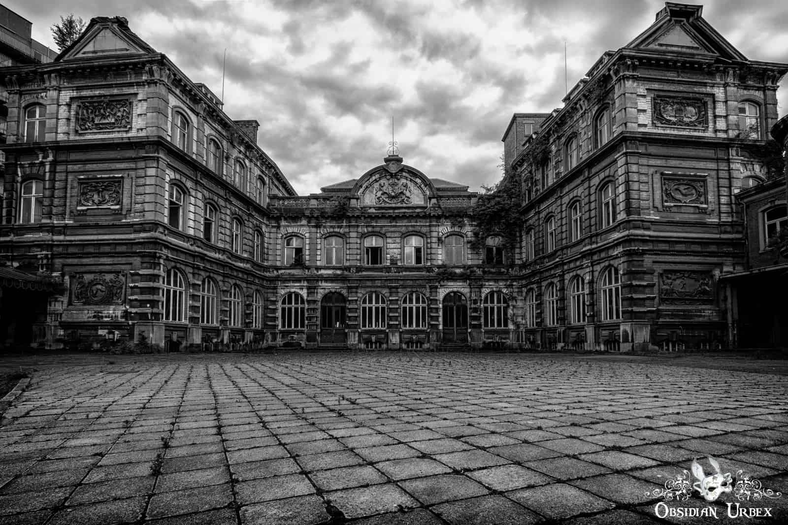 Pritzker Fac (sometimes spelt Pritzer Fac) is an abandoned former campus of a prominent University in Belgium. These buildings have a rich history, originally being used for sciences and later electrical engineering and architecture. Several world-renowned experts in their fields were trained here. The buildings themselves date back to the late 1800’s. These buildings have been abandoned for some years, and the old teaching block is suffering from vandalism and water infiltration from damaged roofing. The teaching block is externally the most interesting, being crescent-shaped and decorated with elaborate carvings. The central courtyard originally had trees, but these have sadly now been removed.