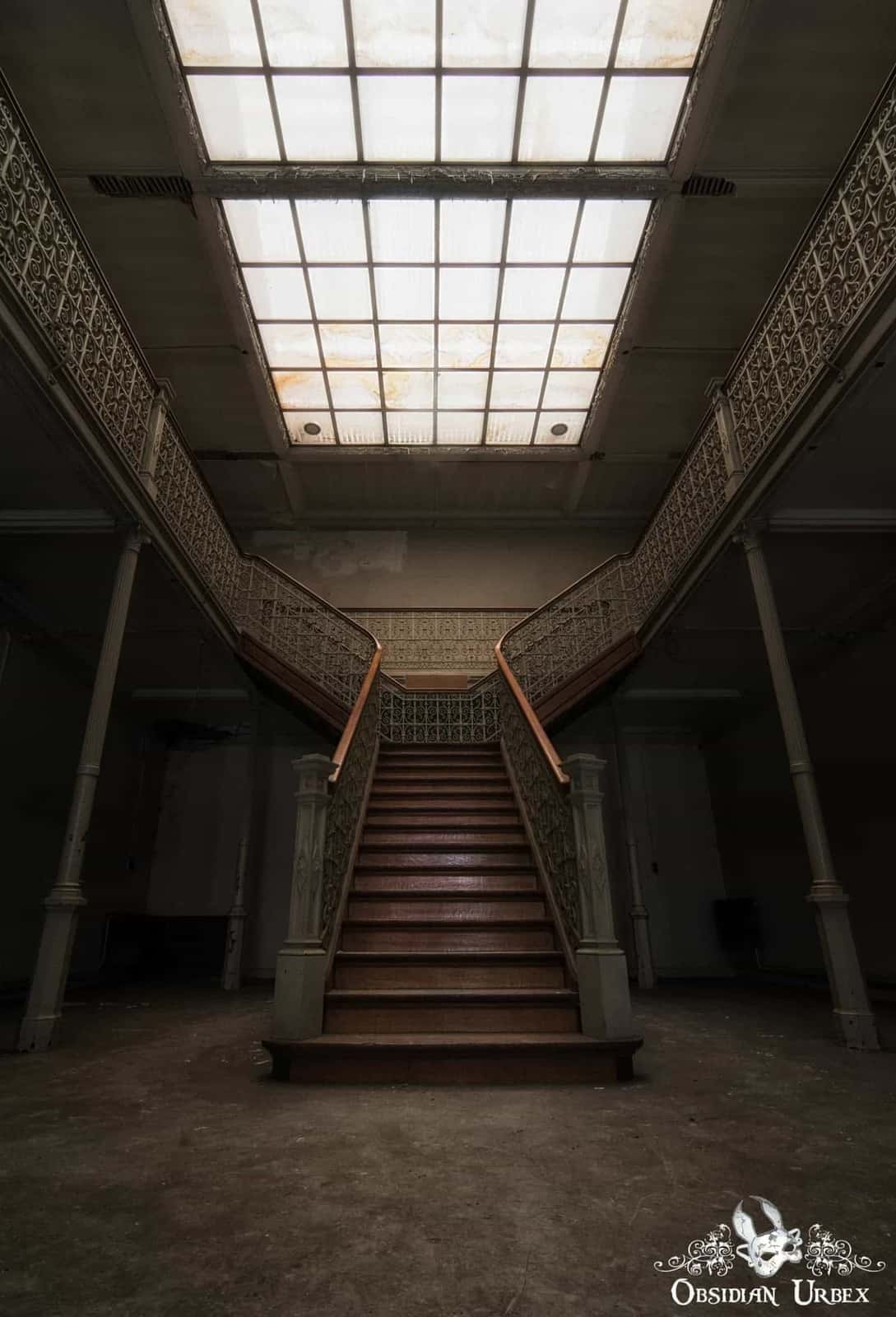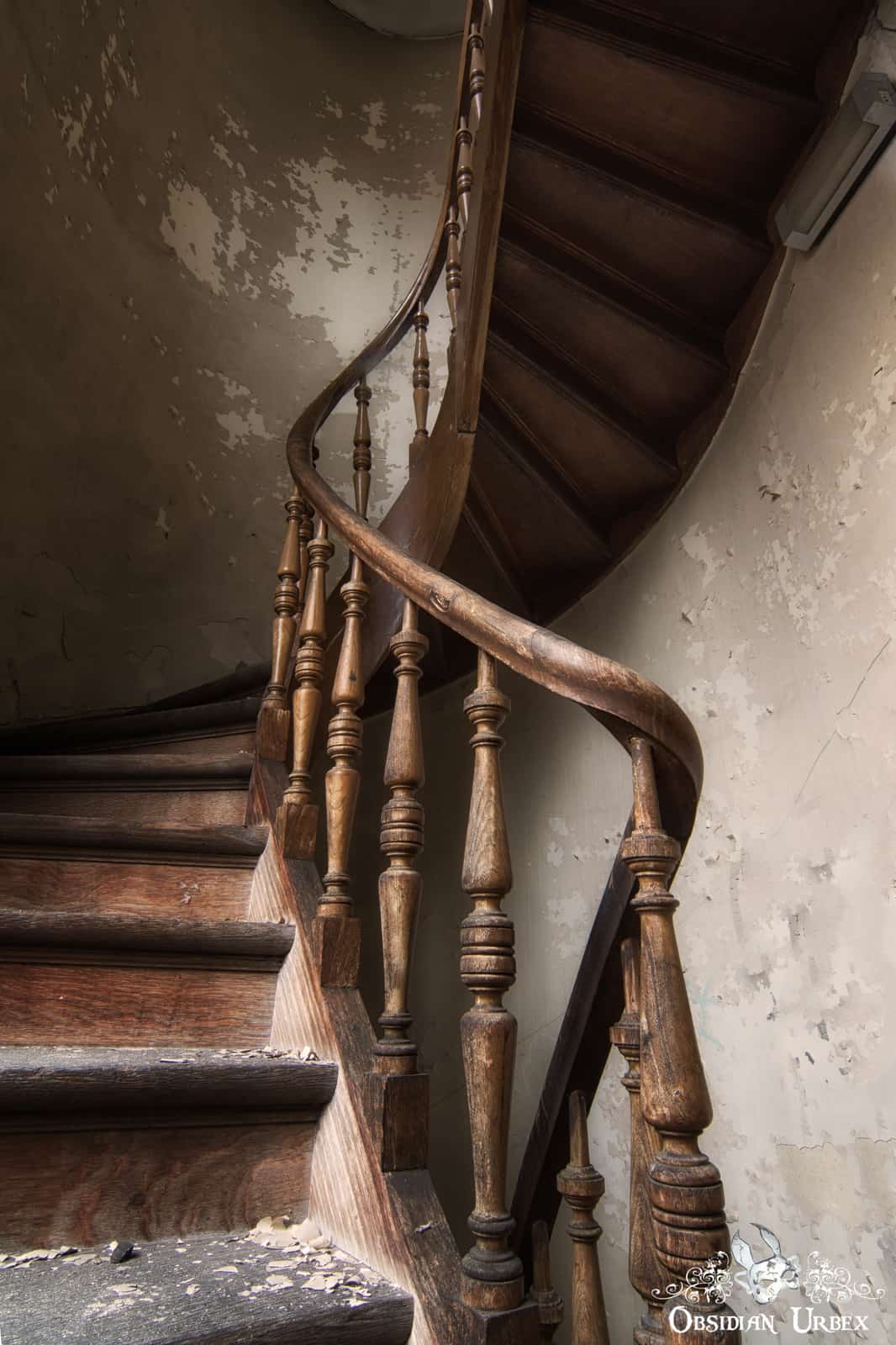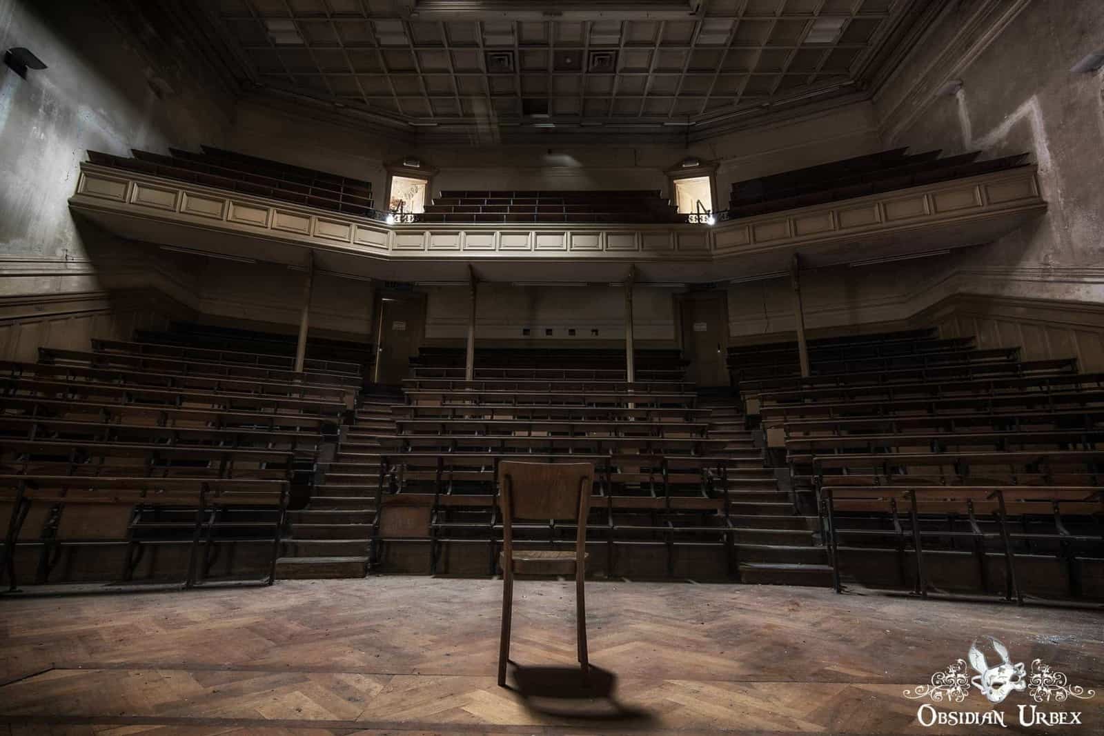Tucked behind an unassuming side door, in a building that is less externally grand, some interesting rooms can still be found. Curiously, these are less damaged. The entrance foyer has nice wooden walls with coat hooks. Two wooden spiral staircases lead up to the upper gallery of the lecture theatre. The theatre still has its wooden benches, many with the scribbled graffiti of decades of students of Pritzker Fac. Another side room features a large impressive staircase leading to a mezzanine floor.