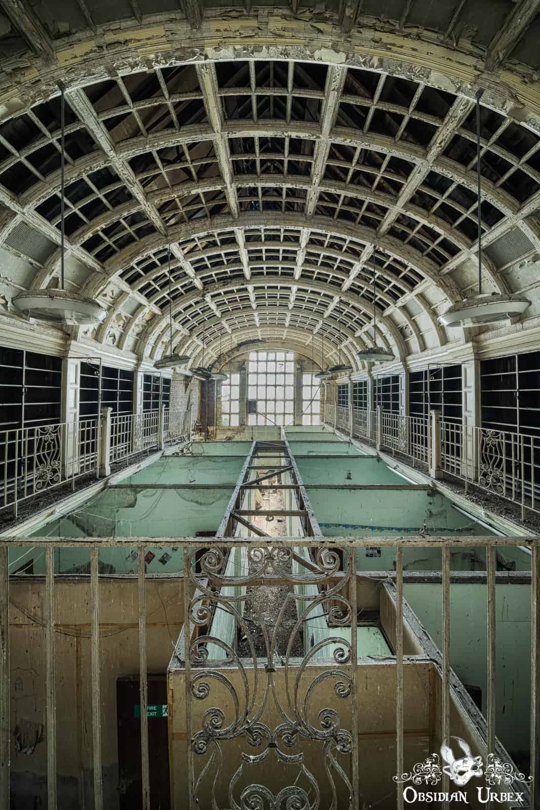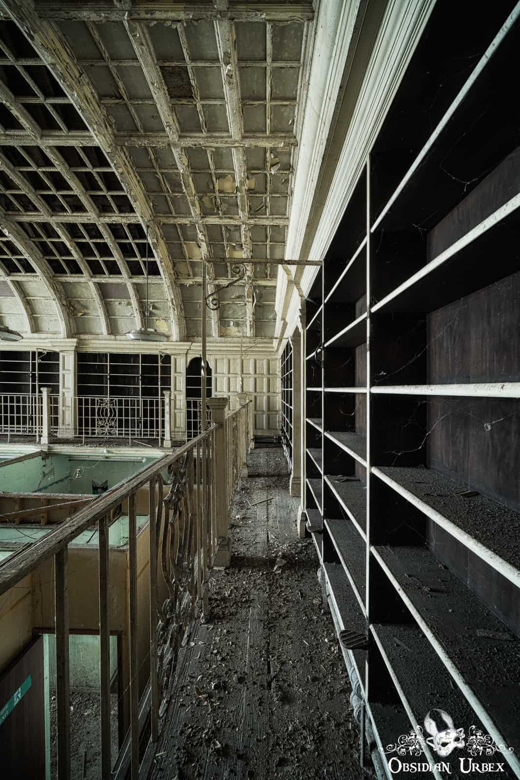 Decorative iron railings encircle the balcony level of the huge reading room. Bookcases line the walls (sadly, long empty). Glass panels line the long barrel roof, or they did at one time, but these are now long gone. Only empty frames remain. Interesting pendant lights with domed lampshades hang from the roof. There are eight of these lights in total. In recent years, part of the balcony has collapsed due to progressive decay. As a result two bookcases fell to the ground, leaving exposed brickwork upstairs where they once stood.