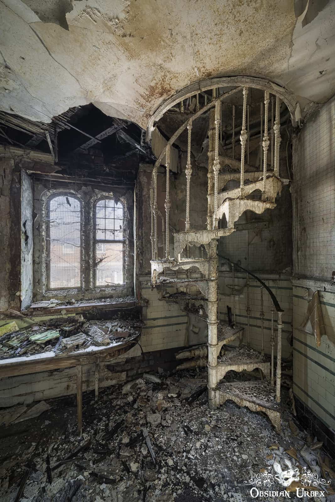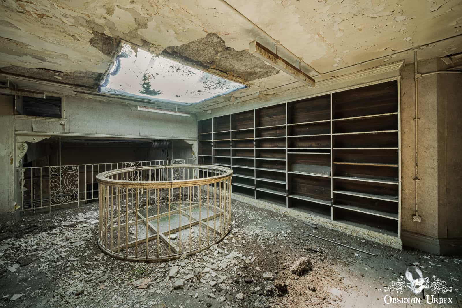 The entrance foyer features circular domed skylights, with a rusted spiral staircase in the corner leading up to a mezzanine flow. The main library reading hall can be accessed from this once grand foyer. Additionally, the mezzanine floor connects with the level of the library balcony level.