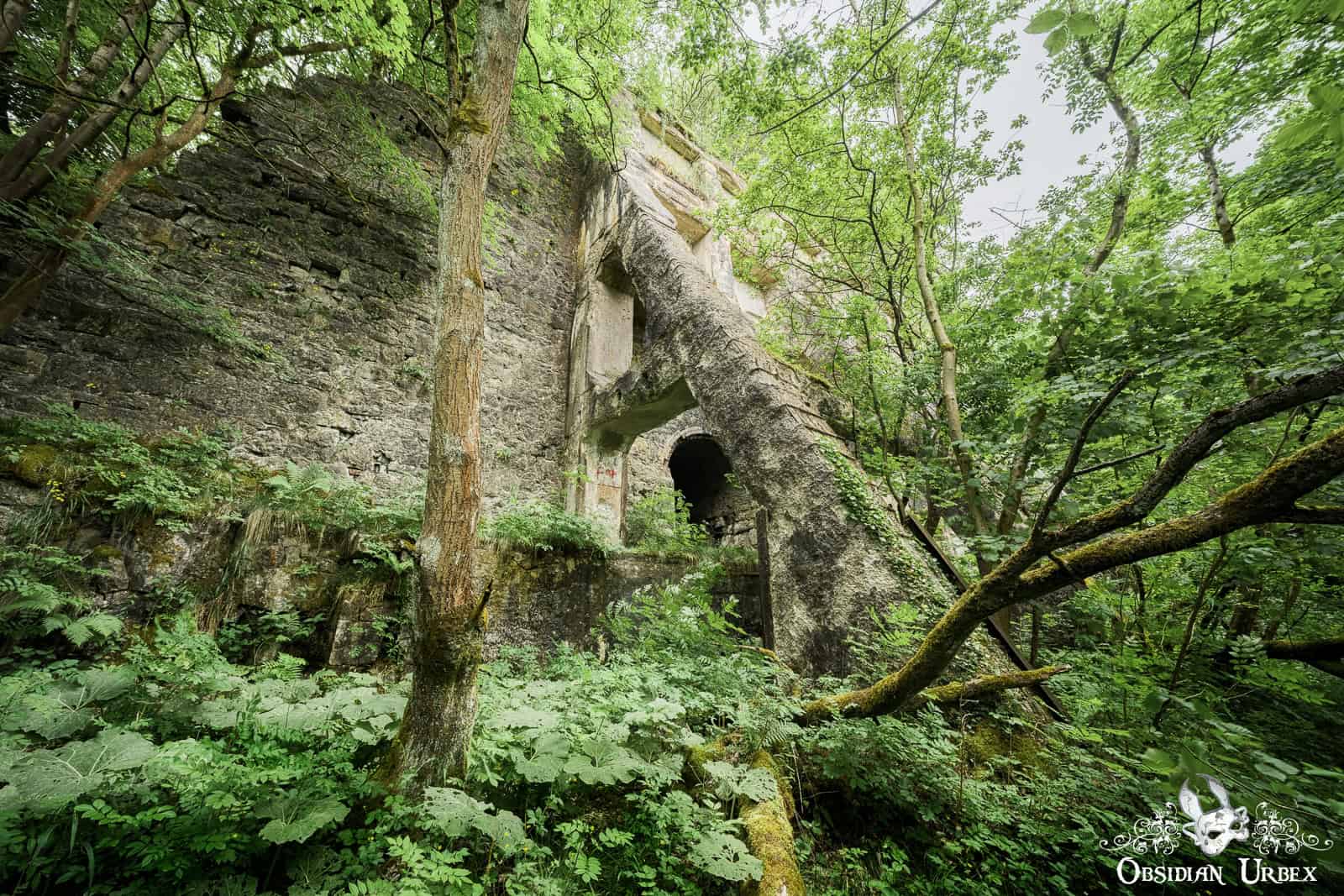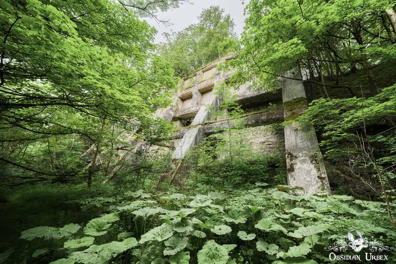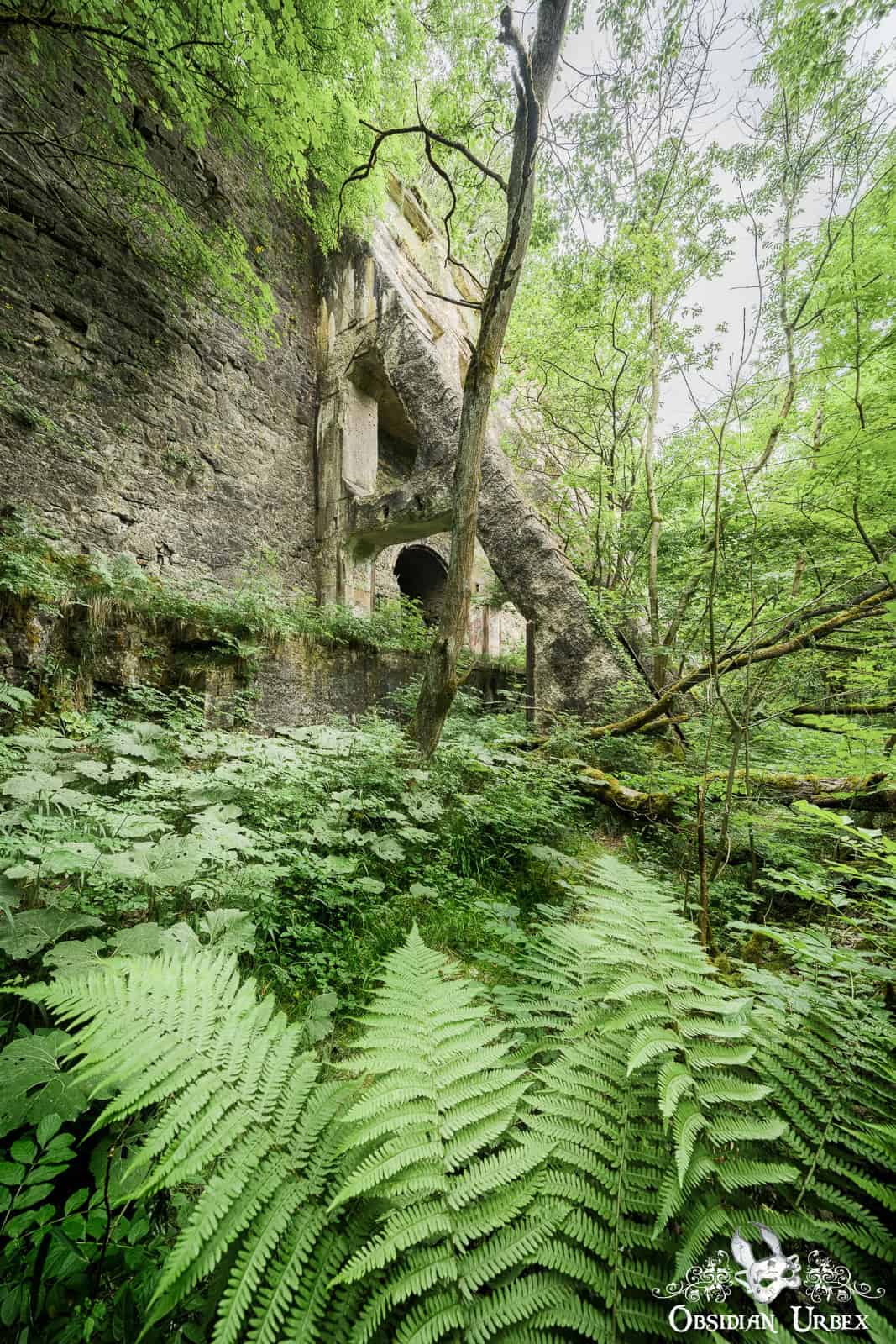 Cowdale Quarry has been abandoned for 70 years, now slowly it is being reclaimed by the forest. Its concrete structures, once designed to process limestone into industrial lime, now stand forgotten and crumbling. Tapered concrete walls rise out of the overgrowth, reaching dramatically up above the treeline.