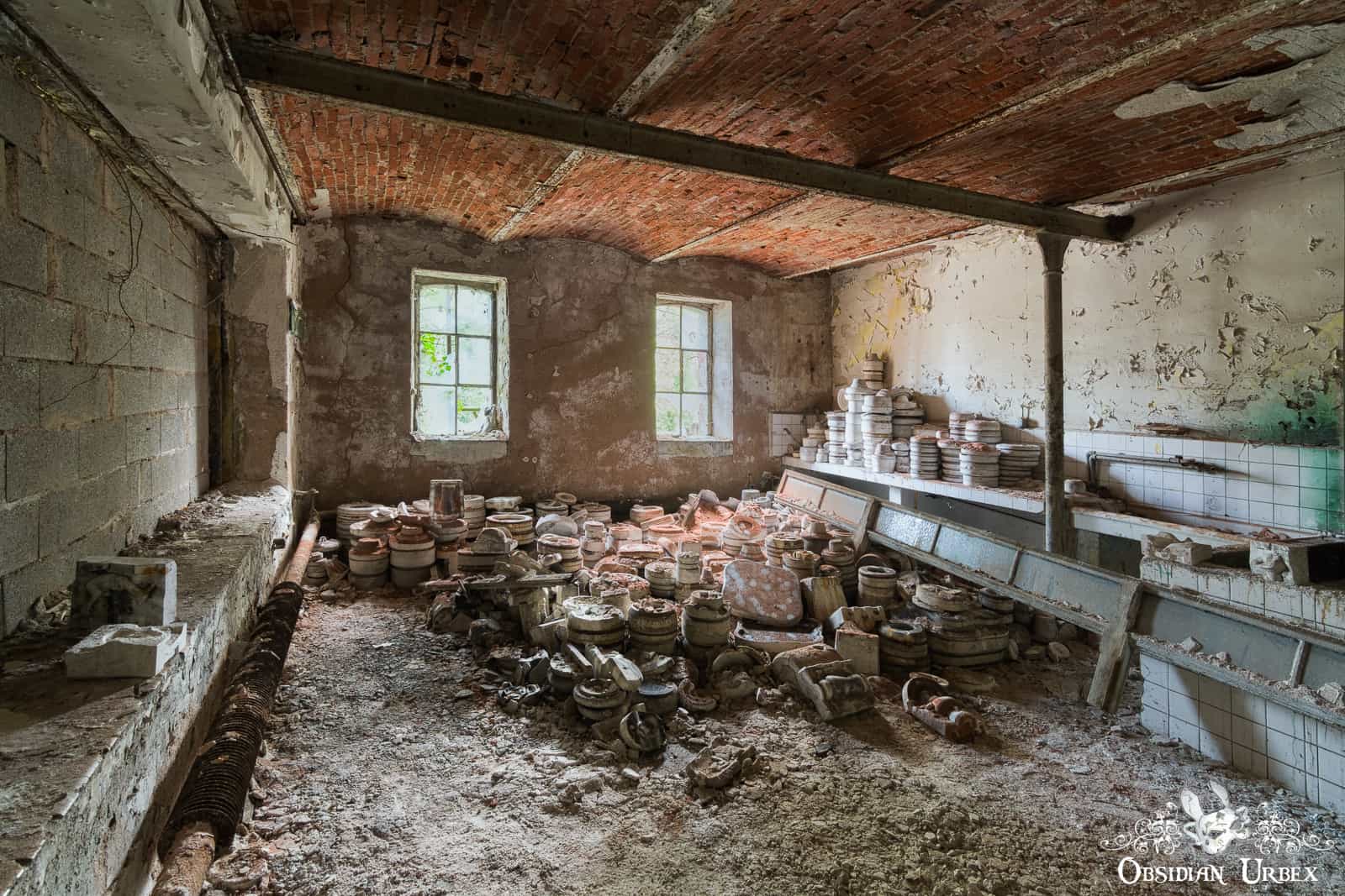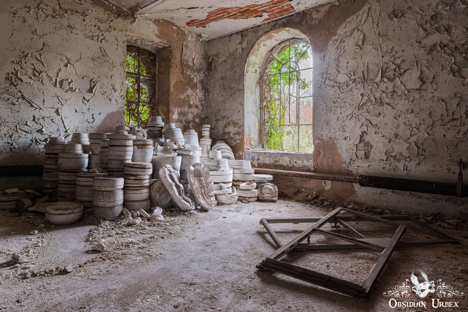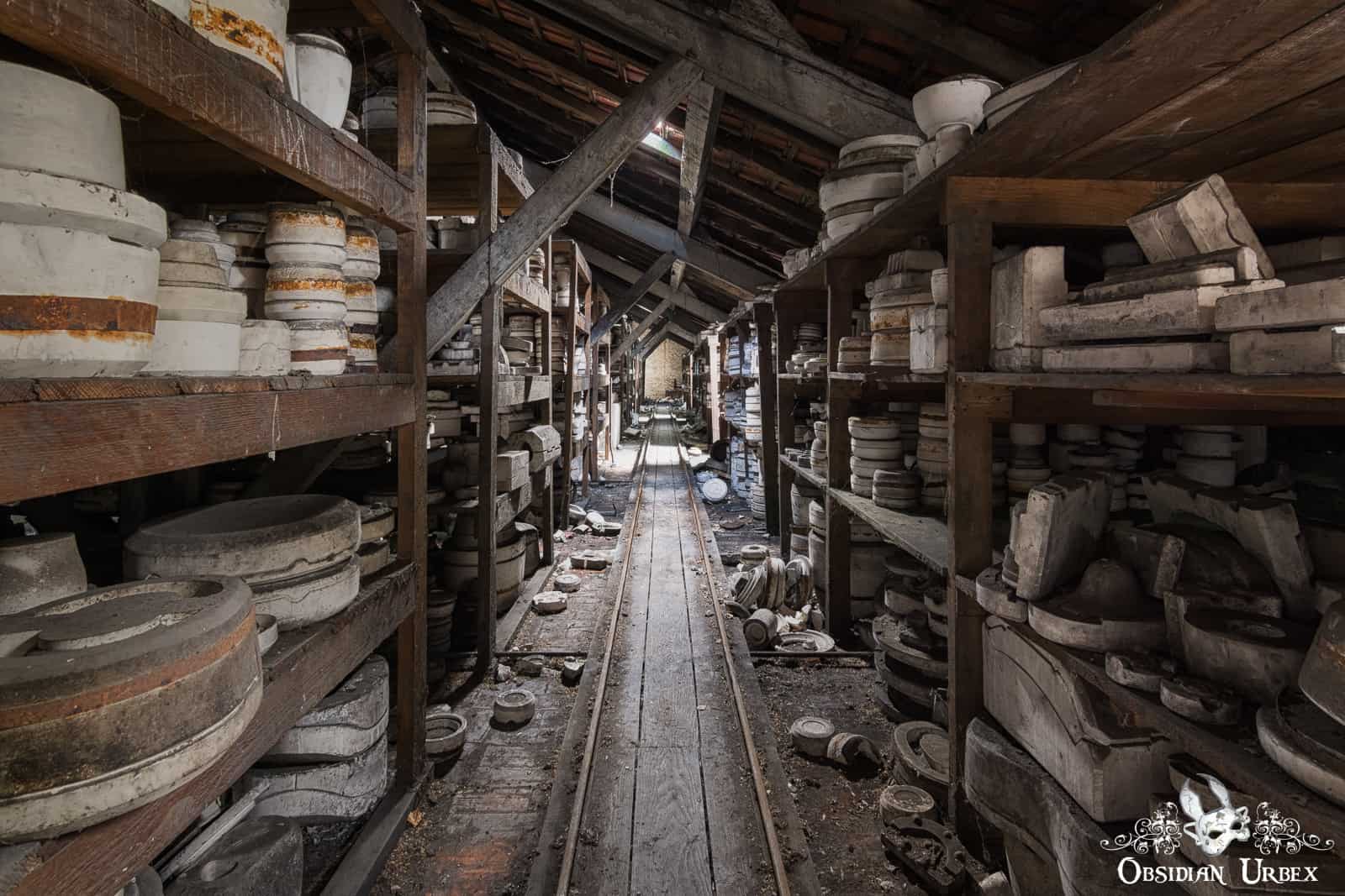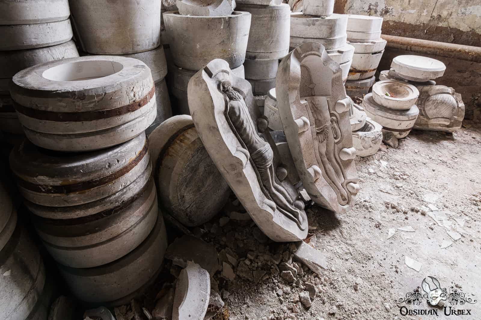 In another area of Faïencerie S, there is a storage area without wooden racking. These rooms have piles of pottery molds, including sets featuring Jesus Christ. In one corner we find the Jesus molds artistically placed, likely a staged shot by a previous explorer/photographer.