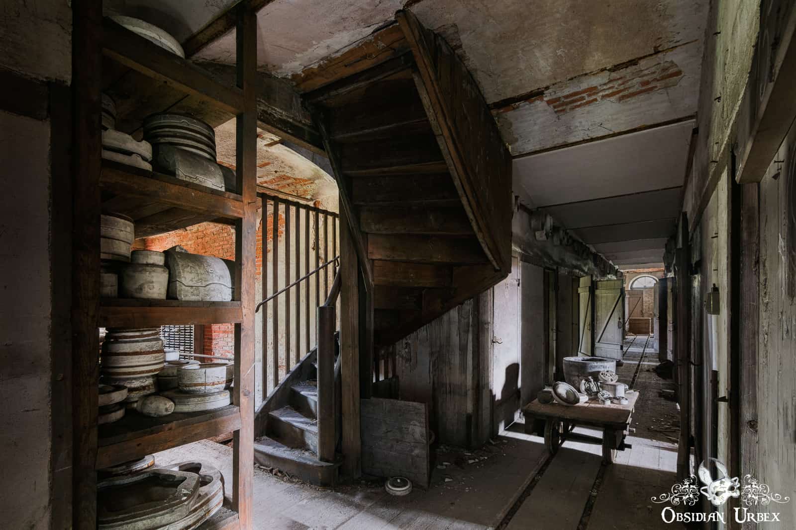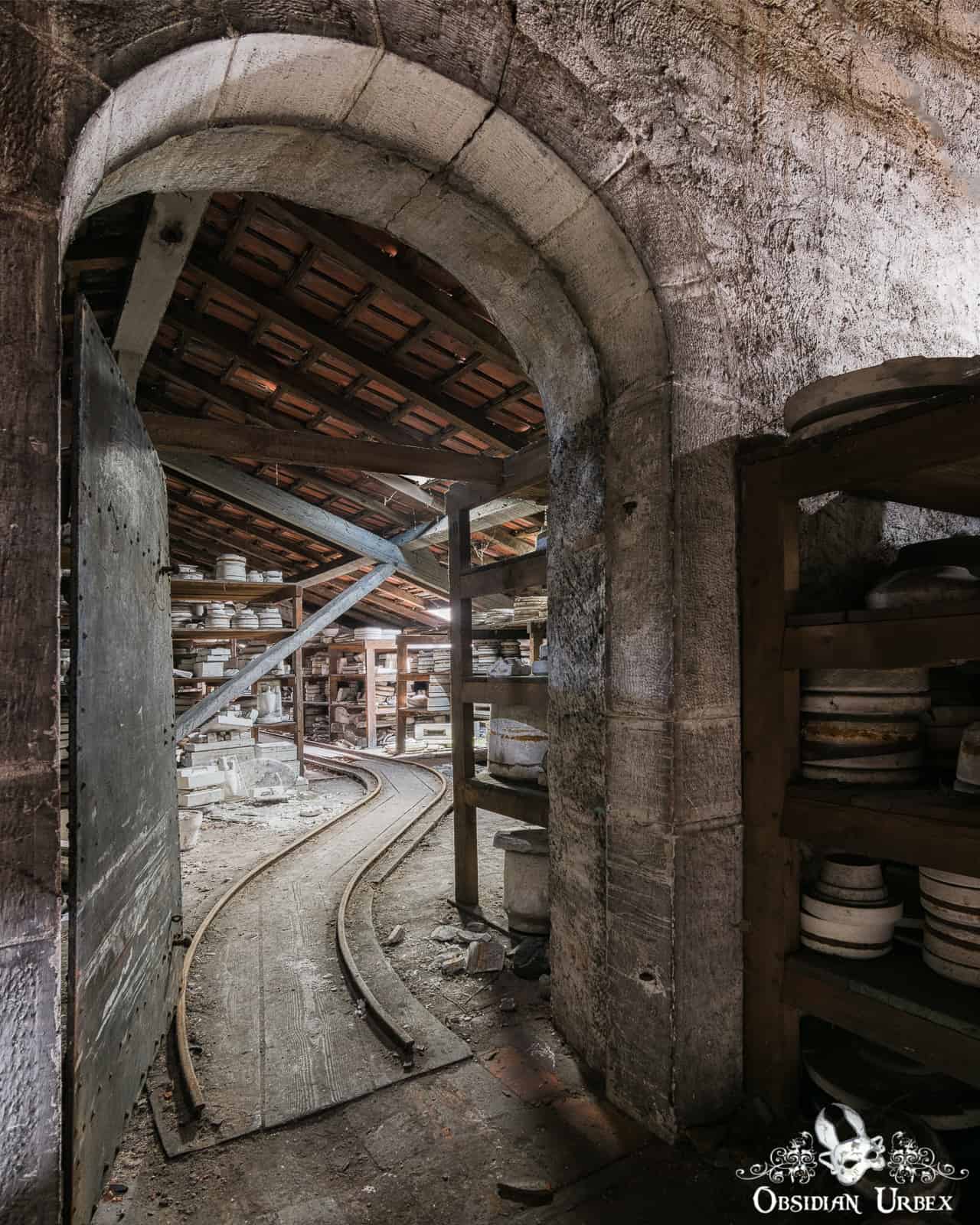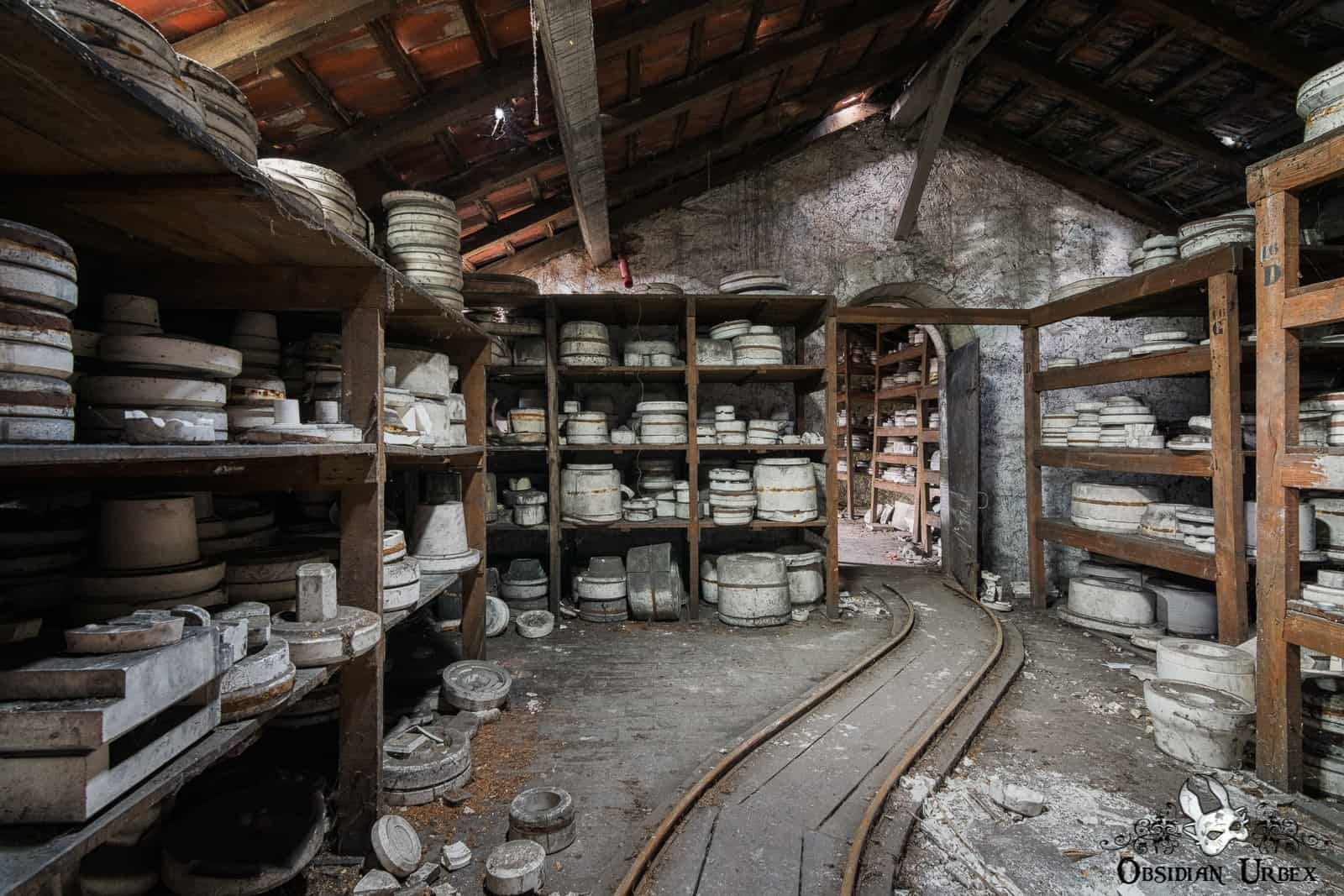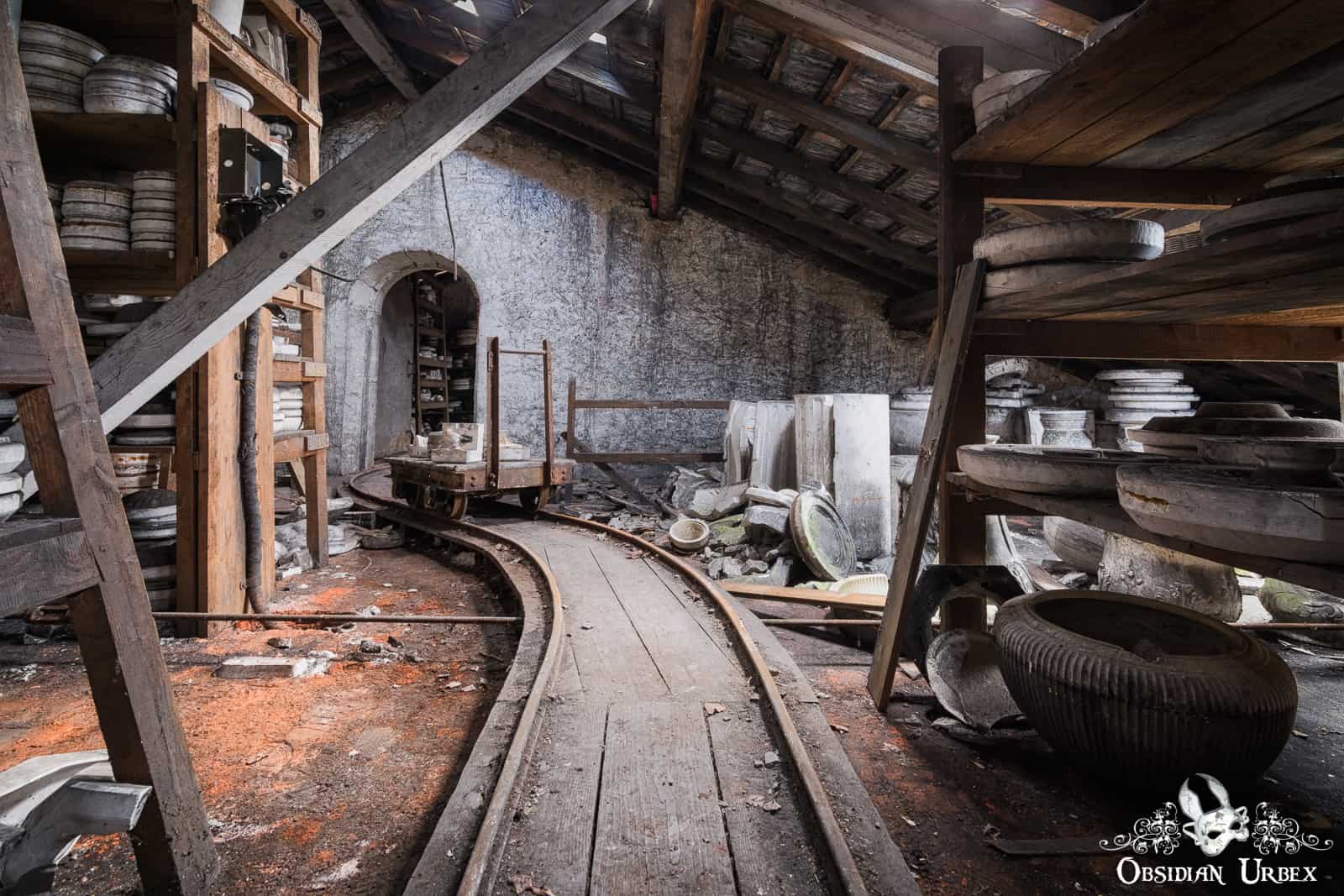 Many of the molds are heavy, so they were transported around on carts. A long rail system runs along the building, and several wooden carts still stand on the tracks. Some of these are still loaded with pottery molds.