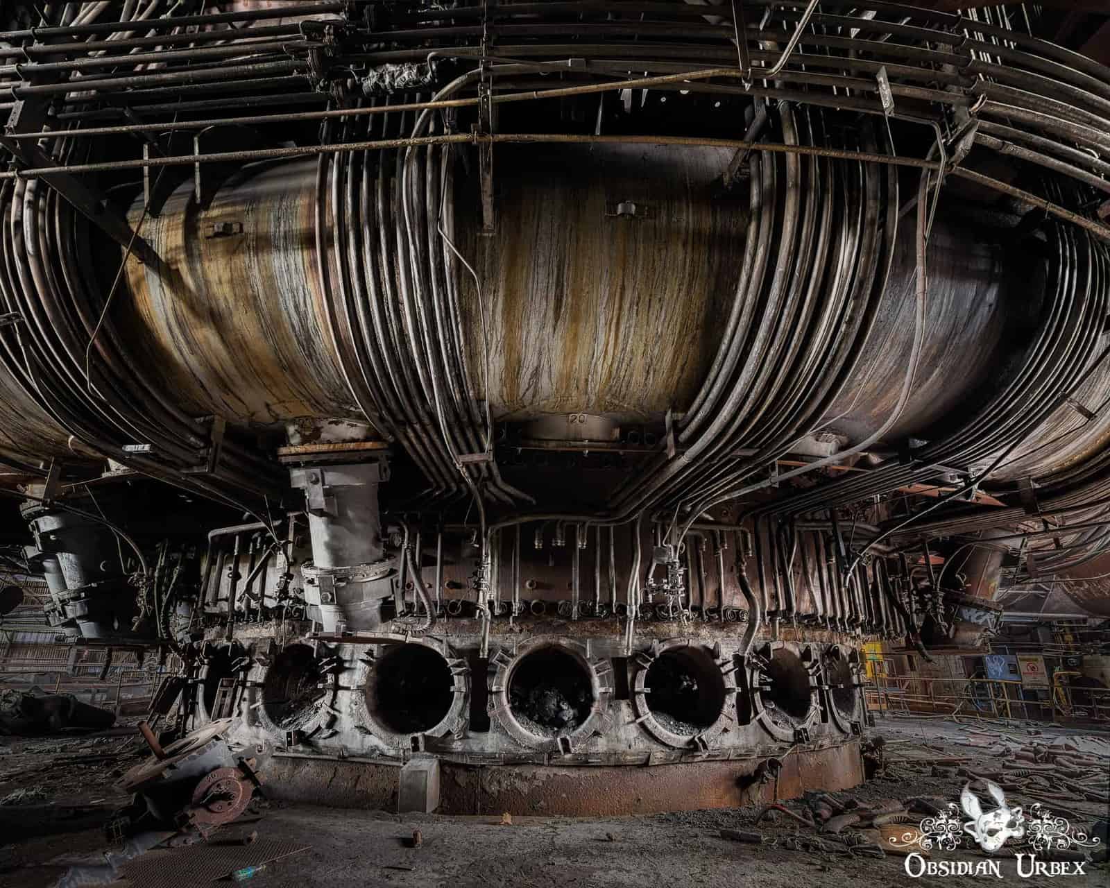 Large robotic arms would periodically open the taps at the base of the furnace, releasing the molten iron. These are shiny galvanised steel. Contrasting against the rest of the rusty machinery in HFB. There are two robotic arms at Blast Furnace No 6, each with its own operator cabin and a single simple control panel in each. Operation of the furnace was a continuous process, with the furnace running 24 hours