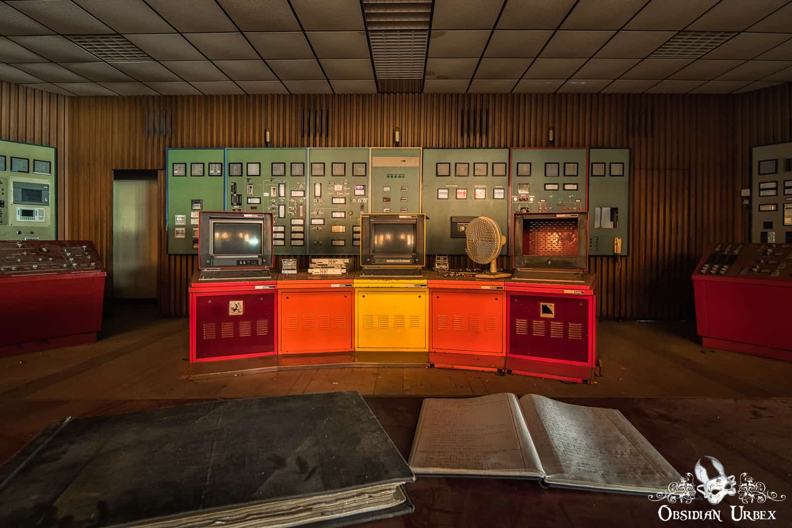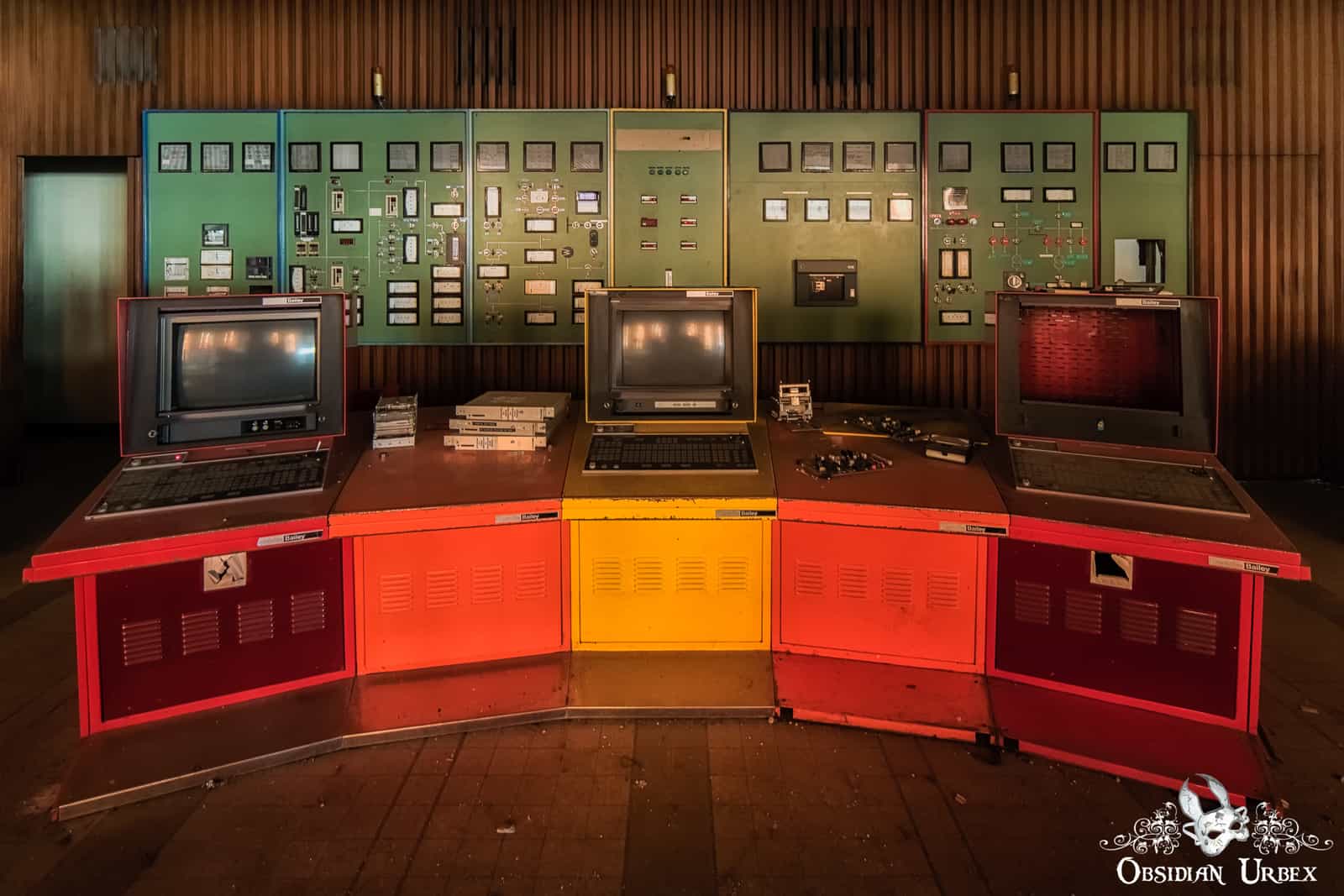 The entire power plant building is empty, apart from the near pristine control room. All turbines and machinery have been completely stripped out. Wondering through the empty halls, we did begin to think we had incorrect coordinates. Eventually, we entered the Lady in Red control room. An ominous humming noise fills this small dark room. A router is connected to one of the terminals, a green light blinks indicating active data transfer. There is a crescent-shaped red control panel on each side of the room, with more dials and switches on green wall-mounted banks. In the middle of a room, three CRT monitors sit on a red/orange/yellow desk.