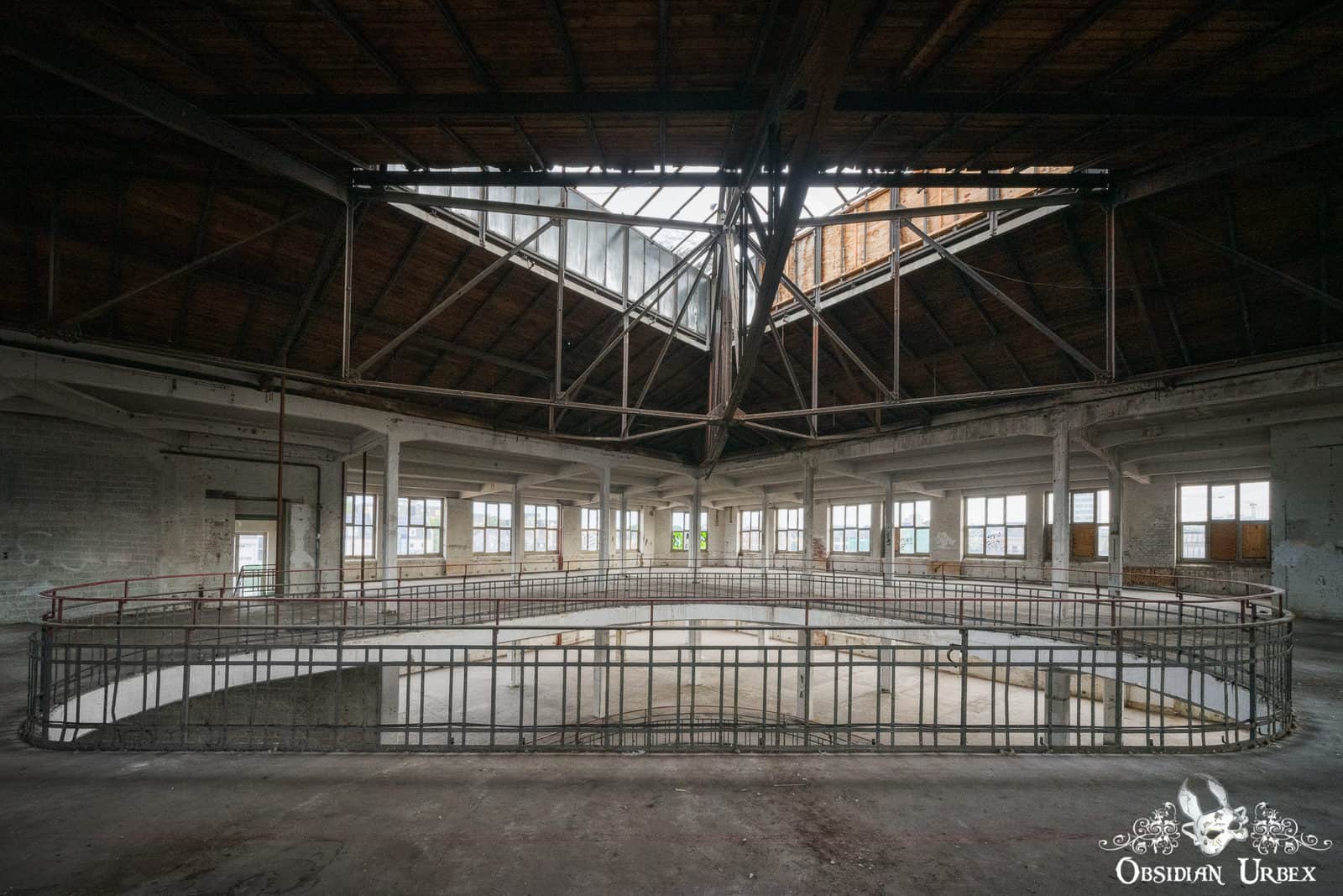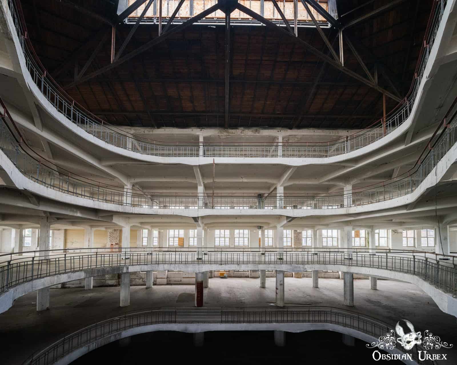 The company faltered in the mid-1990s. Subsequently, several buildings on this site were destroyed by fire. Most of the land around the Quake Arena has now been cleared. The protected monument status of this iconic building protects it. It stands resolute, in stark contrast to the cleared wasteland which surrounds it.