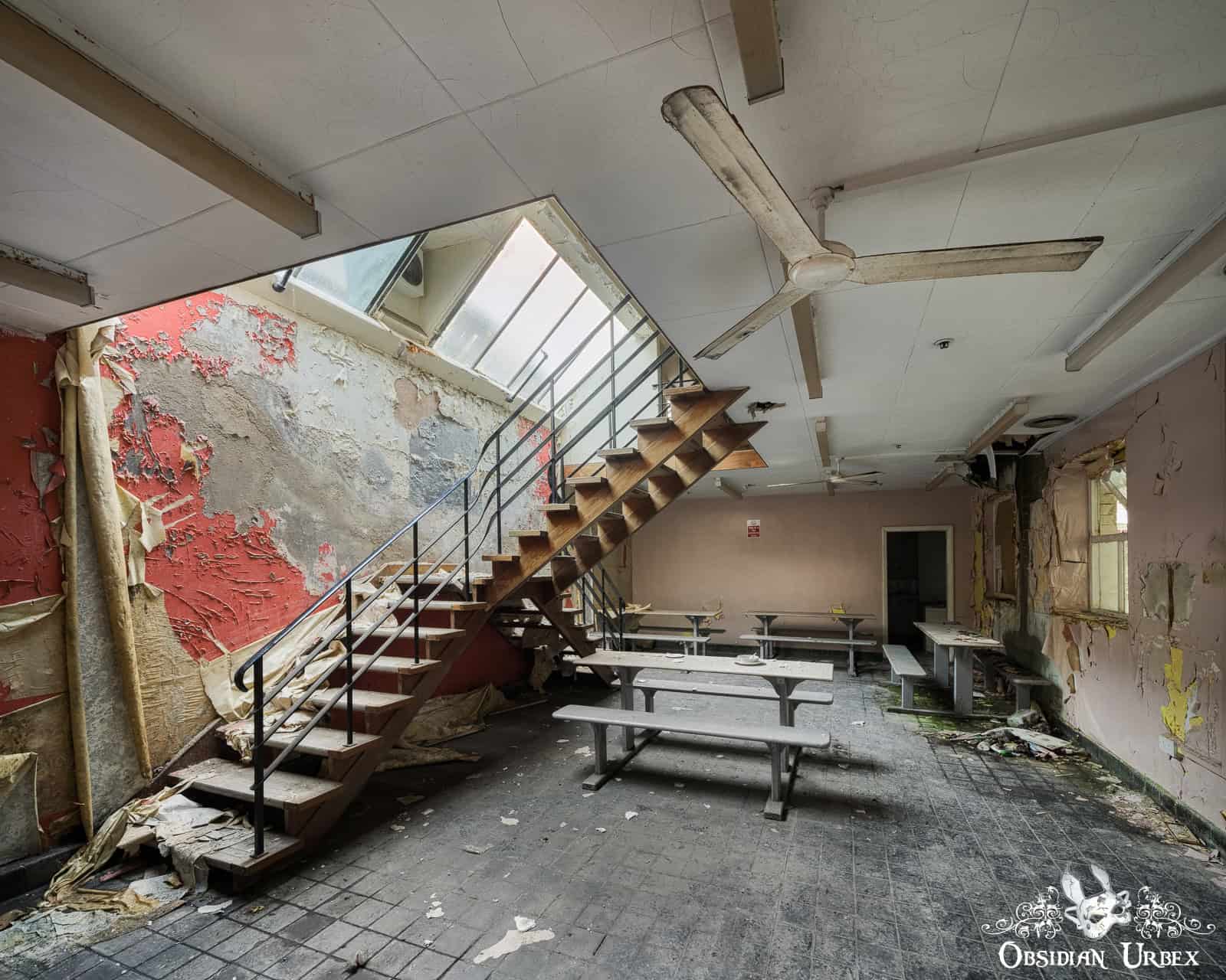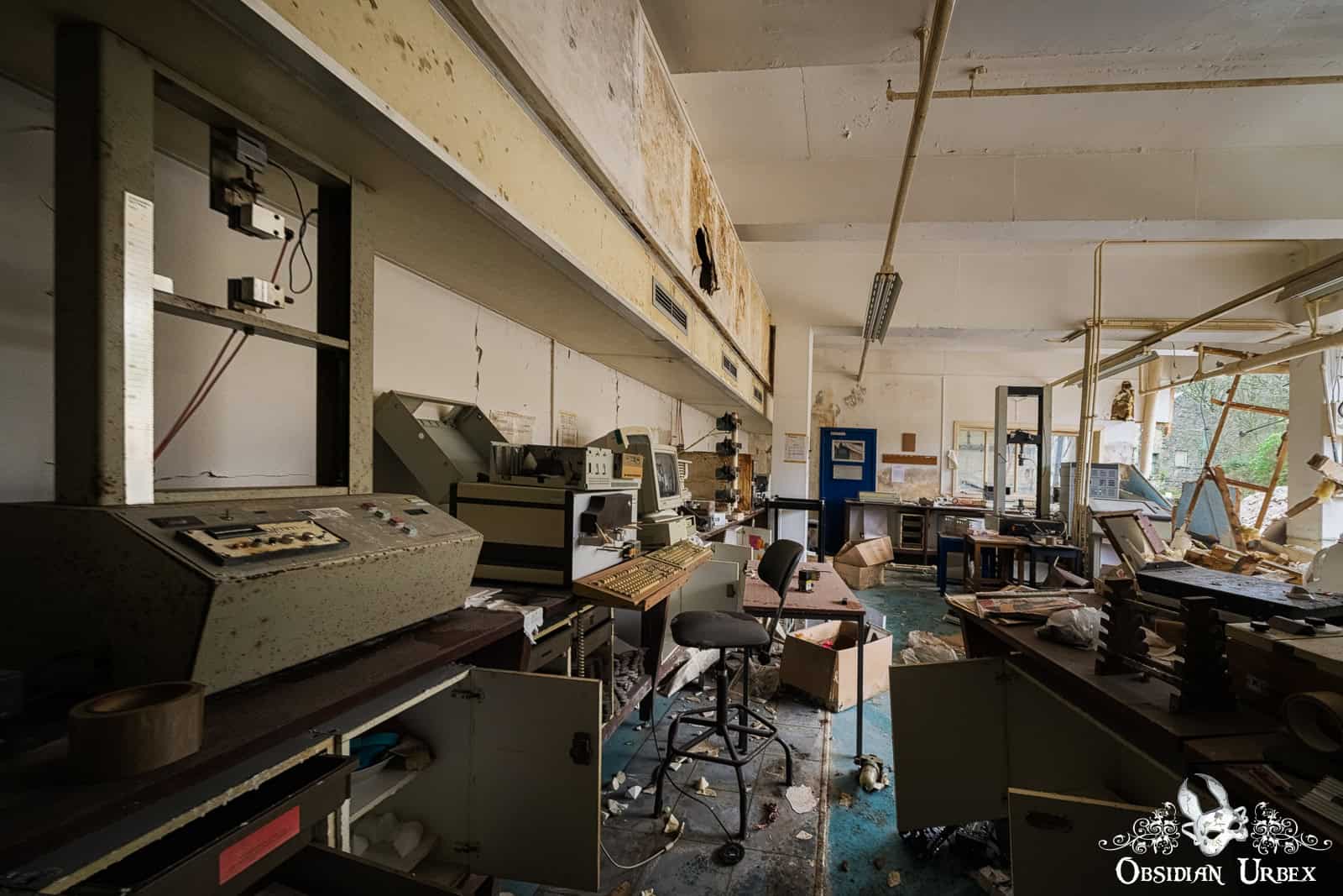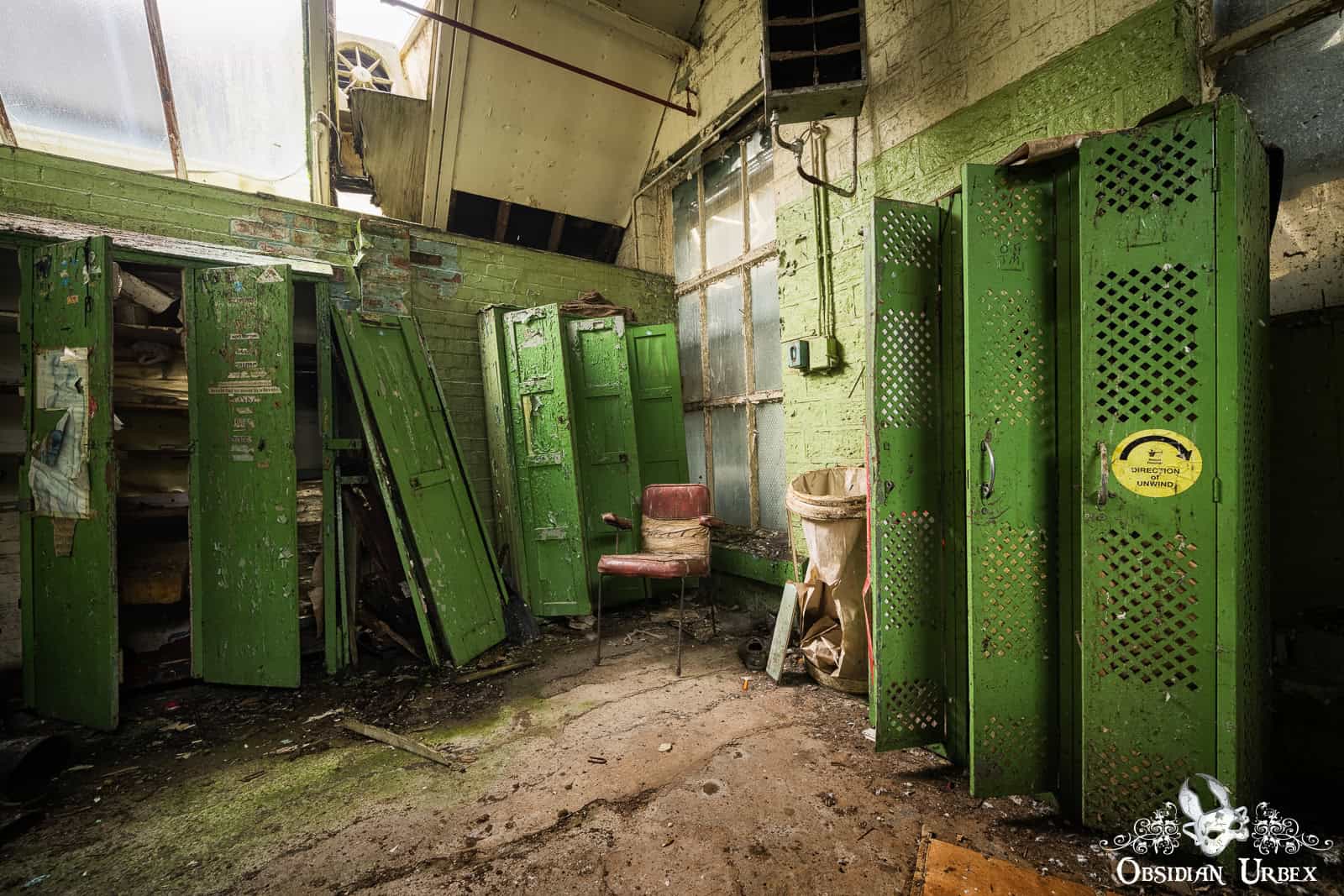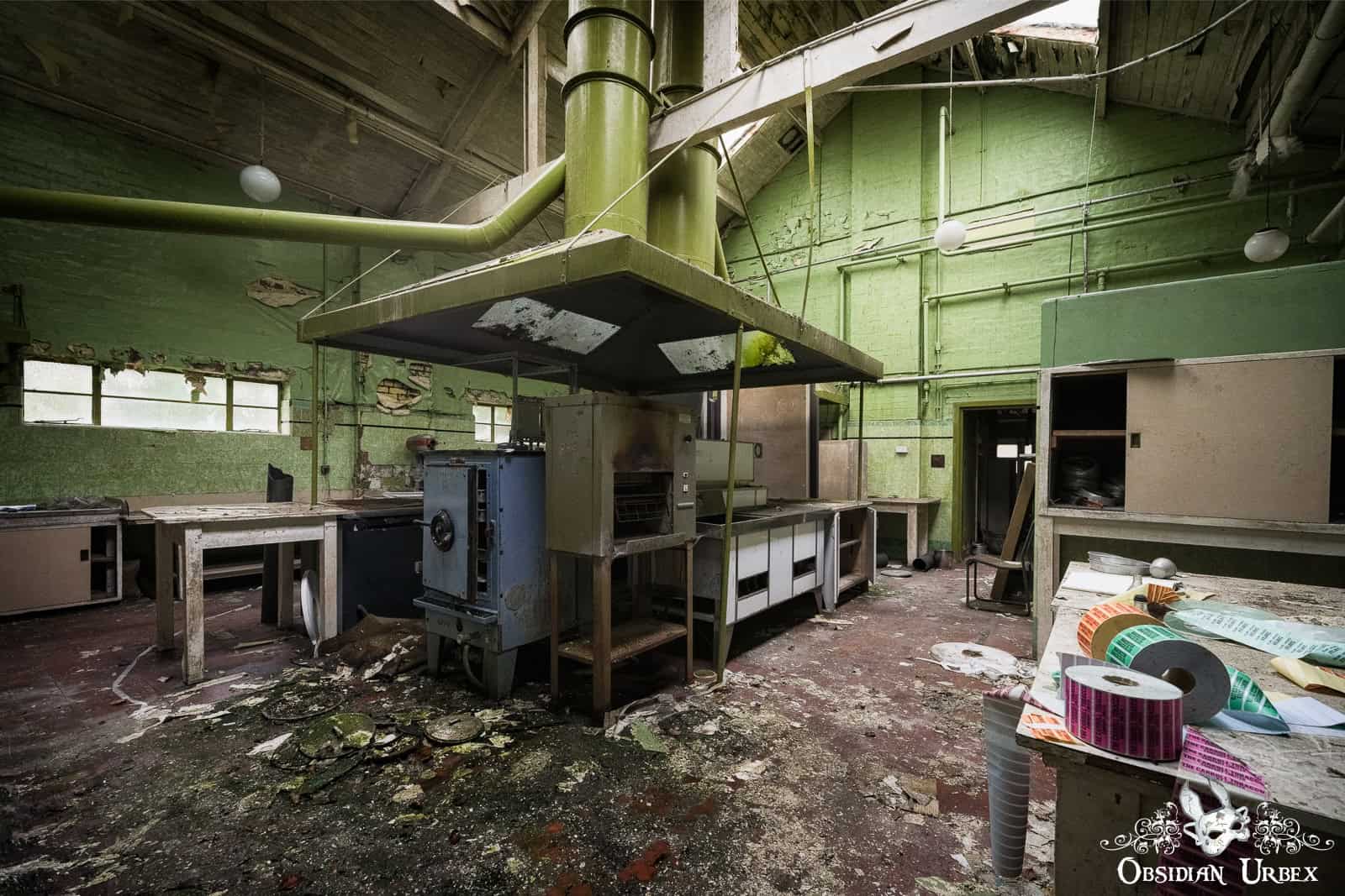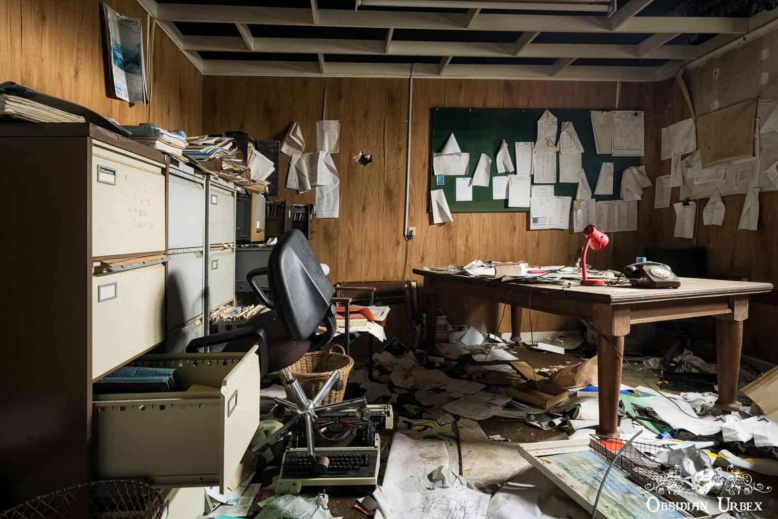 Interestingly, the finishing room felt like the heart of the factory. Stairways led to various rooms that encircled the upper floors this space: offices, a boardroom, and even a design room filled with blueprints and technical documents. I also discovered a small medical bay, complete with a hospital bed. On the upper floor, overlooking the finishing room floor, was a small breakroom canteen. The wallpaper sloughing off to reveal red, peeling paint underneath.