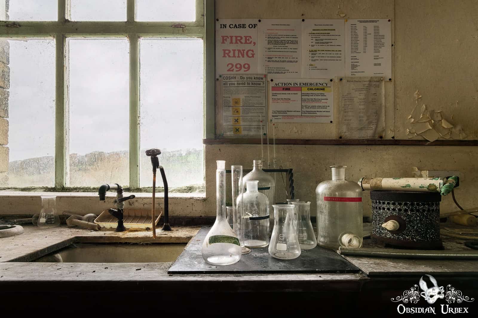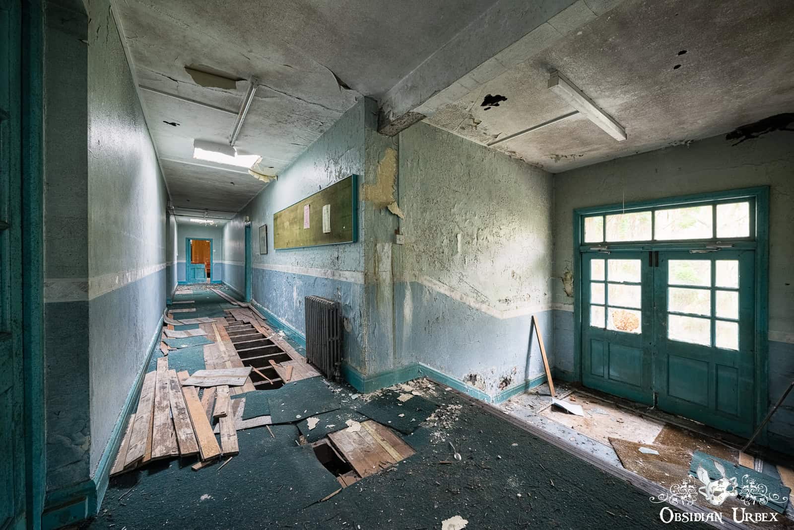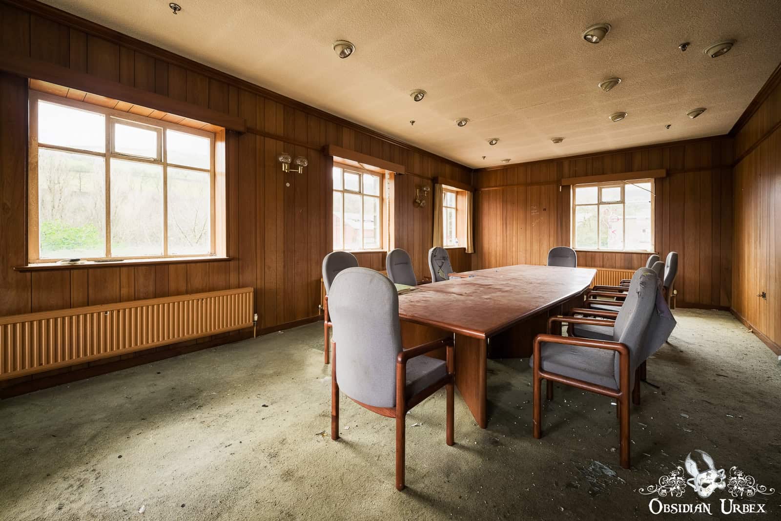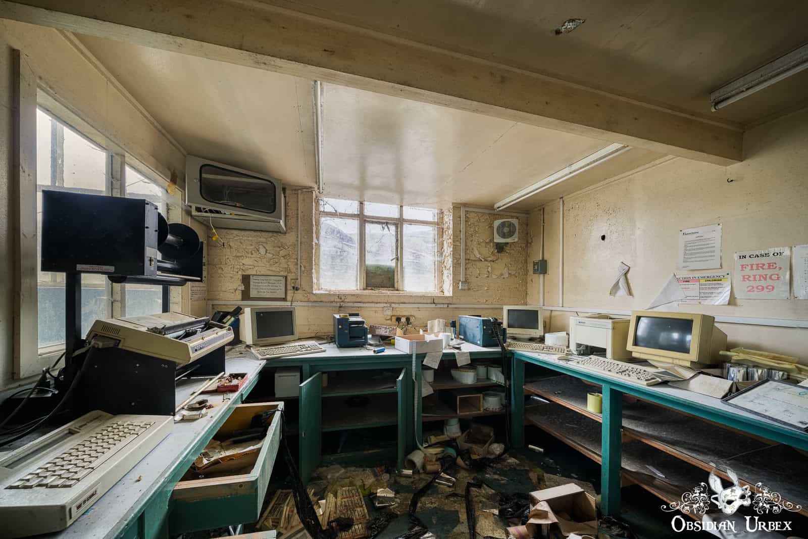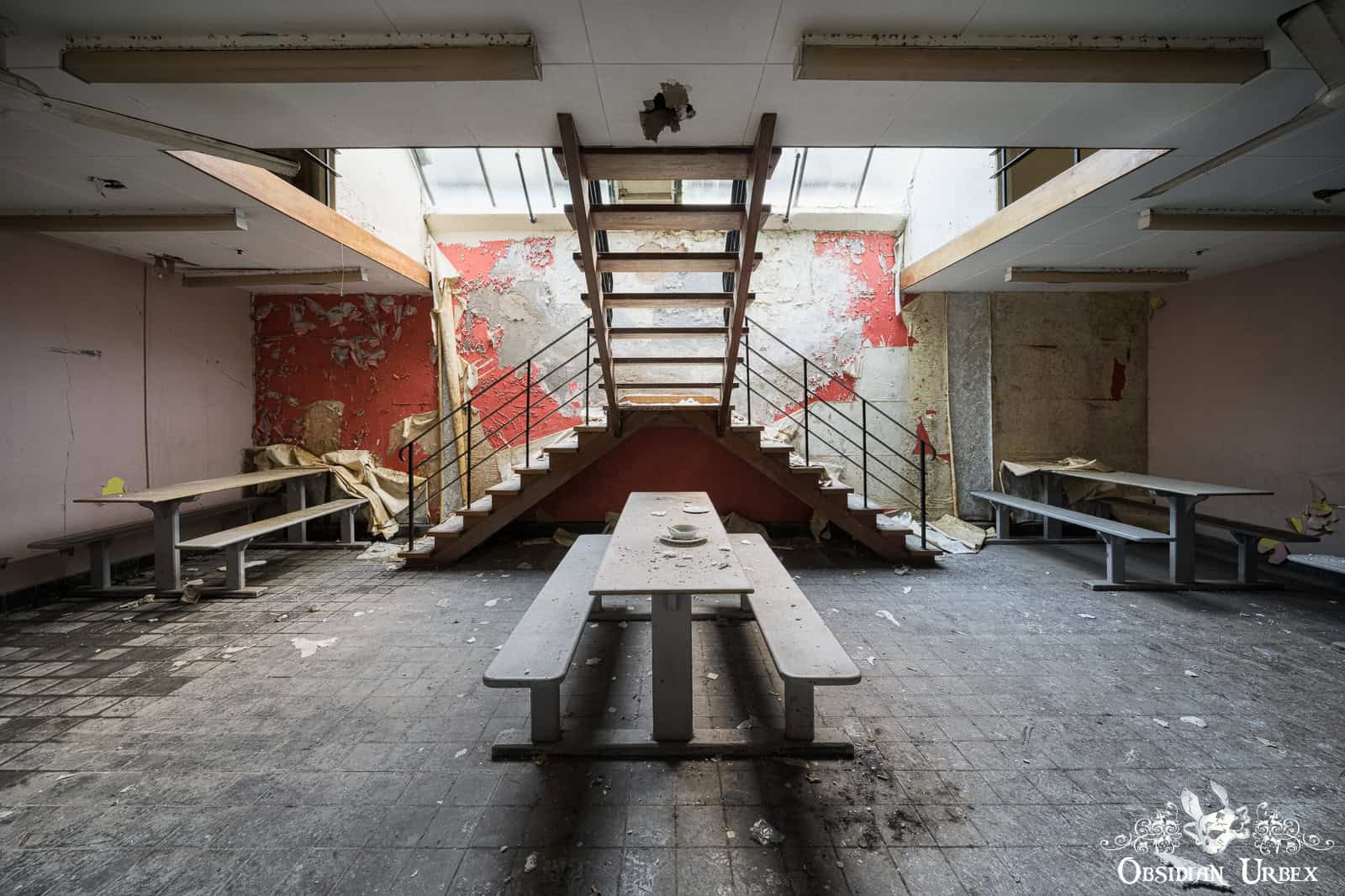 Interestingly, the finishing room felt like the heart of the factory. Stairways led to various rooms that encircled the upper floors this space: offices, a boardroom, and even a design room filled with blueprints and technical documents. I also discovered a small medical bay, complete with a hospital bed. On the upper floor, overlooking the finishing room floor, was a small breakroom canteen. The wallpaper sloughing off to reveal red, peeling paint underneath.