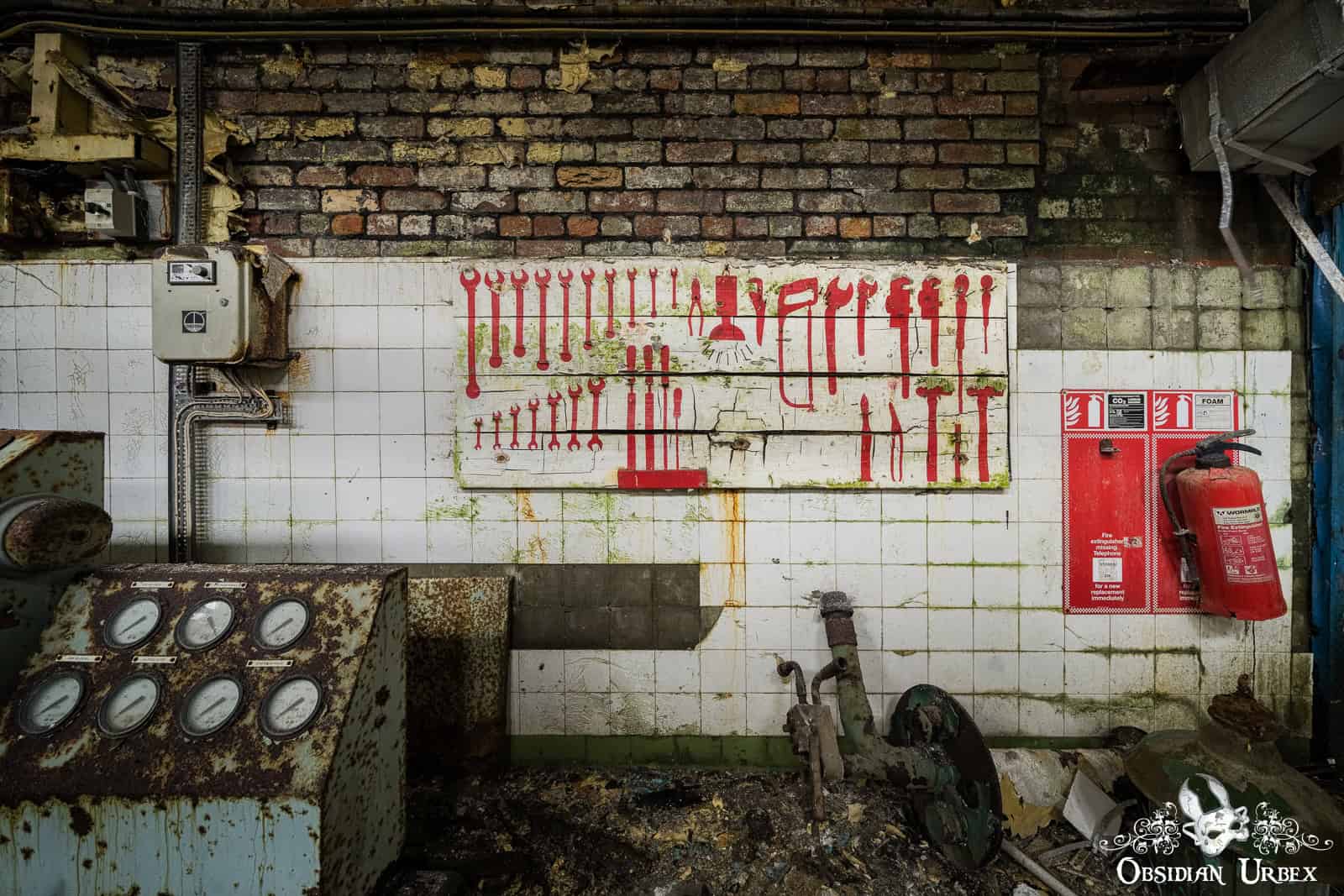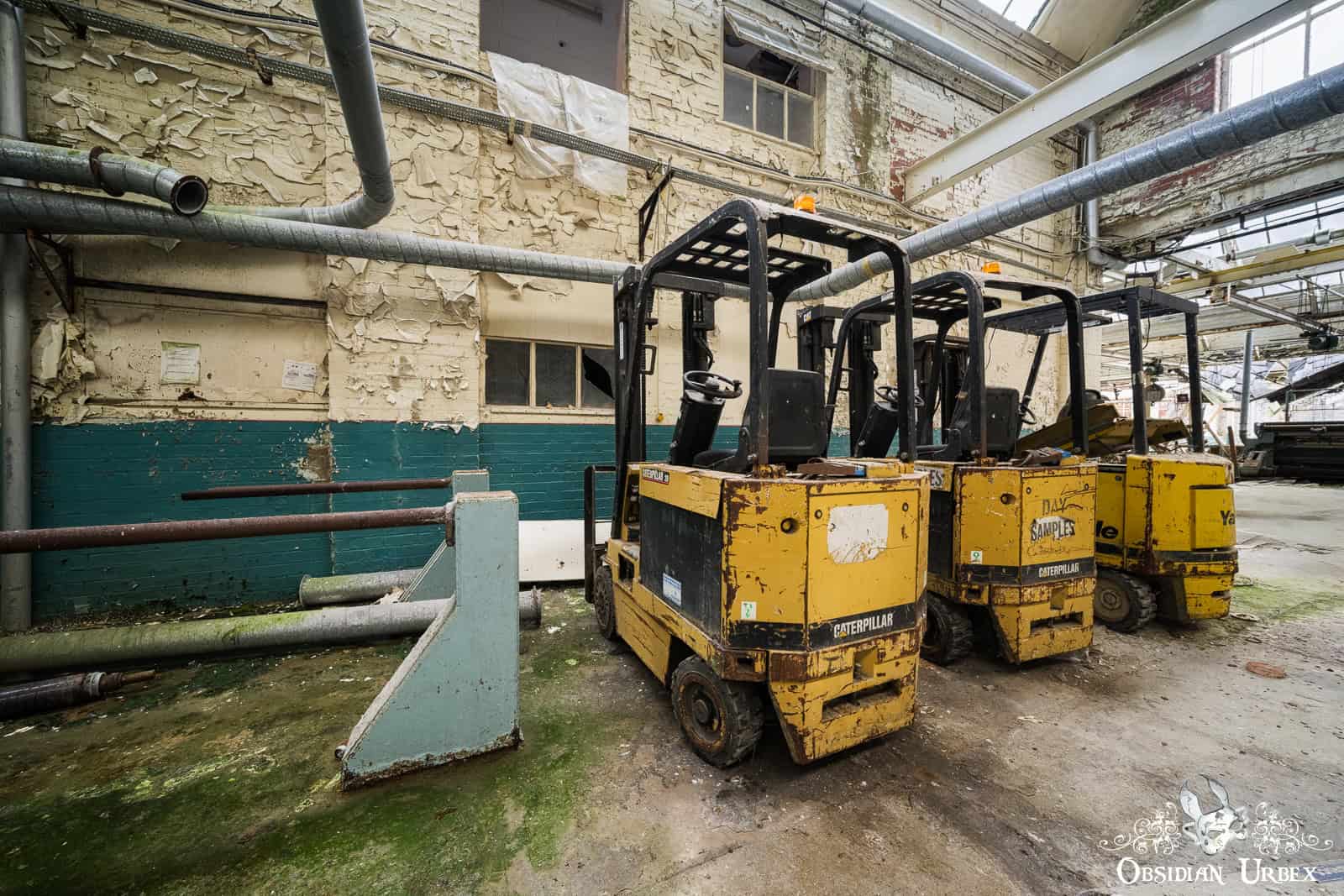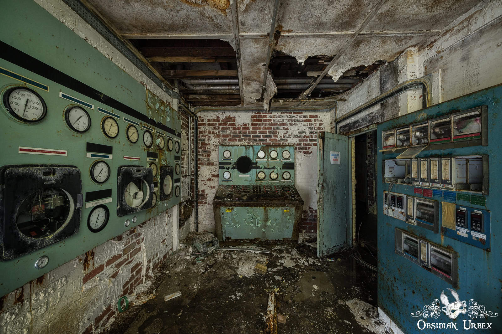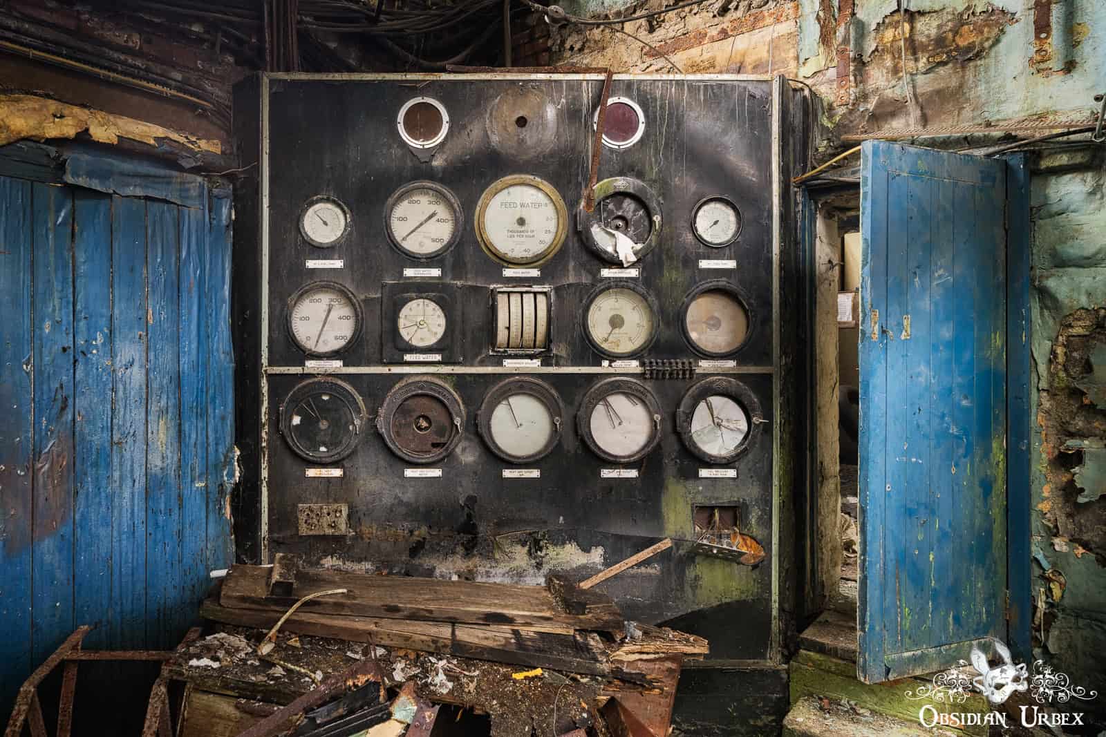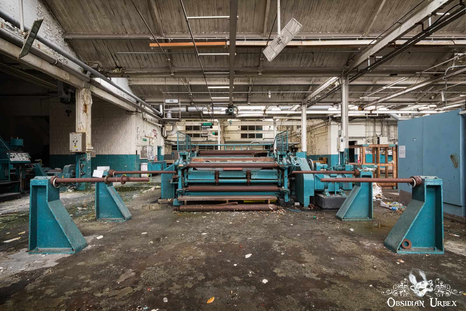 This impressive space, filled with pipes covered in peeling paint, is a real industrial decay wonderland. The four large boilers dominate the room, their greet paint faded and flaky. There are several black control panel banks lining the walls, with glorious dials and heavy switches. The heat that once radiated from these massive machines must have been immense, as they worked tirelessly, powering the mill and driving its production lines.