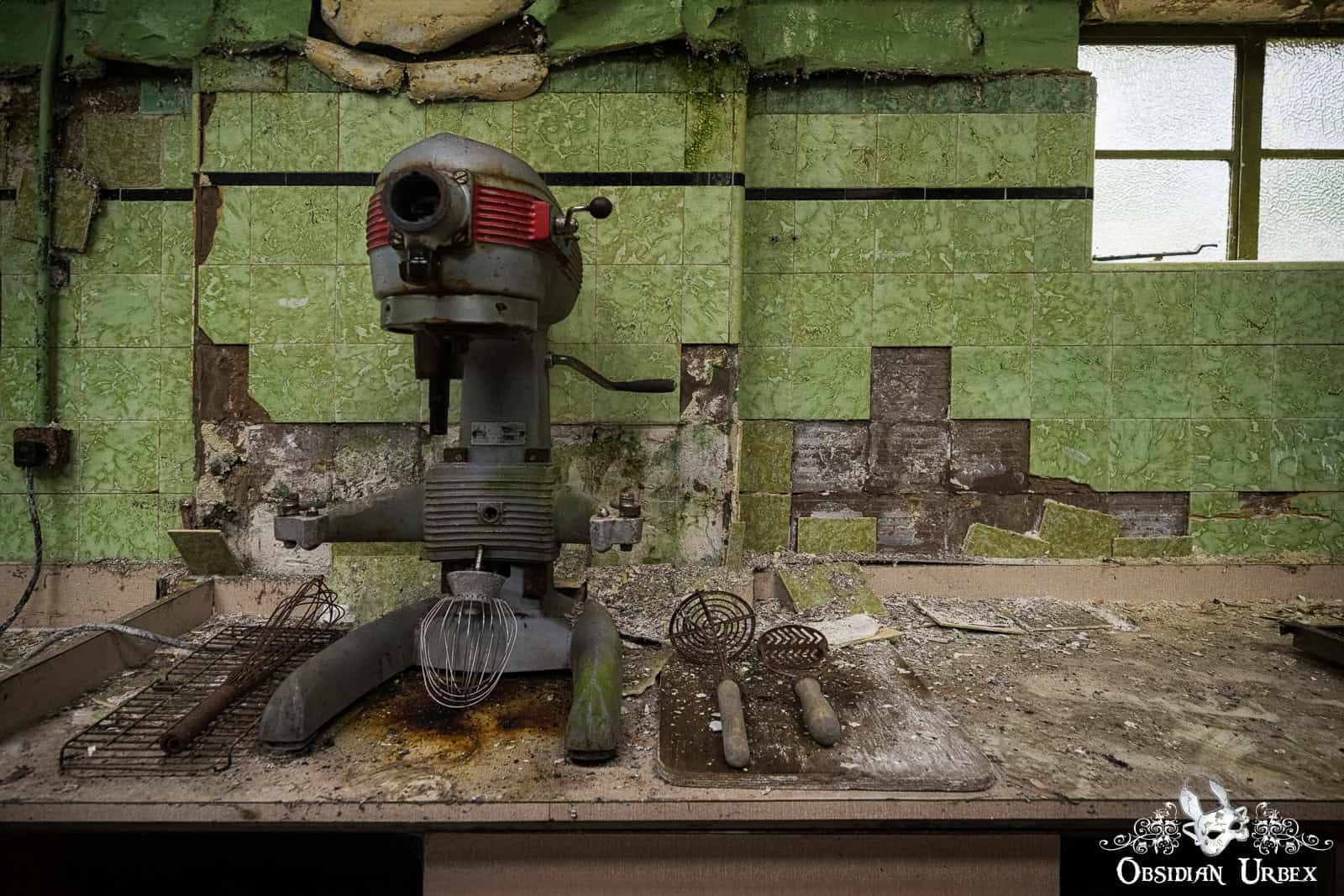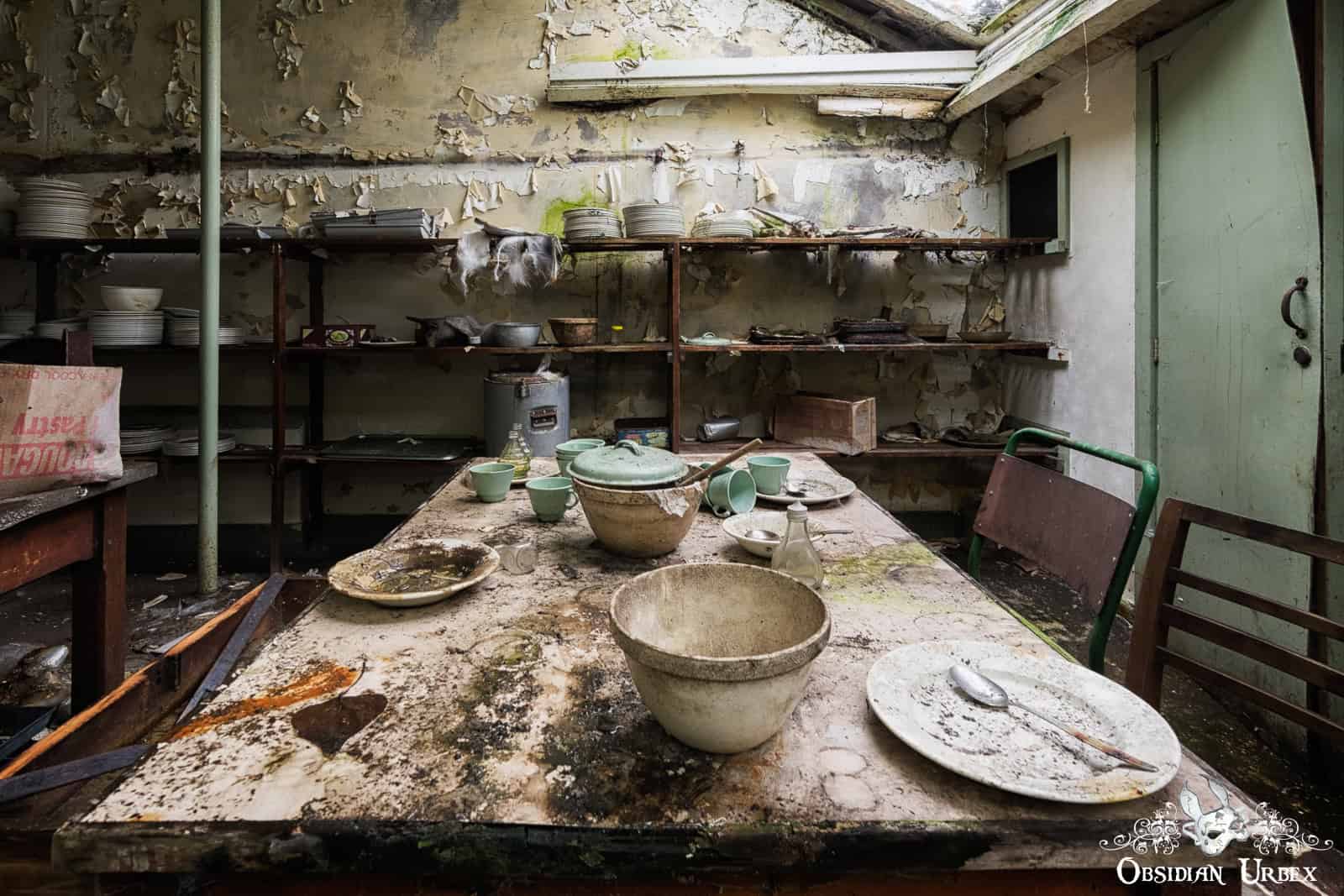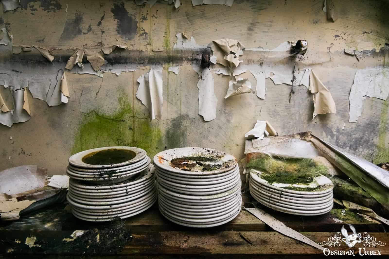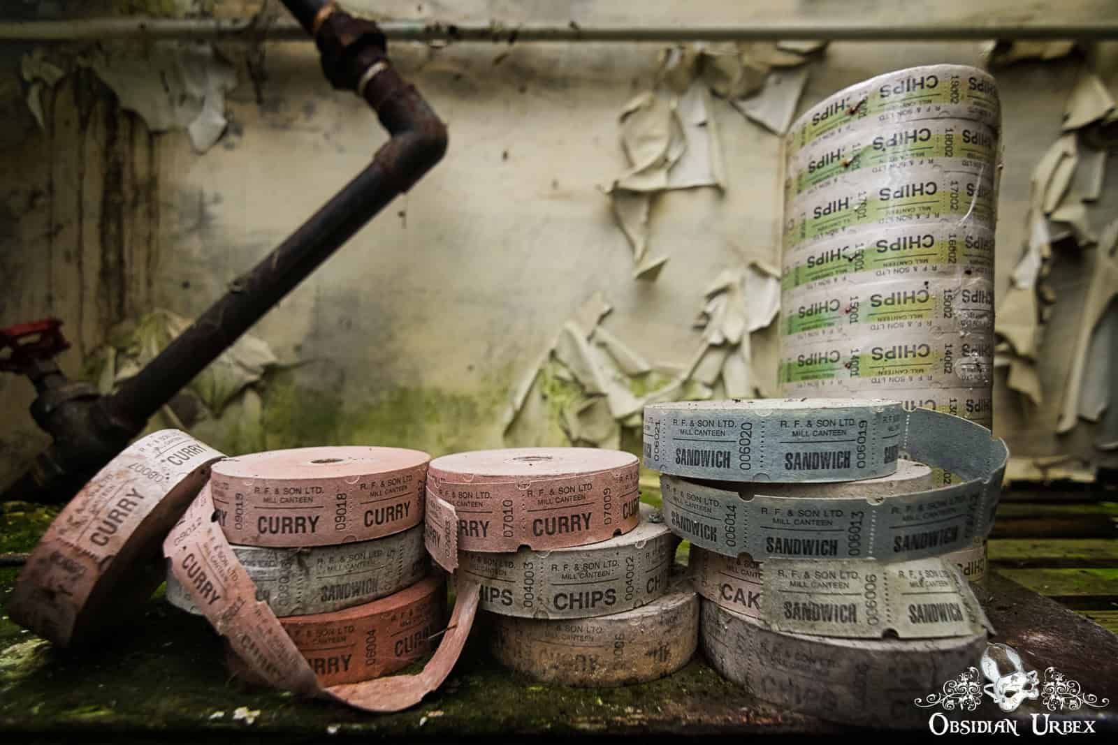 A large section of this ancillary building housed kitchens, complete with retro appliances, including a charmingly photogenic old mixer. Next door is a paper storage area, with large reels of paper neatly stacked and seemingly ready to ship. I suspect that this room was originally a large canteen, that turned into a storage room somewhere in the distant past for some reason. Upstairs, a fantastically decayed lunch room held crockery and utensils stacked chaotically on shelves and laid out haphazardly on the rickety table. On the shelves were also some interesting rolls of company meal coupons for curry, chips, and sandwiches. Yummy!