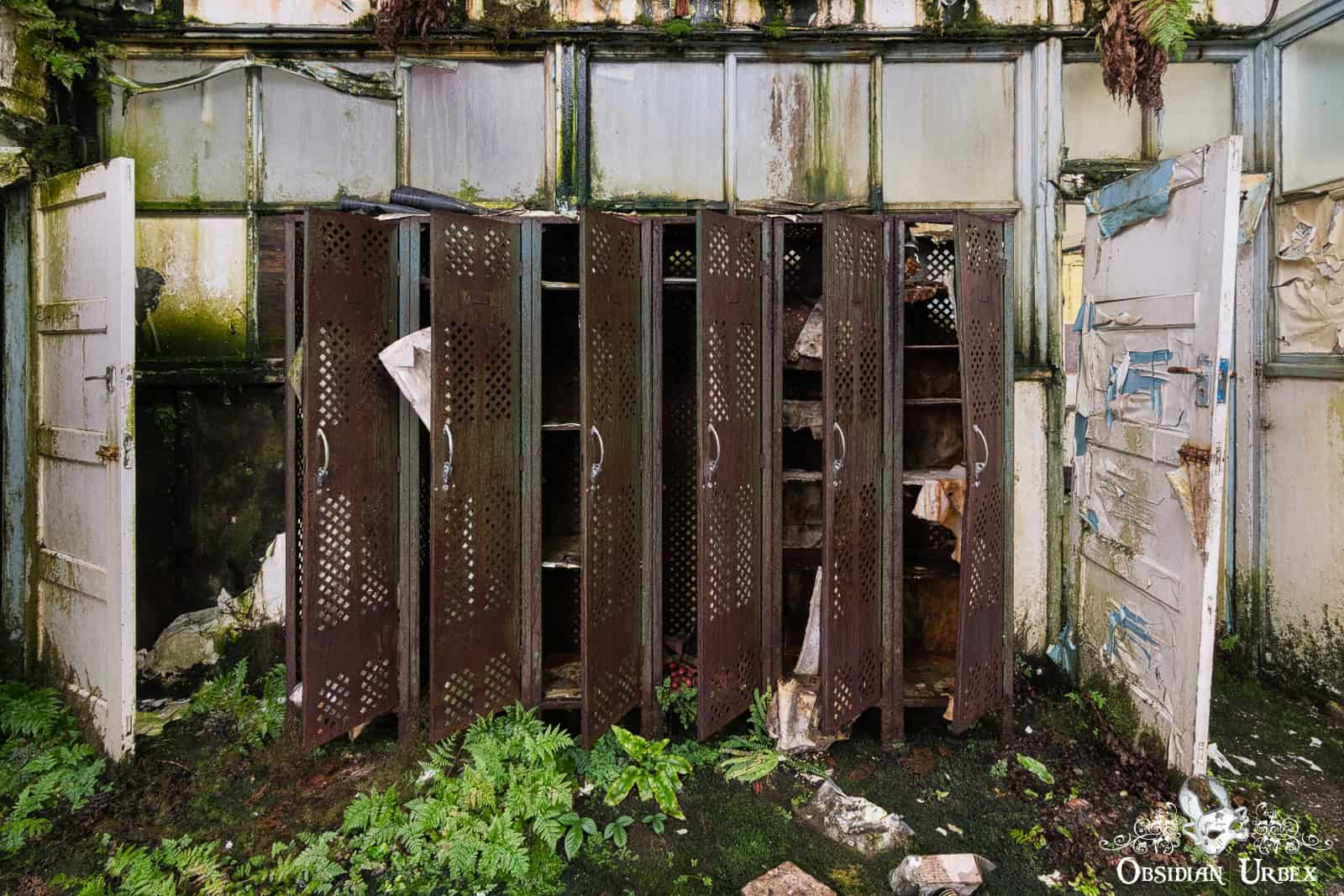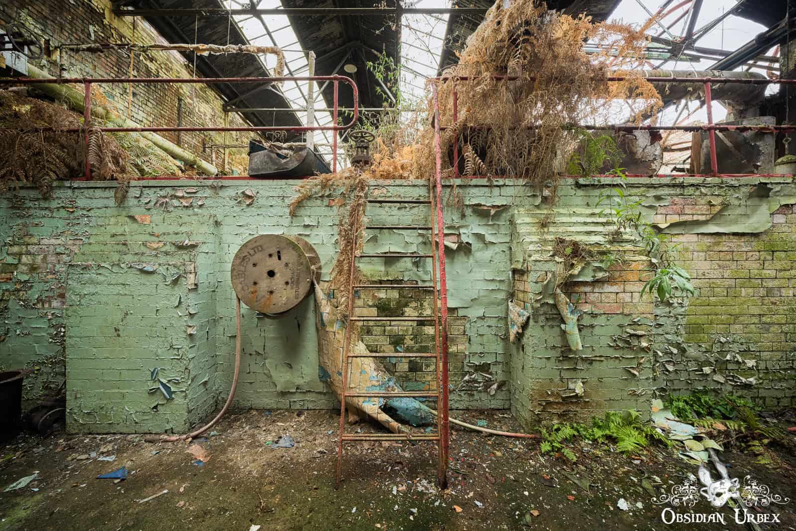 Our journey begins in the yellow-walled pulping area, located on the uppermost floor. Bales of chopped hemp and flax chips arrived here, ready for transformation into paper pulp. Workers loaded raw materials into enormous spherical containers, known as “pots”. The material was boiled under pressure in caustic acid for hours. Adjacent to this area, I found several decaying offices and a small single-room laboratory. Nearby, rows of rusted lockers line the walls in the boot room. Workers would have stored their personal belongings, but now the doors hang open and ferns grow happily on the floor.