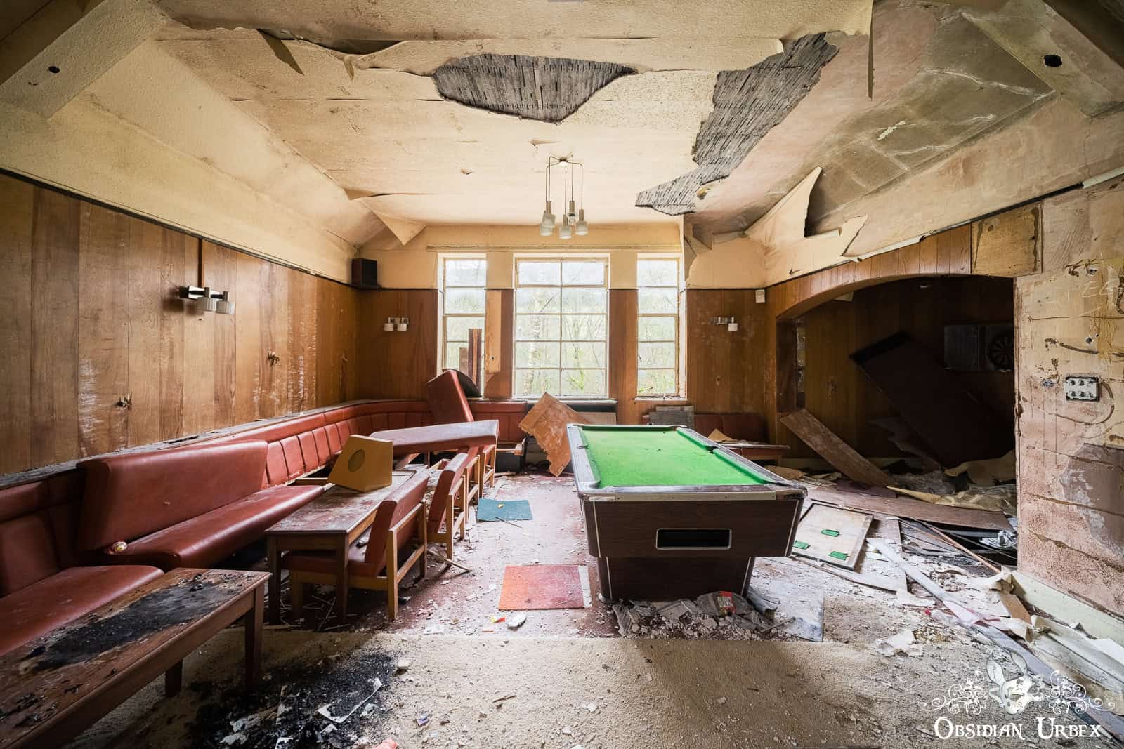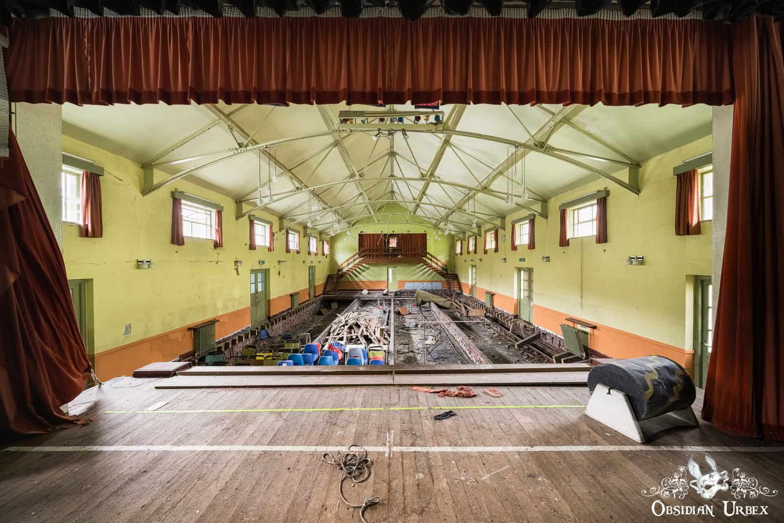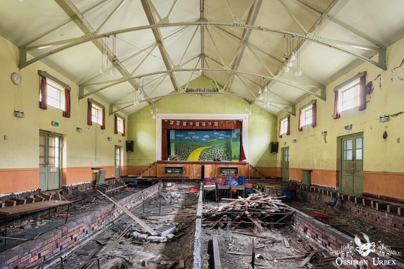 The social club was built in 1937 and closed down with the rest of Robert Fletcher & Sons Paper Mill. There was a bar where workers could unwind with a pint and enjoy a game of snooker after a hard day in the mill. There was also an auditorium with a stage where children of millworkers and the nearby villages would practice and perform. Unfortunately, vandals had severely damaged the social club bar. Additionally, someone had removed nearly all of the floorboards from the auditorium.