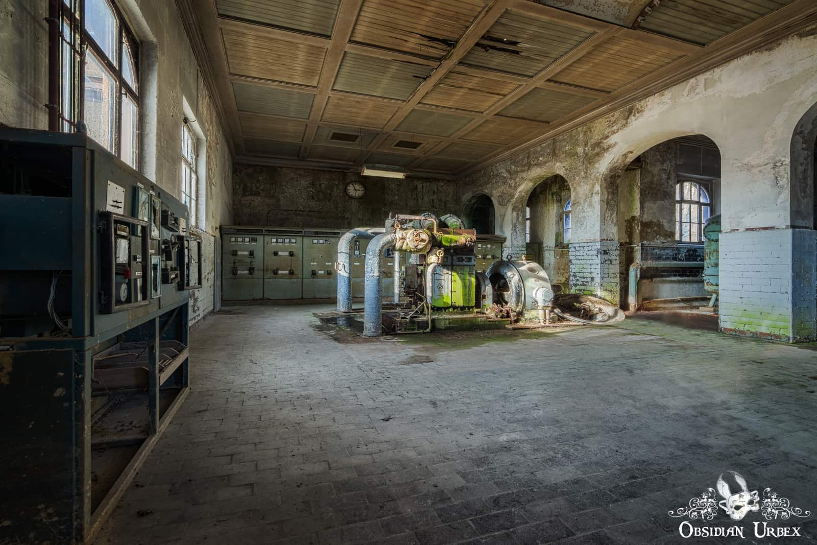 A few interesting pieces of vintage machines remain in the on-site power plant. The powerplant is sometimes called “Baby Power Plant”. Inside the turbine hall is a single turbine. Spillingwerk engineering, of Hamburg, manufactured this turbine. The turbine was once painted a vivid cobalt blue. Nowadays the paint has faded and is flaking. Rust and corrosion are gradually replacing the once bright blue paint job. A patchy veneer of lime-green mold contrasts with the pale blue. The mold seems to highlight areas where direct sunlight filters through the large Art Deco windows.