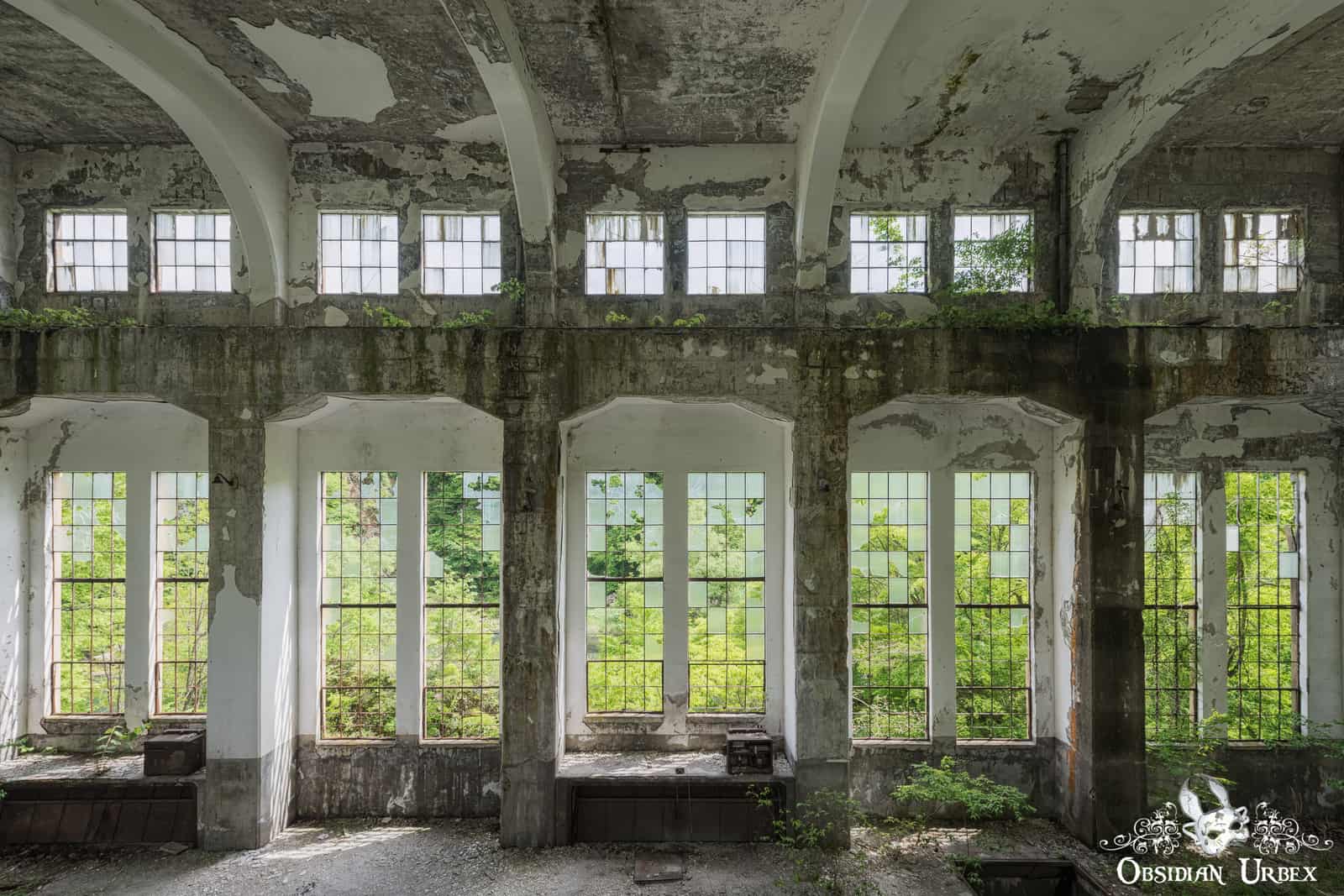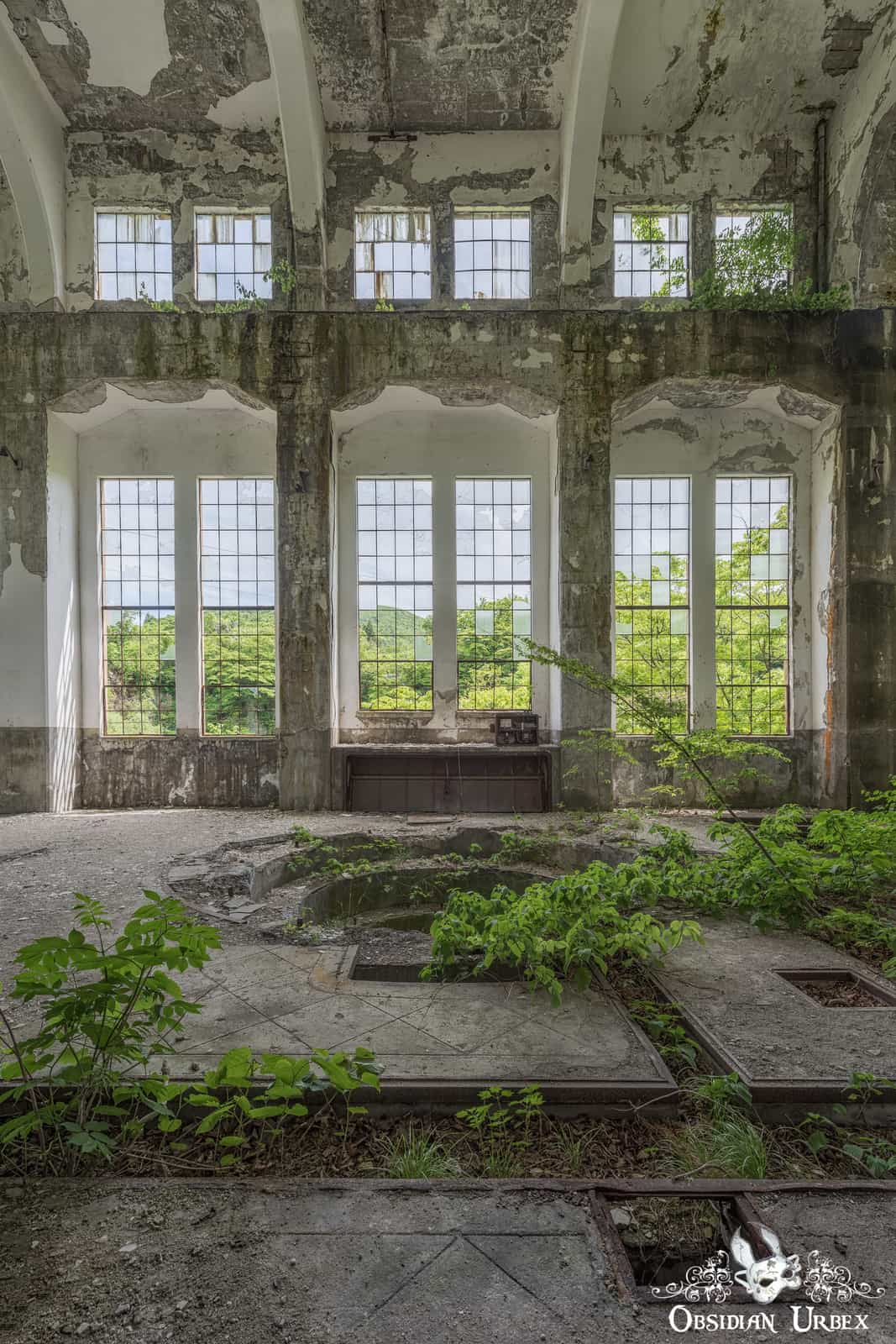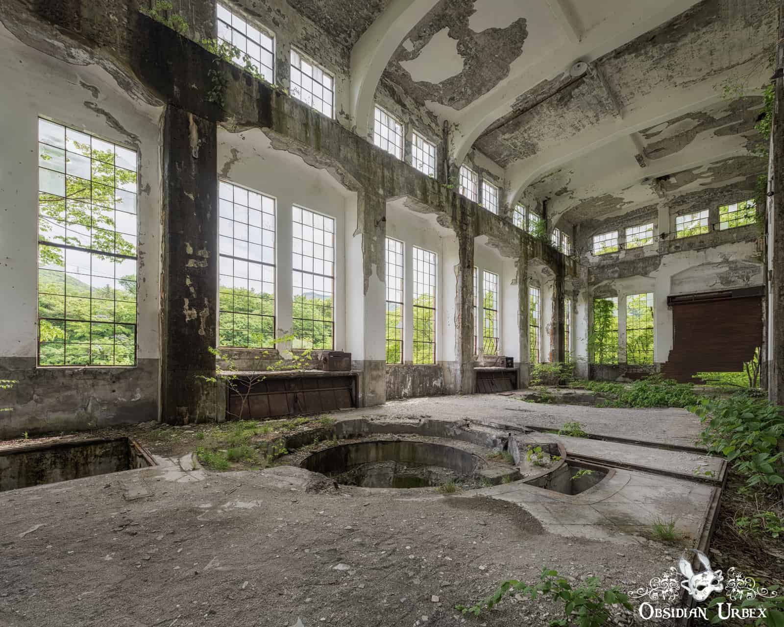 The main turbine hall at Wagakawa Hydro Power Plant features large windows, making this chamber bright and airy. The ceiling must be nearly 20m tall. Column-like ribs on the wall rise to form arches which support the roof. Most of the glass has shattered over the years. These remnants now cling to the frames in jagged fragments. There are two large circular holes in the floor which would have housed the turbines.