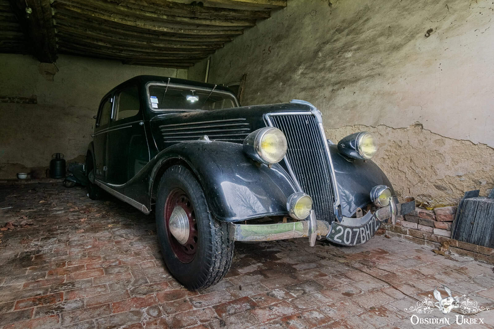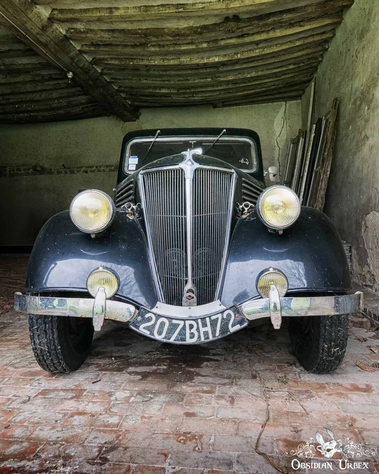 A striking Art Deco-style 1937 Renault Celtaquatre languishes inside a dusty garage, within the grounds of an abandoned chateau in France. The sleek, streamlined black bodywork is accented with chrome strips and a striking front grill. The yellow headlights look out over the overgrown castle grounds, peering out from the shadow. Although it is only a short distance to the open road, for the moment freedom is out of reach. This beautiful old timer has to wait a little longer for her next adventure on the winding French country roads.