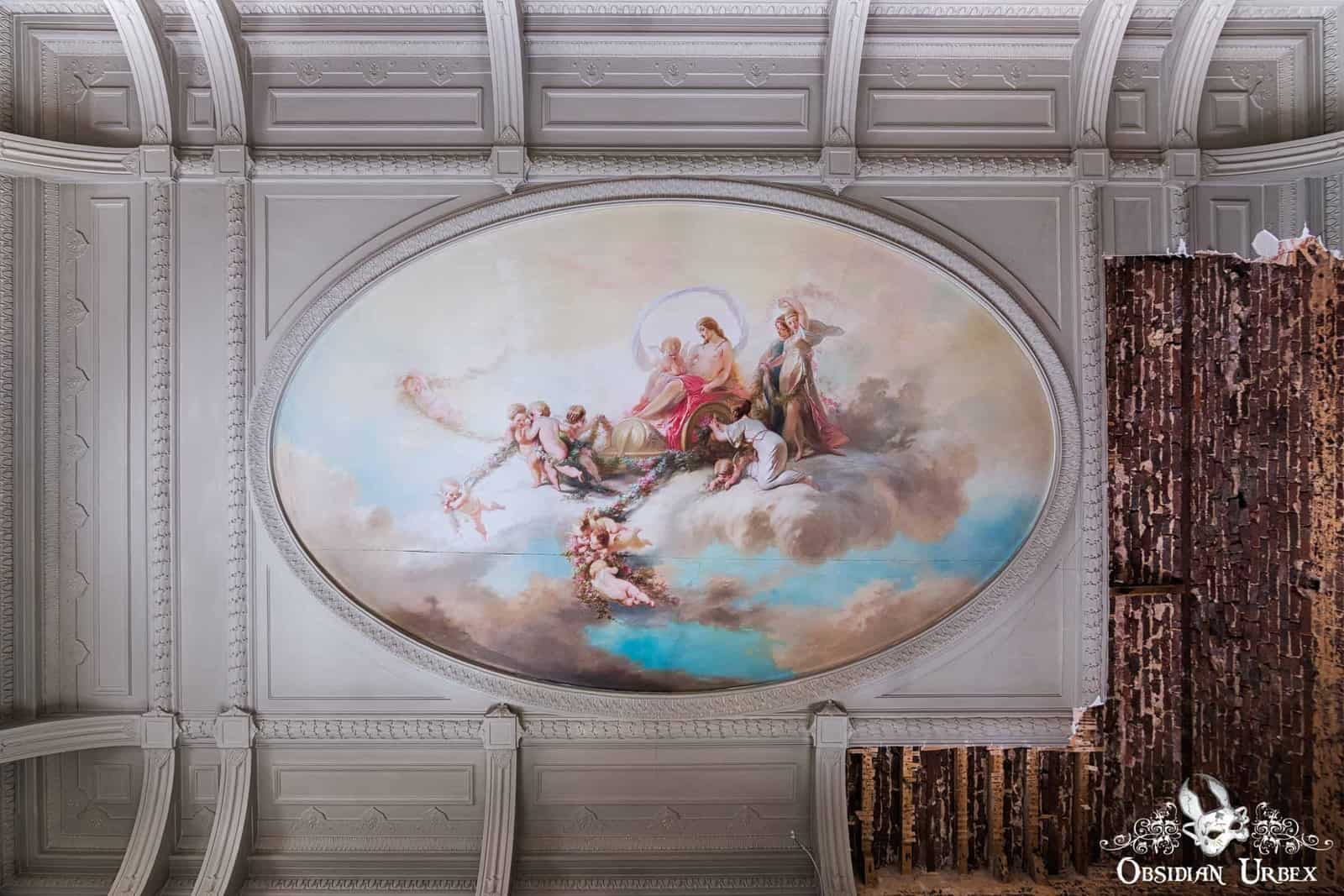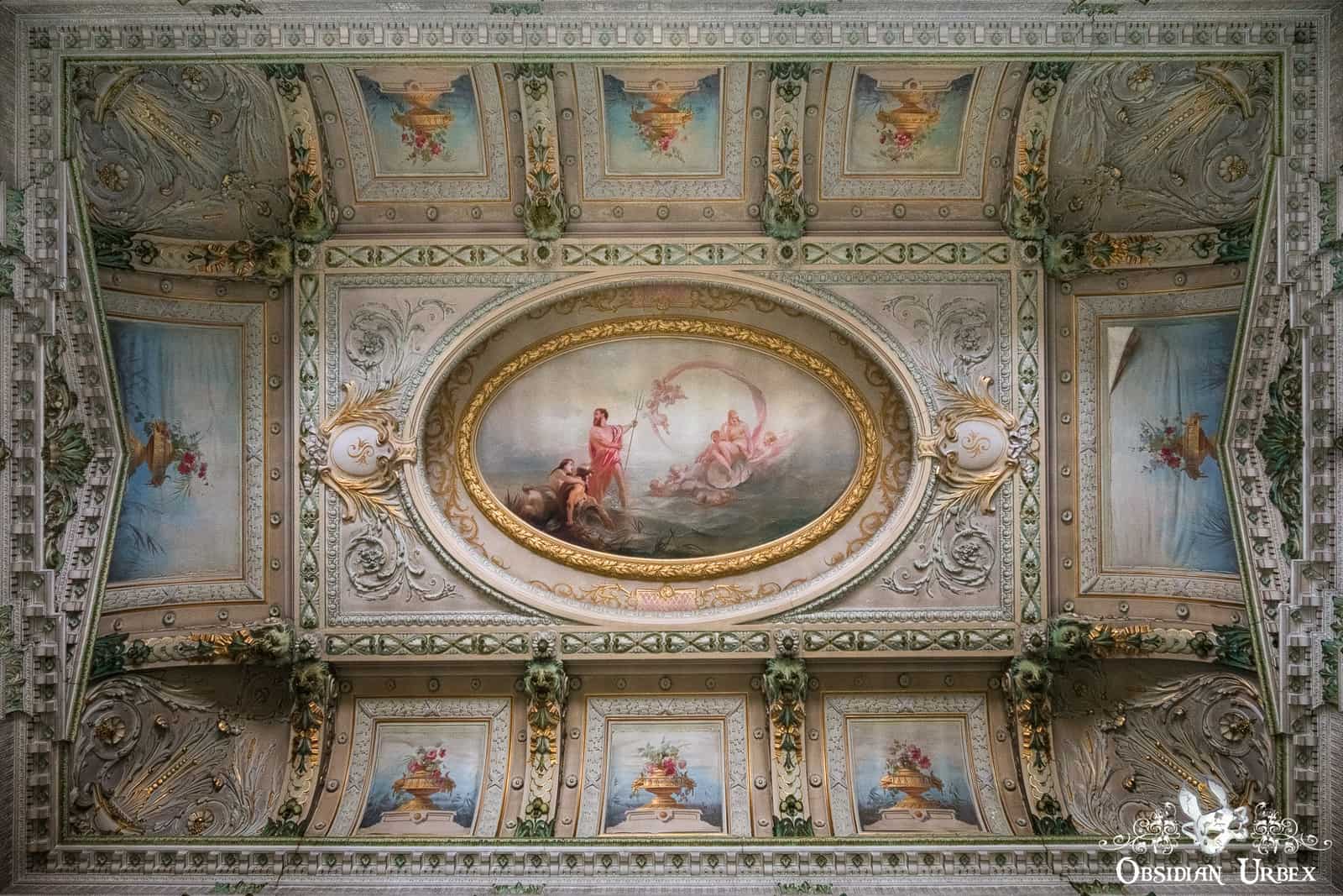 The vaulted ceiling is coffered, each segment featuring an identical painting of a golden vase filled with flowers. These appear to be canvas paintings inserted into the ceiling, as opposed to true fresco paintings. Several can be seen to be creased, and one has a torn corner which is hanging freely. At the centre of the ceiling is a painting featuring a trident-bearing man, and a woman sitting on rocks or a large seashell. Cherubs sit beside her, two are flying above while holding onto her long pink scarf. This appears to be painted directly onto the ceiling plaster.