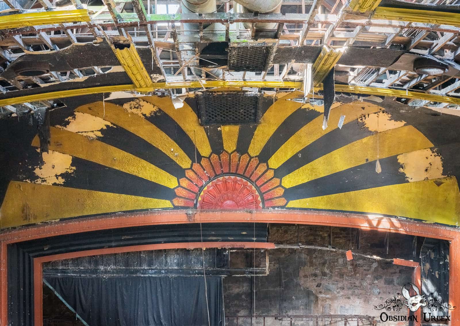 Inside the Art Deco Cinema would have been seating for around 960 movie goers. There was a lower stall area, as well as an upper balcony area. A wonderful Art Deco style staircase leads up to the balcony level. The stage has an unusually wide proscenium arch, given the small size of the cinema. Above the arch is a black, yellow and red radiating sun motif. This kind of mural was popular in 1920s and 1930s cinema decoration.