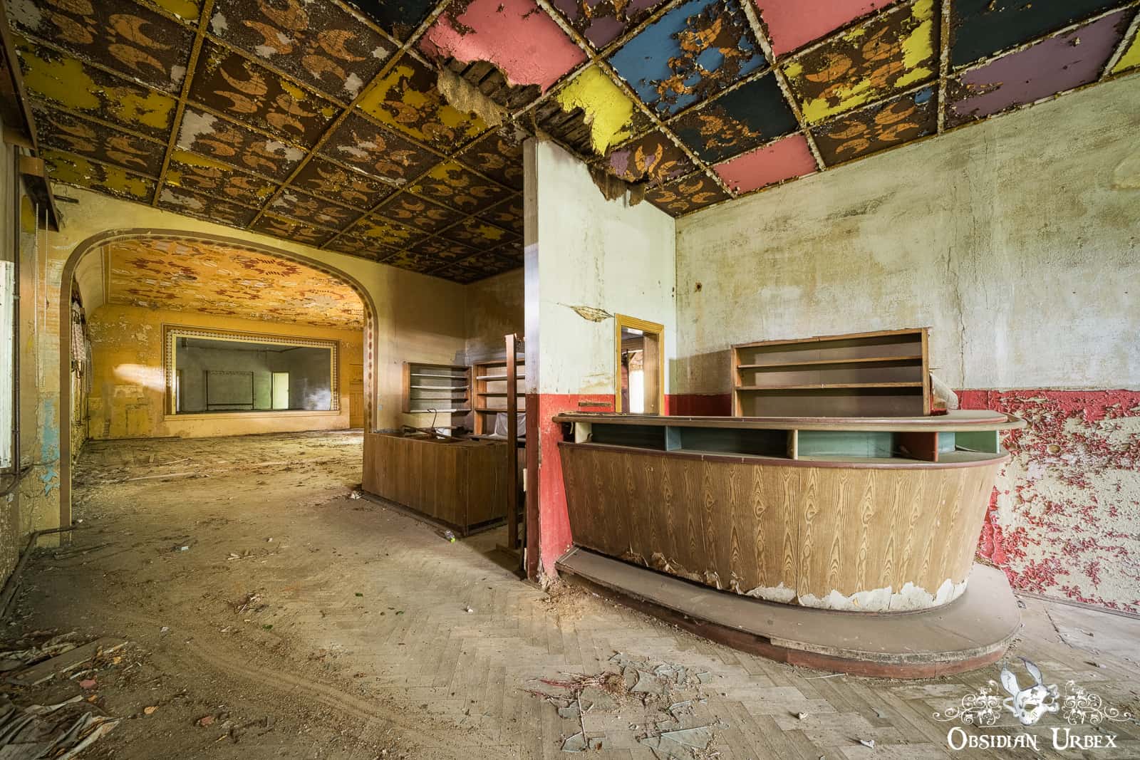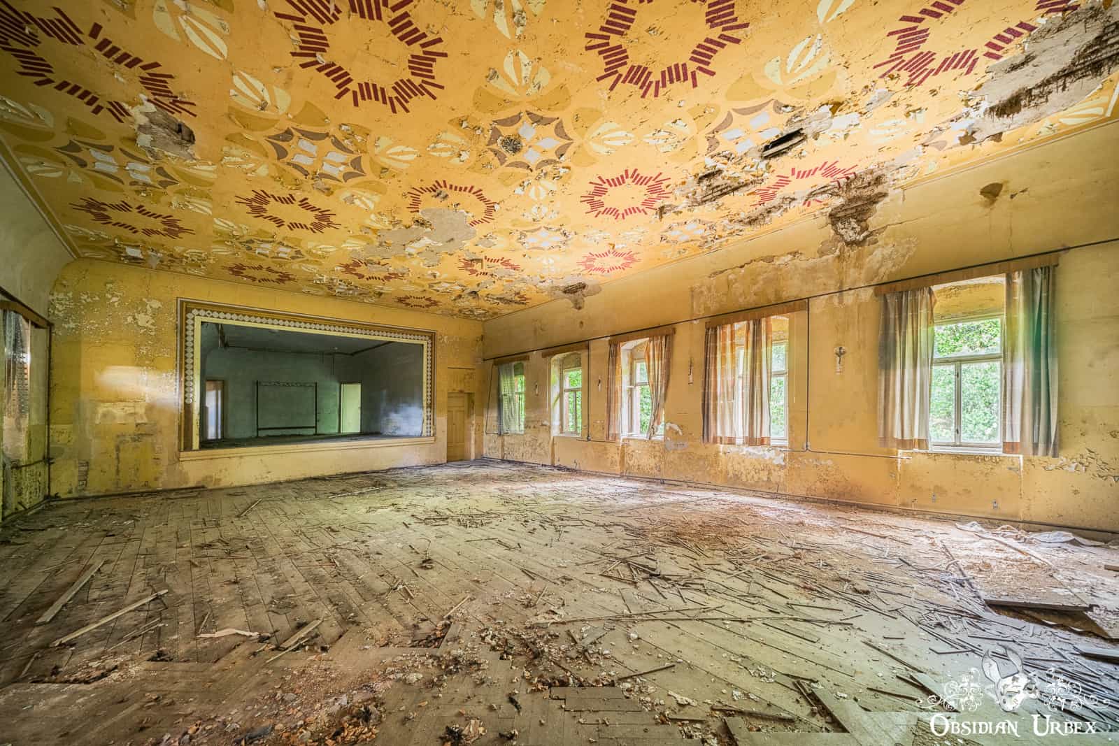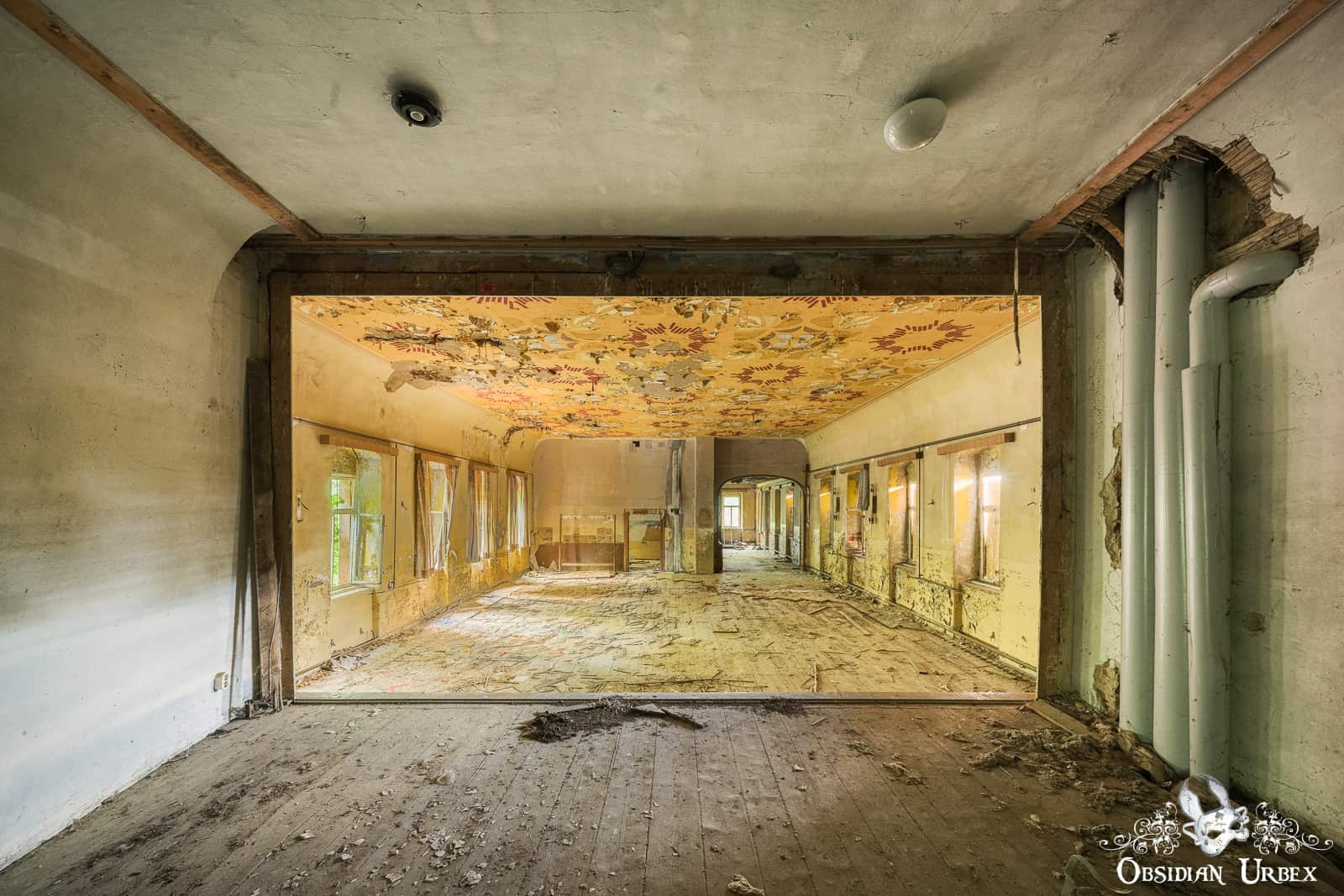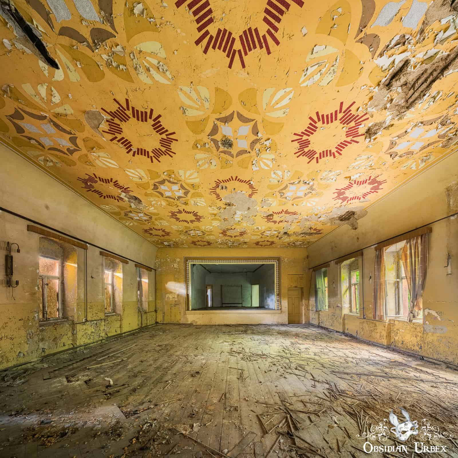 Ballsaal Blume is an abandoned ballroom, tucked away in a small town in East Germany. The name translates to “Ballroom Flower”. This location is sometimes called Kulturhaus Blumendecke; or “Culture House Flower Ceiling”. Certainly, these codenames have a flowery trend to them! The entire ceiling of the ballroom is painted with motifs that are usually described as flowers. Personally, I think they look more like simple abstract radial patterns (perhaps that is just me not squinting, or tilting my head enough!).