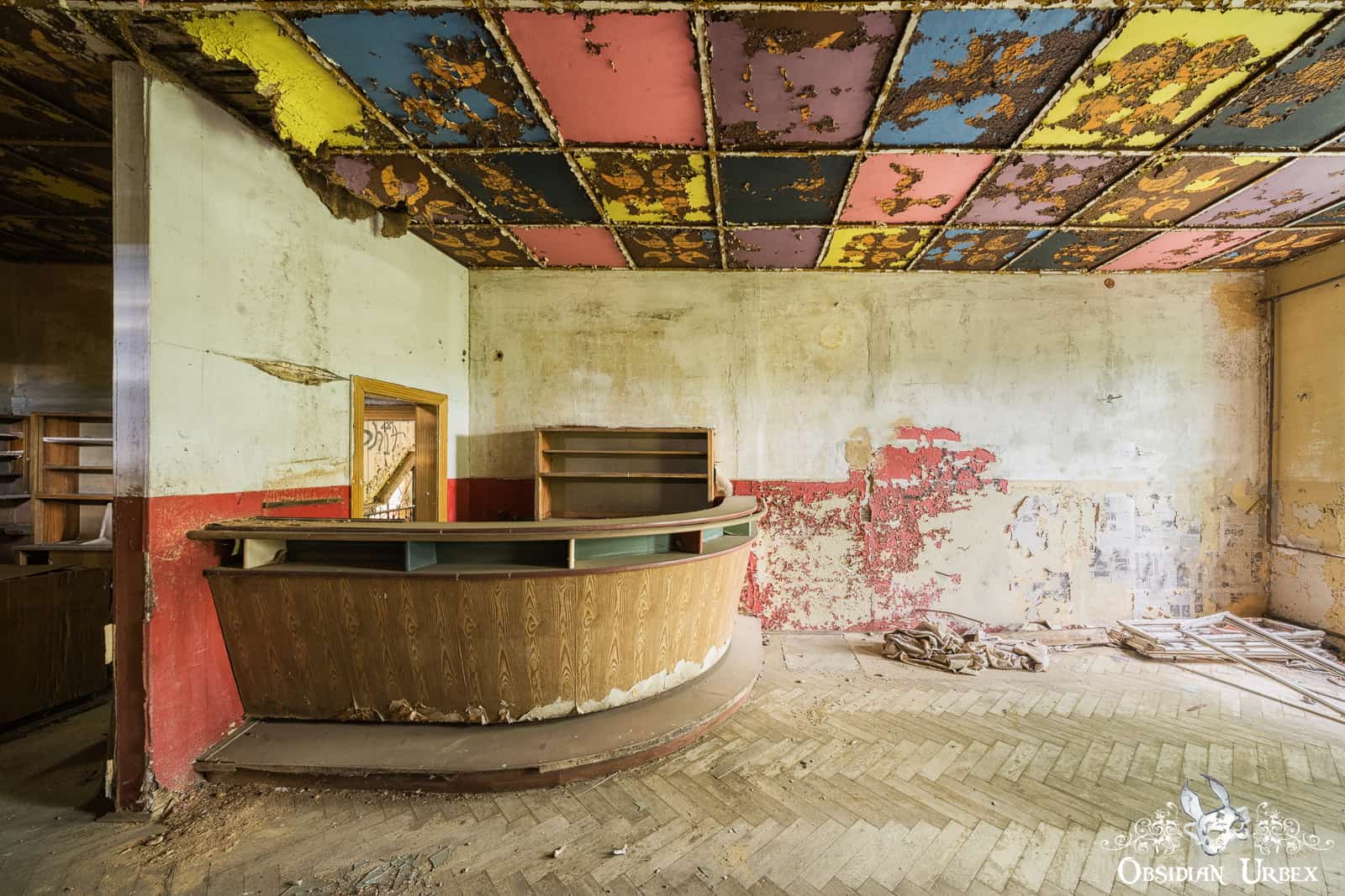 Ballsaal Blume has a second area that I found interesting; a bar area leading off from the main room. The curved wooden bar looks so welcoming, I could imagine people retreating to this room for a drink and to socialise. The ceiling tells an interesting tale of changing decoration style. Beneath the peeling paint panels, brown and orange radial patterns can be seen which look to be contemporary to the main room. However, it appears that at some point these were painted over with solid colours (pink, lilac, bright yellow and cornflower blue). The lower portion of the walls is also painted pink, which likely was also done during the redecoration.