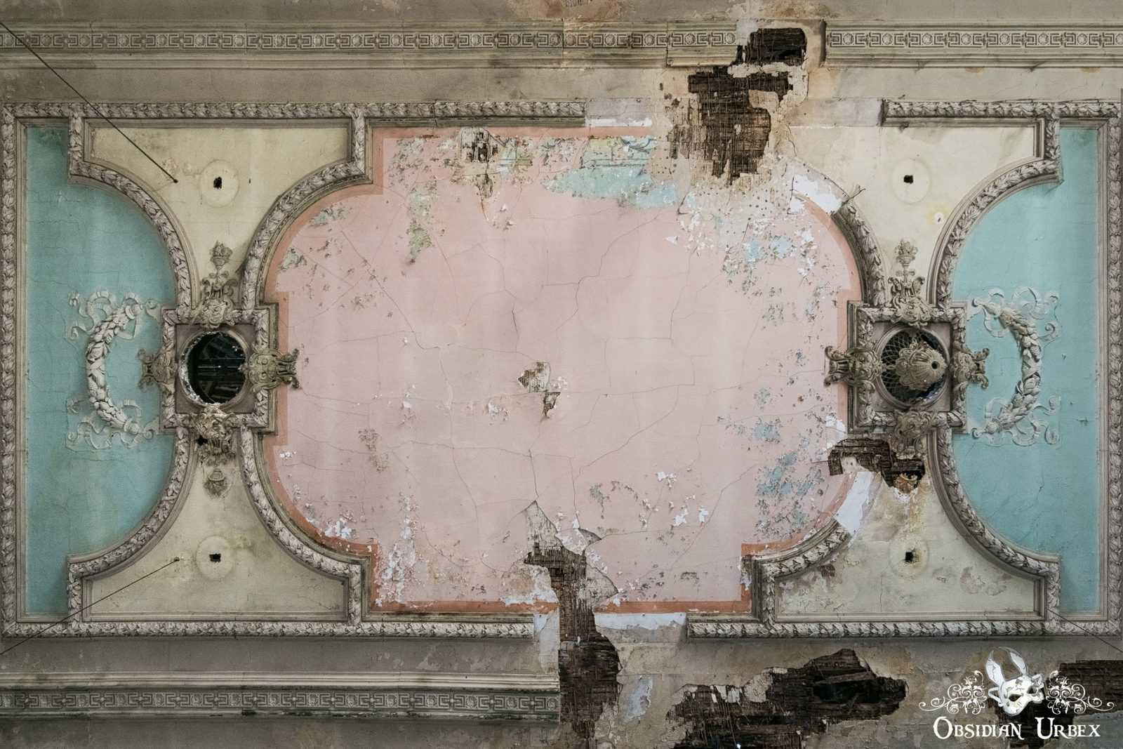 At the time of my visit, the floor was riddled with holes. Decades of decay and rot has been chipping away at the wooden floorboards. Patches of the plaster ceiling mouldings have come crashing down, leaving ugly scars. The wooden ceiling above peeks through the holes.