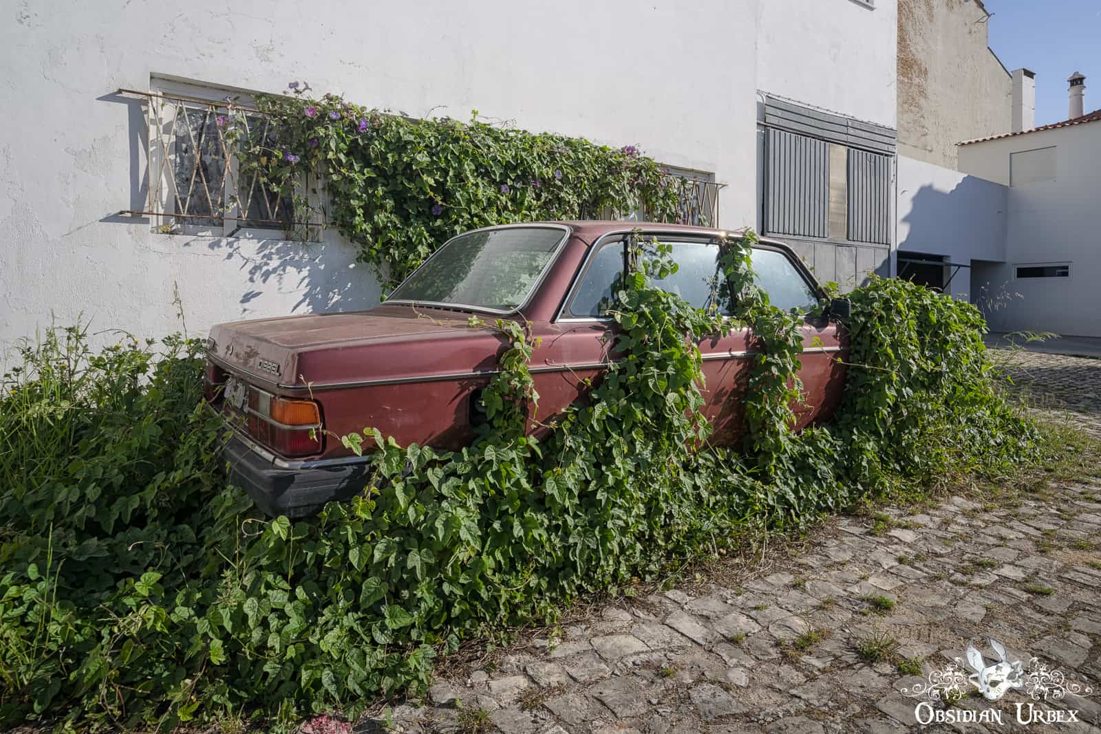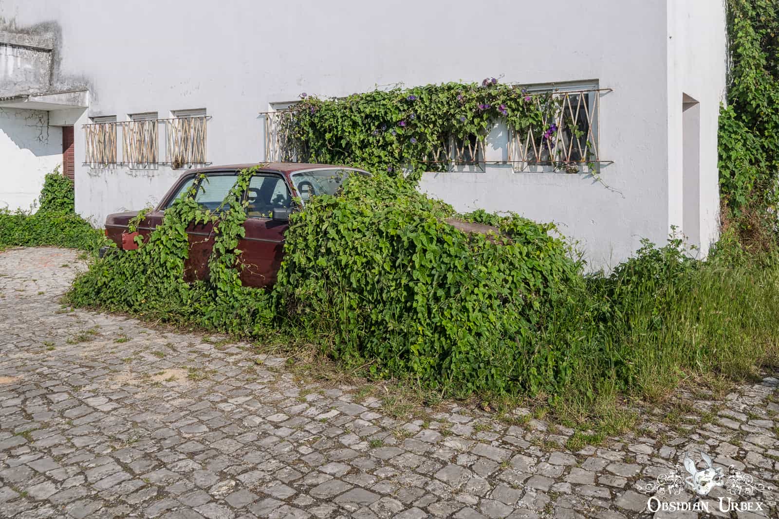 Convolvulaceae Volvo is an abandoned car sitting at the roadside in a small town in Portugal. This one was a discovery completely by chance! As we drove between two abandoned locations, we spotted this car at the roadside. The car stands in the parking lot of an abandoned factory or garage. This one was a wonderful excuse to stretch the legs and snap a few photos in the process.