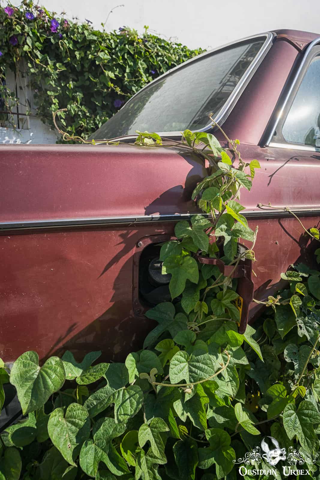 The plants that cover this car are Ipomoea purpurea (Common Morning Glory), a species that is a member of the family Convolvulaceae. They are a common sight growing wild in Portugal. While I am more a lover of ferns and other spore-producing plants, Ipomoea purpurea are one of my favourite flowers to grow in my garden back home in England. In England, the frosts kills these off every winter. So every spring, I sow seeds, nurture them in trays inside my greenhouse, and then plant them to enjoy a wall of colour all summer.