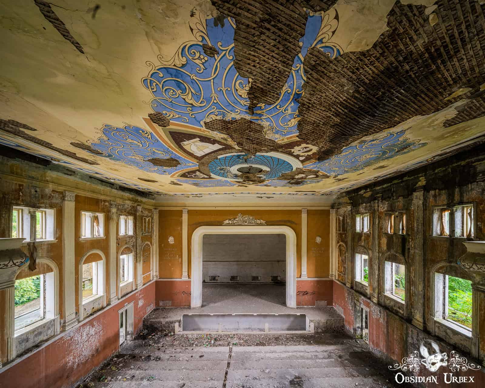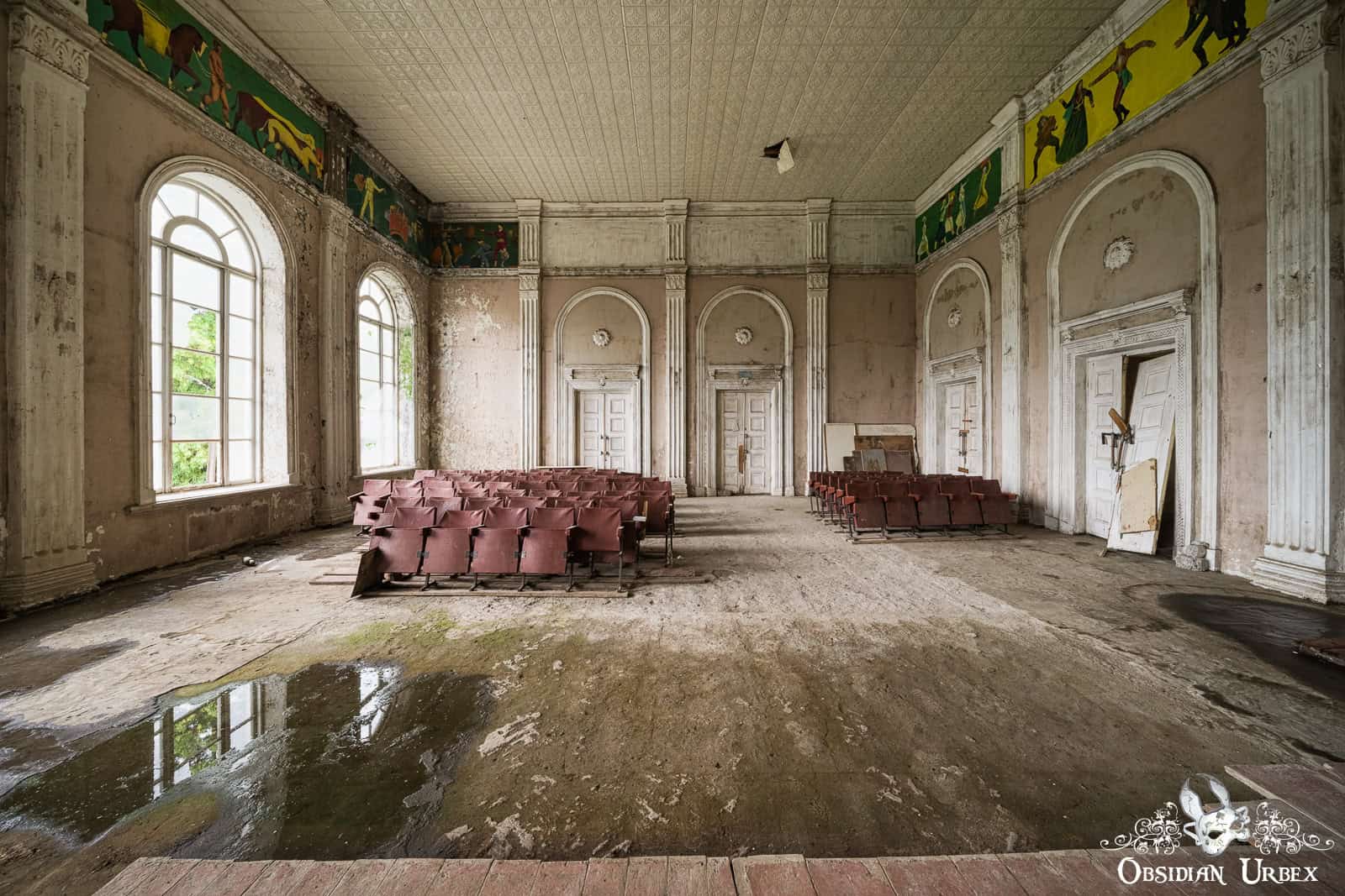 Next to the main hall is what looks like a former sports room. The upper walls still bear painted scenes of athletes in motion, undertaking various sporting activities. A handful of old theatre seats have somehow found their way in here; perhaps this side room was in use more recently in some fashion.