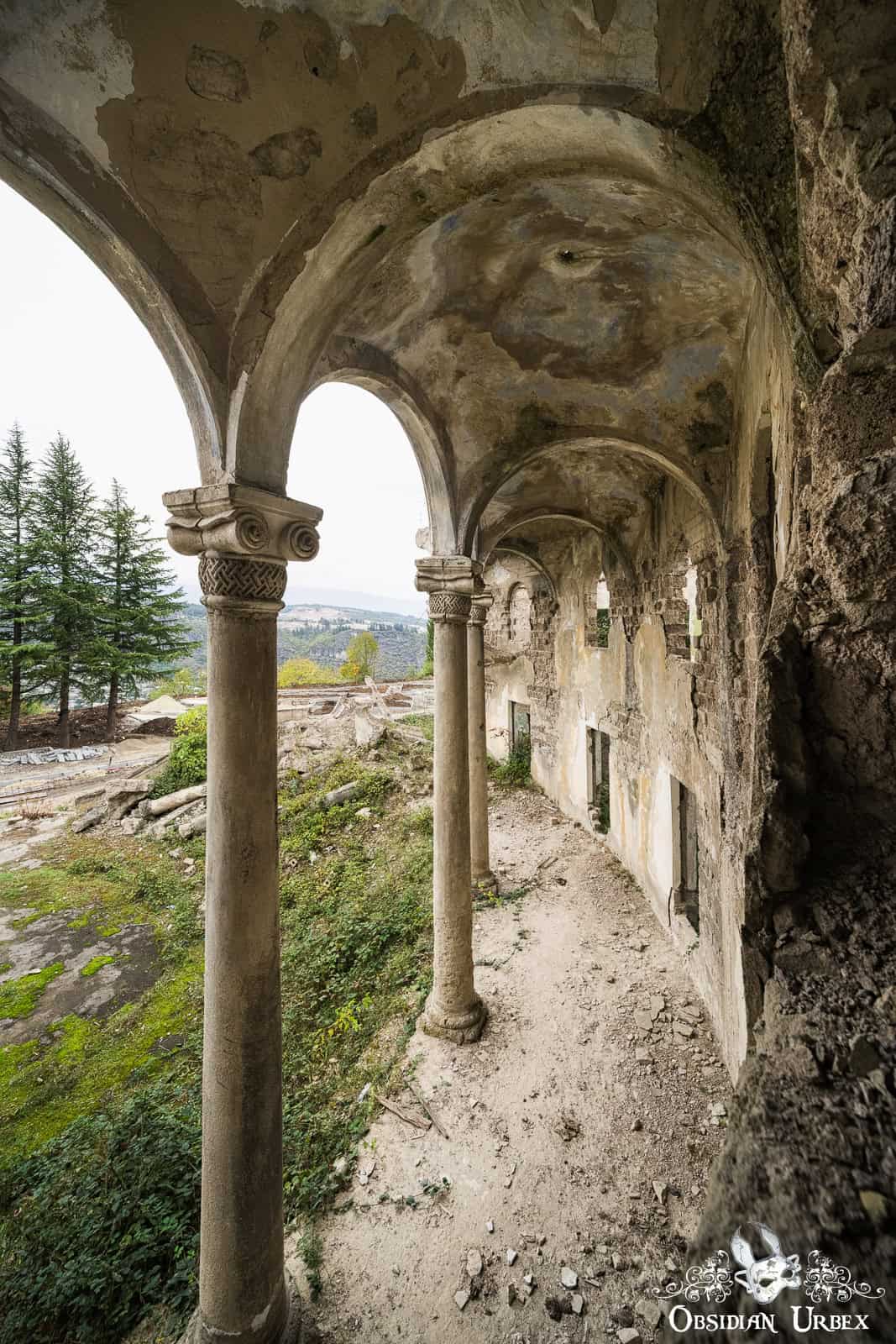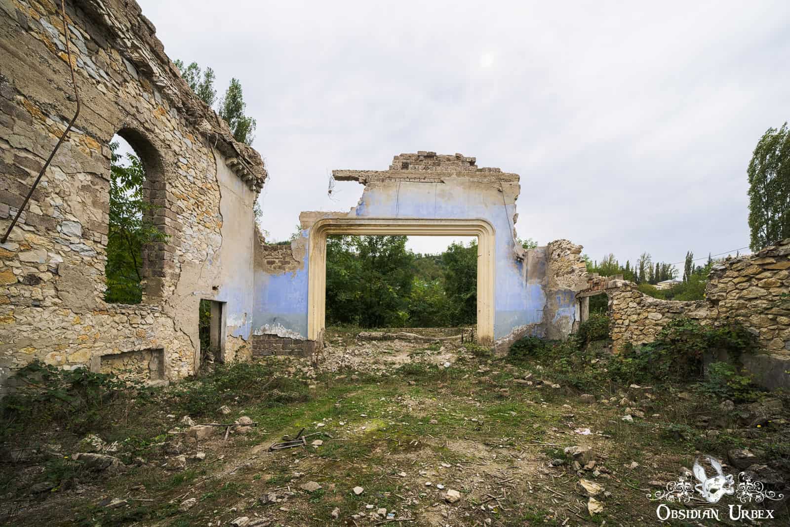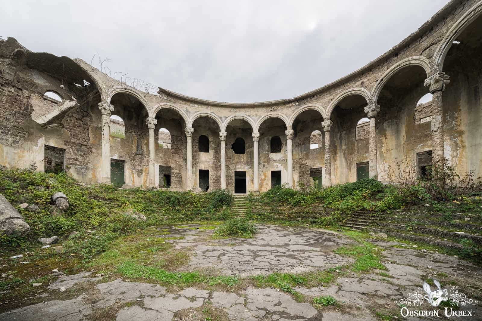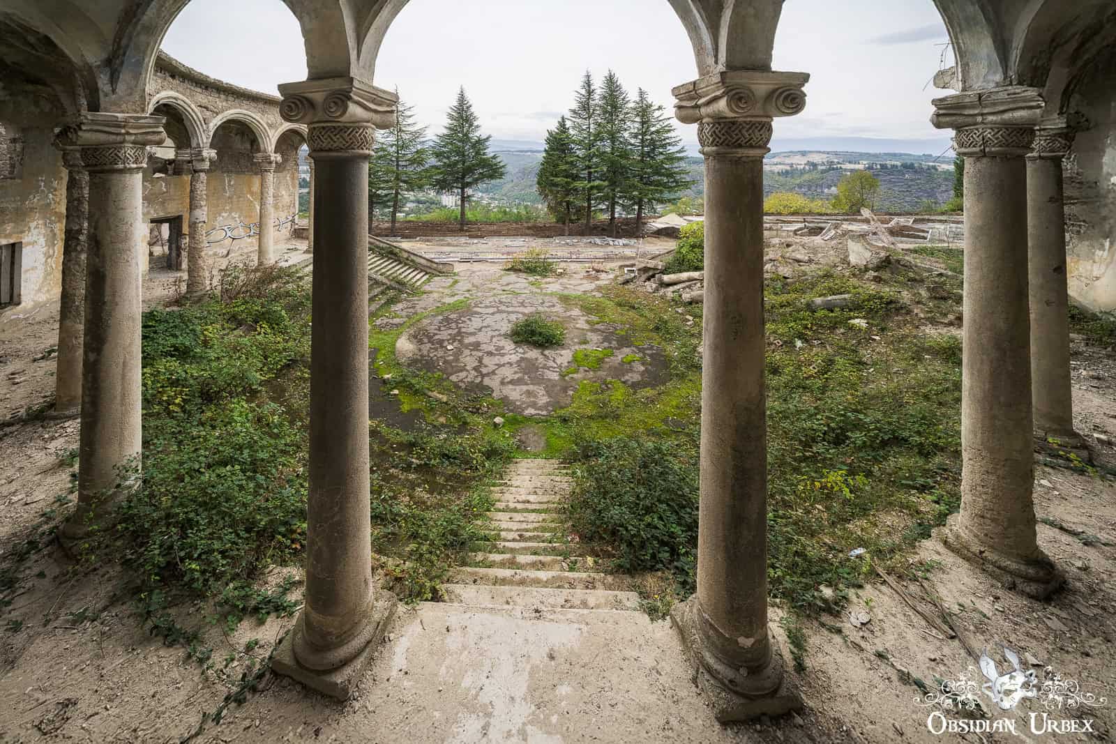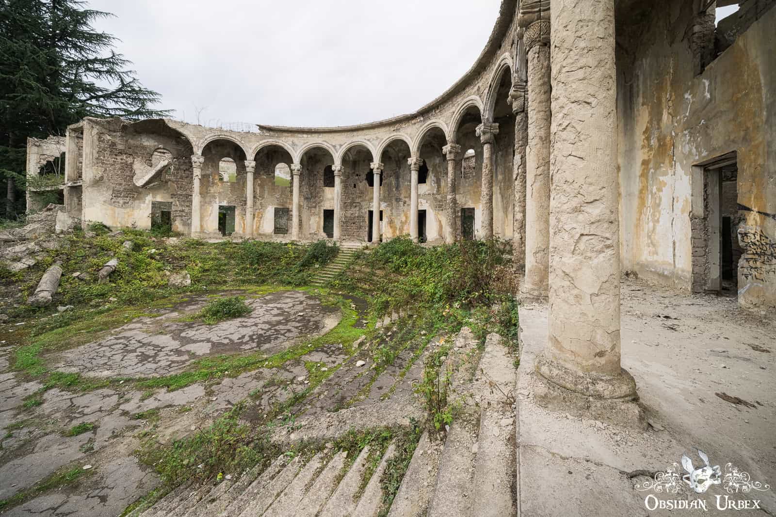 The Former Pioneer Palace stands atop a hillside overlooking the town of Chiatura, Georgia. Once a bustling cultural centre, it is now little more than a crumbling ruin. The impressive curved front is lined with colonnades, creating a striking facade. Inside, the remnants of a collapsed theatre can be found, with the proscenium arch and rear wall still standing, even though the roof fell in long ago.