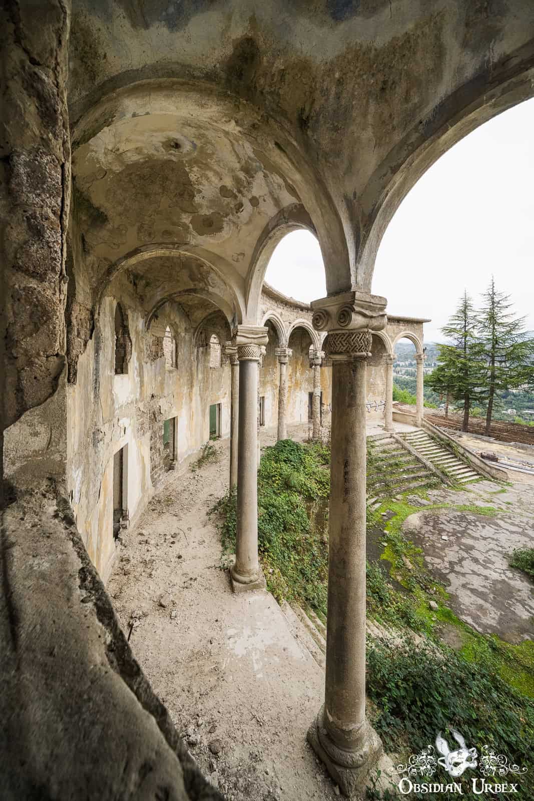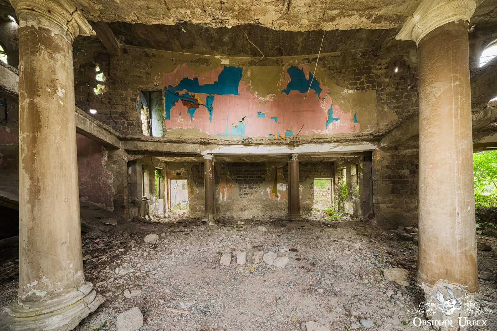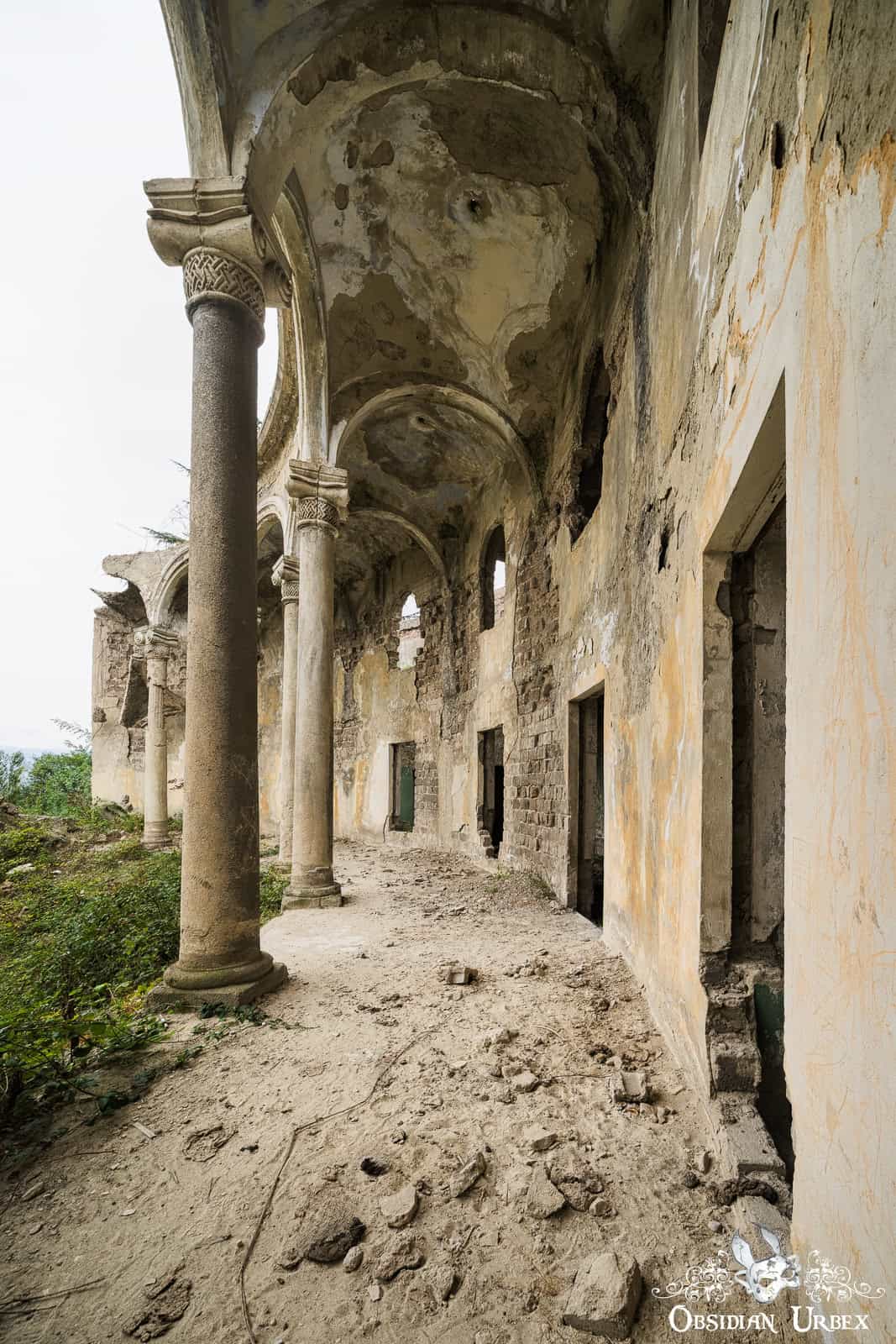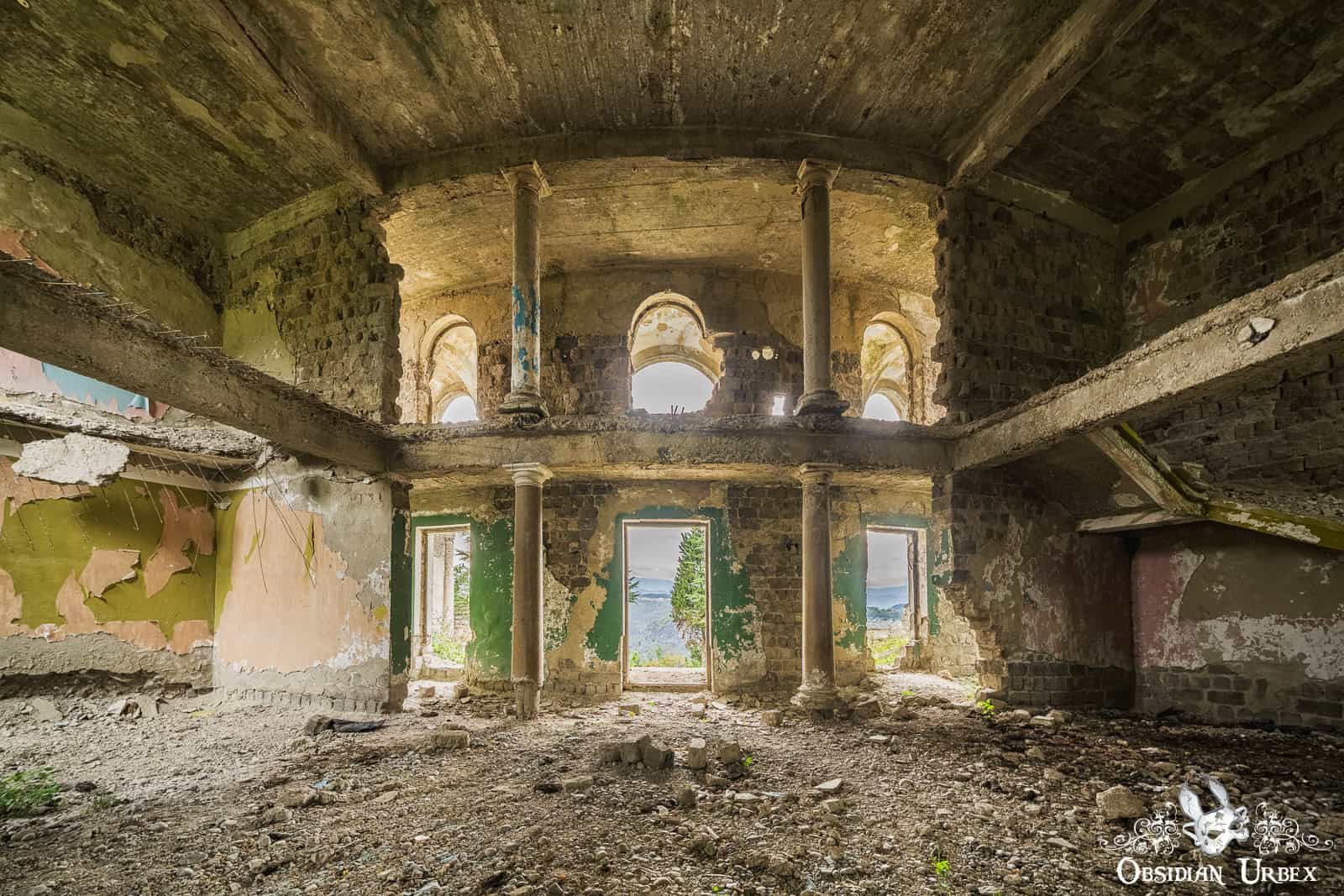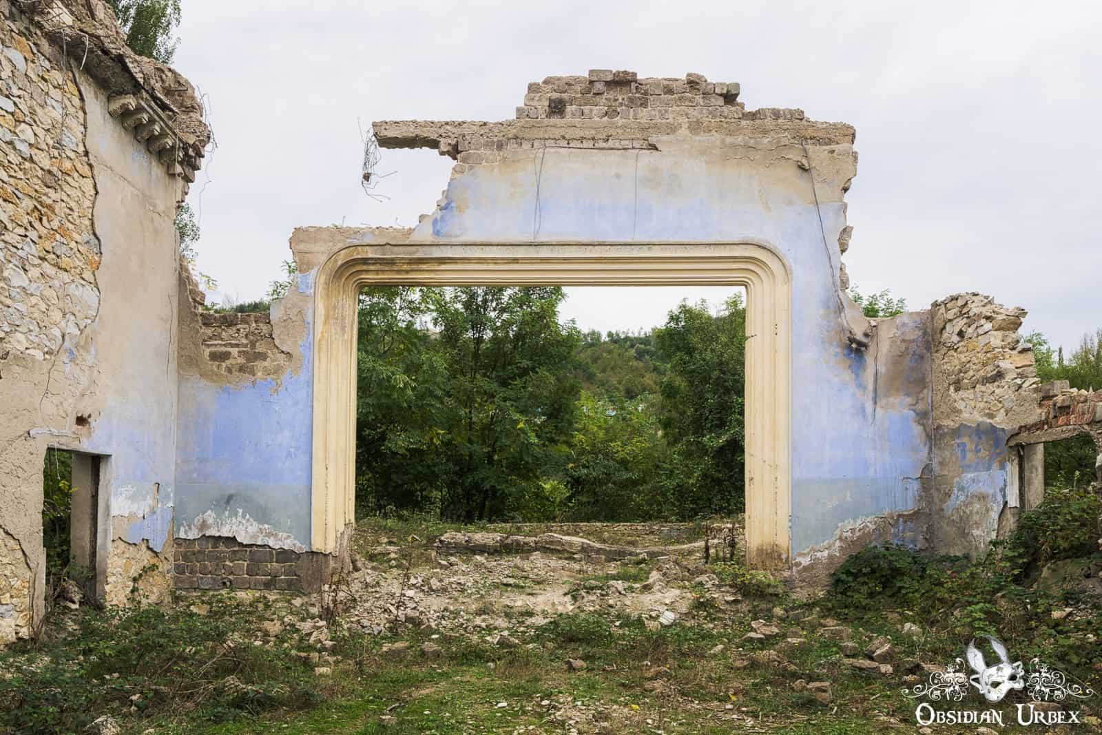 The Former Pioneer Palace stands atop a hillside overlooking the town of Chiatura, Georgia. Once a bustling cultural centre, it is now little more than a crumbling ruin. The impressive curved front is lined with colonnades, creating a striking facade. Inside, the remnants of a collapsed theatre can be found, with the proscenium arch and rear wall still standing, even though the roof fell in long ago.
