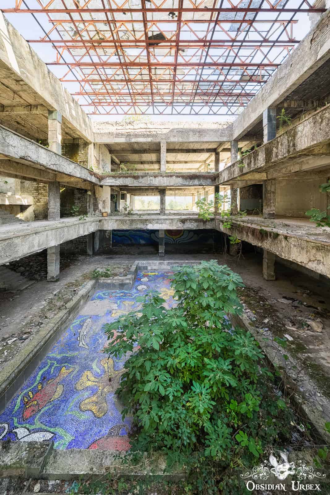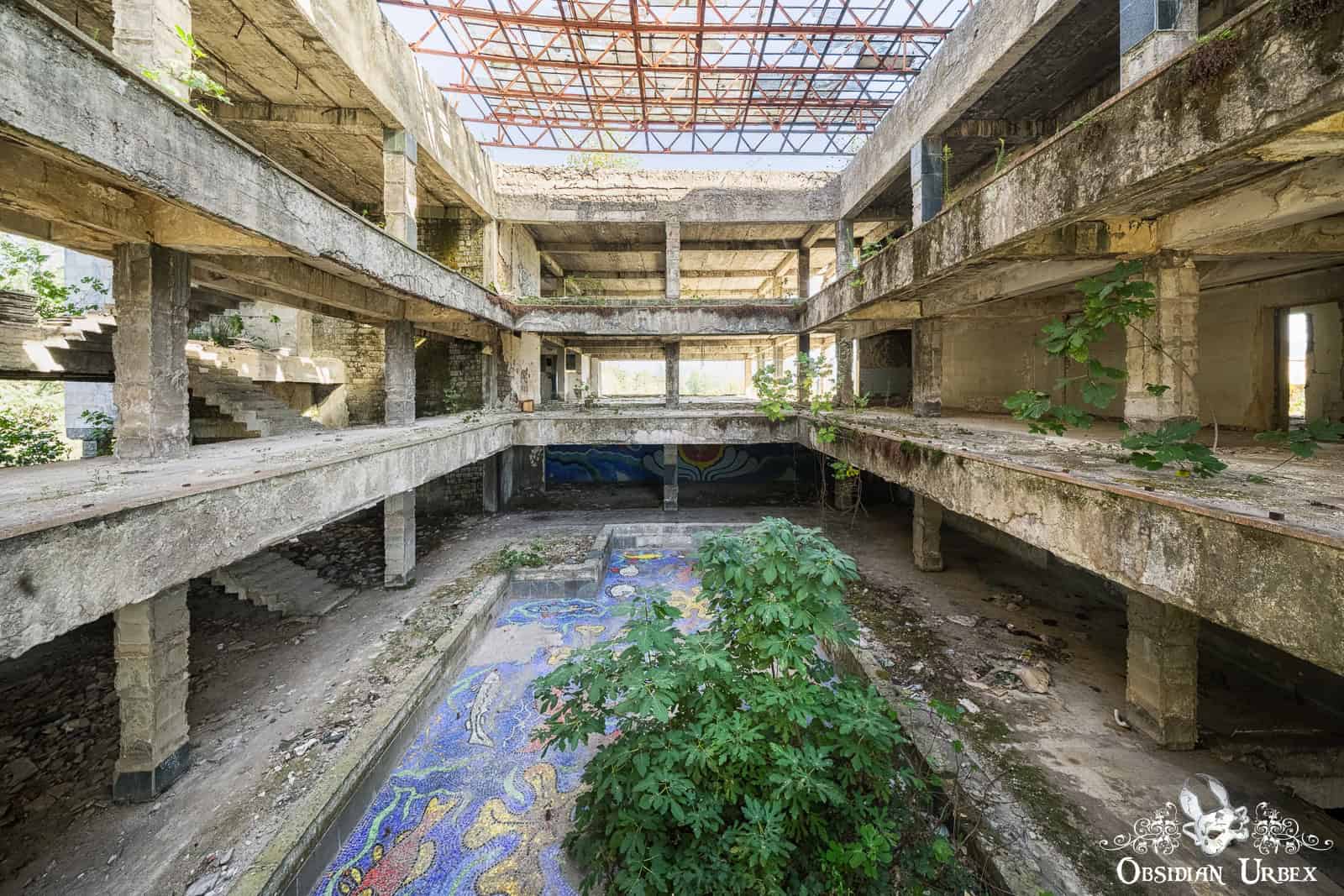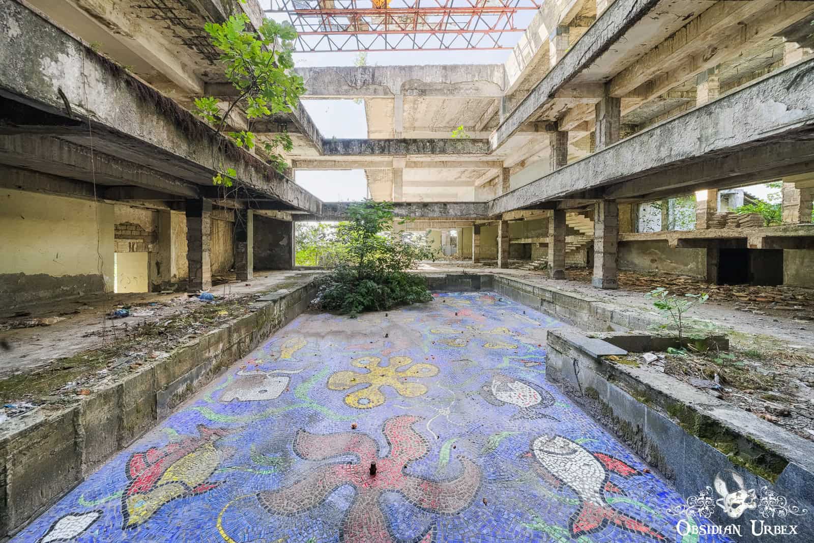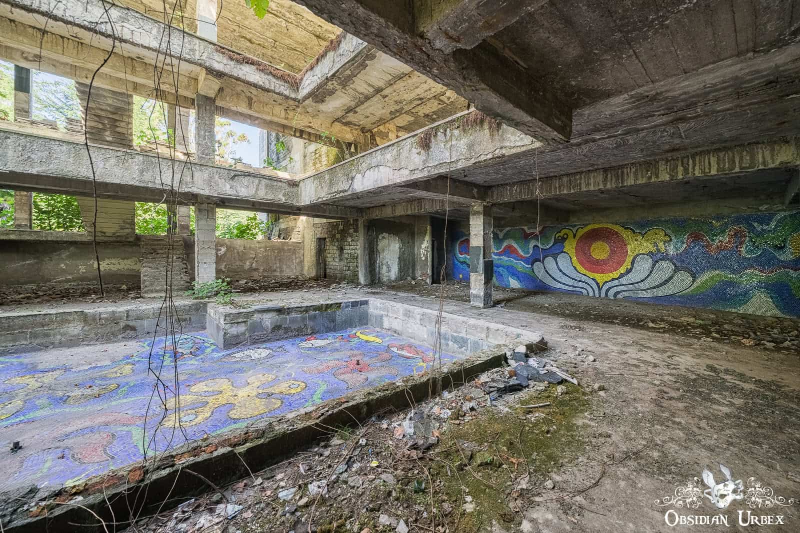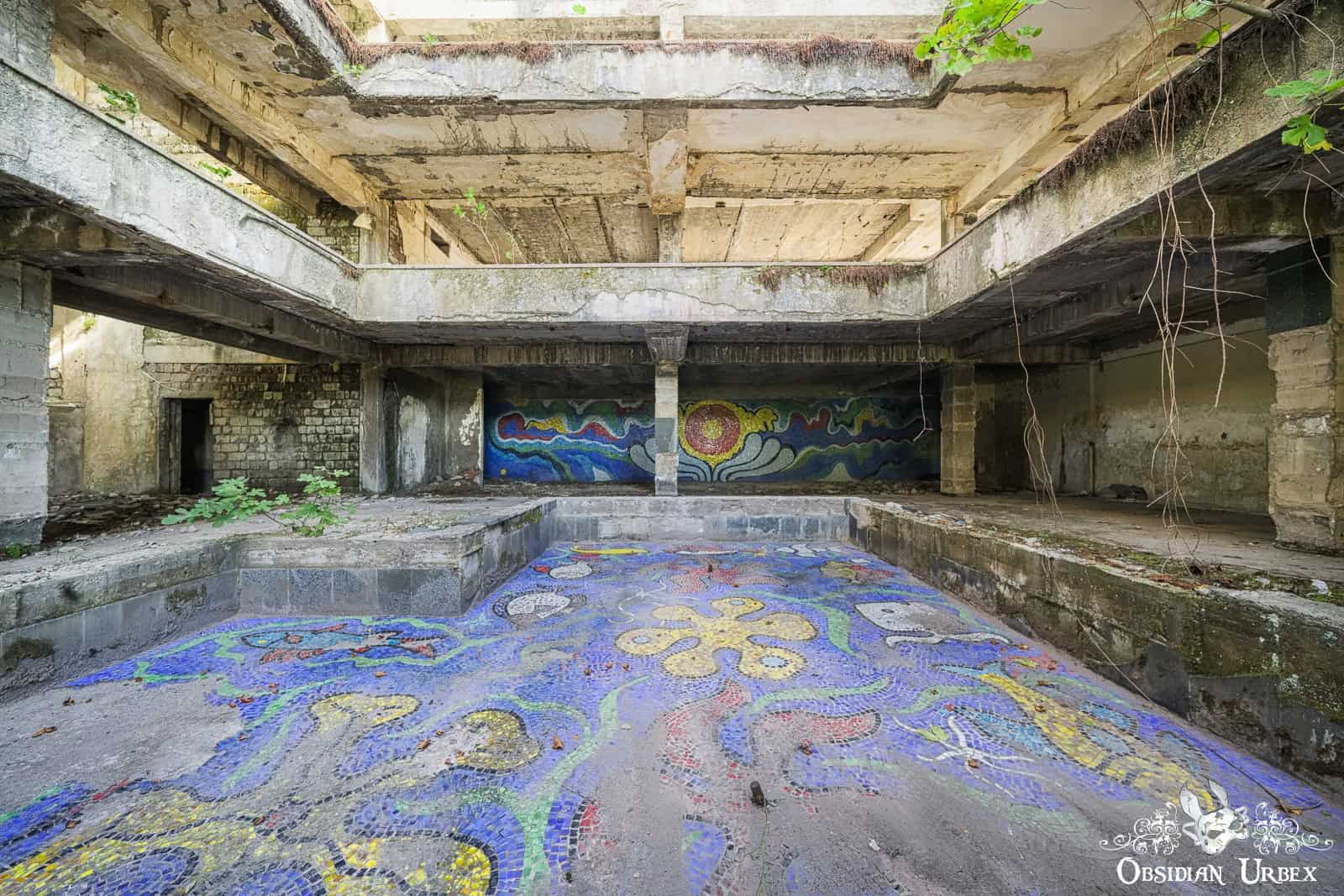Hotel Sakartvelo is one of the many abandoned resort buildings scattered across the spa town of Tskaltubo in western Georgia. Once part of a busy Soviet-era holiday industry, the hotel is now an empty shell of concrete and broken stairwells. The stripped and bare corridors and structure conceal a beautiful oasis at its heart. An old pool adorned with ocean-themed mosaics, accented with a beautiful fig tree. Nature is beginning to reclaim this place, adding her special and beautiful touch to this space.
