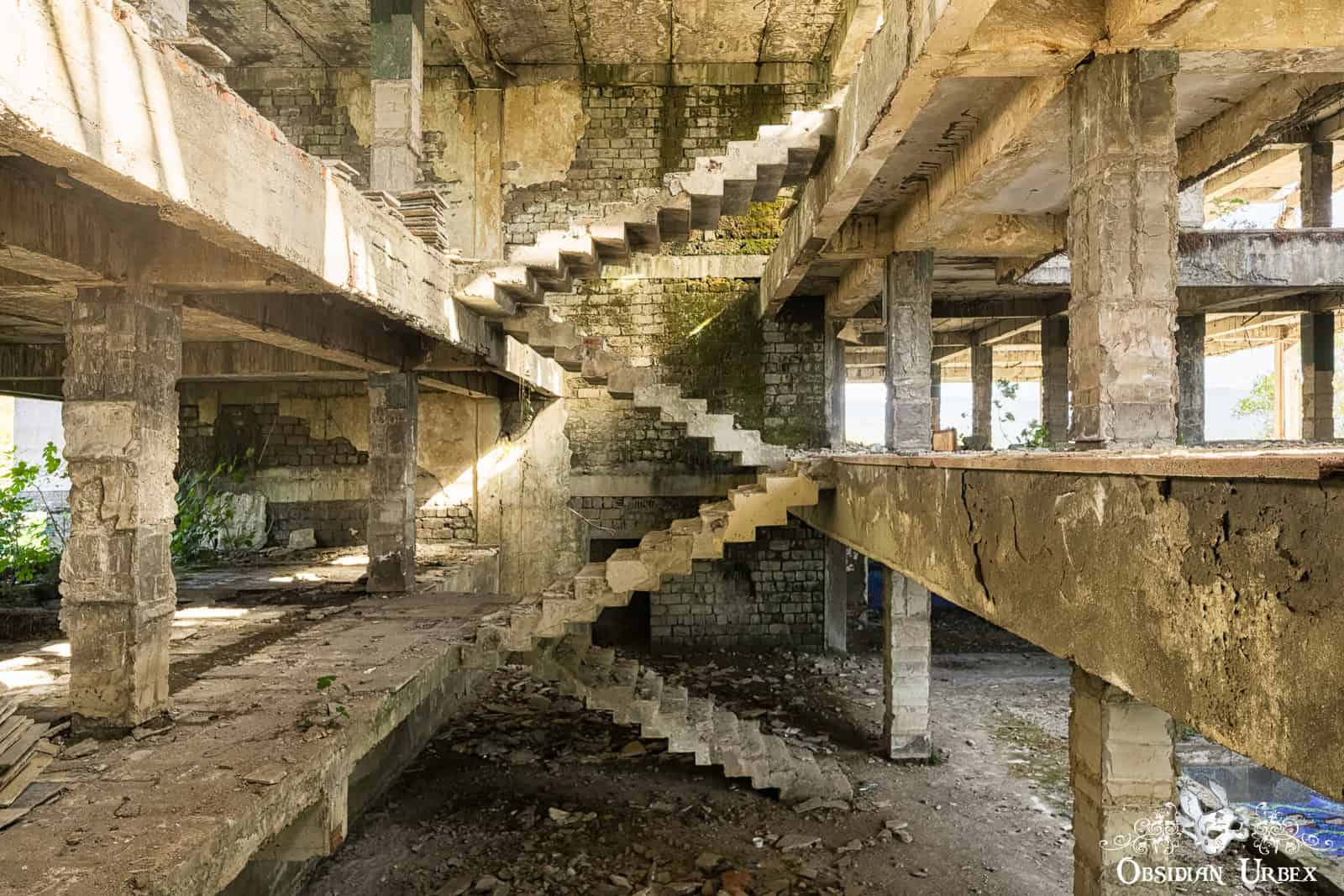 Most of Hotel Sakartvelo’s interior now stands as bare concrete. The walls are stripped back to the concrete skeleton. The damaged floors, balconies, and stairwells are even missing in places.