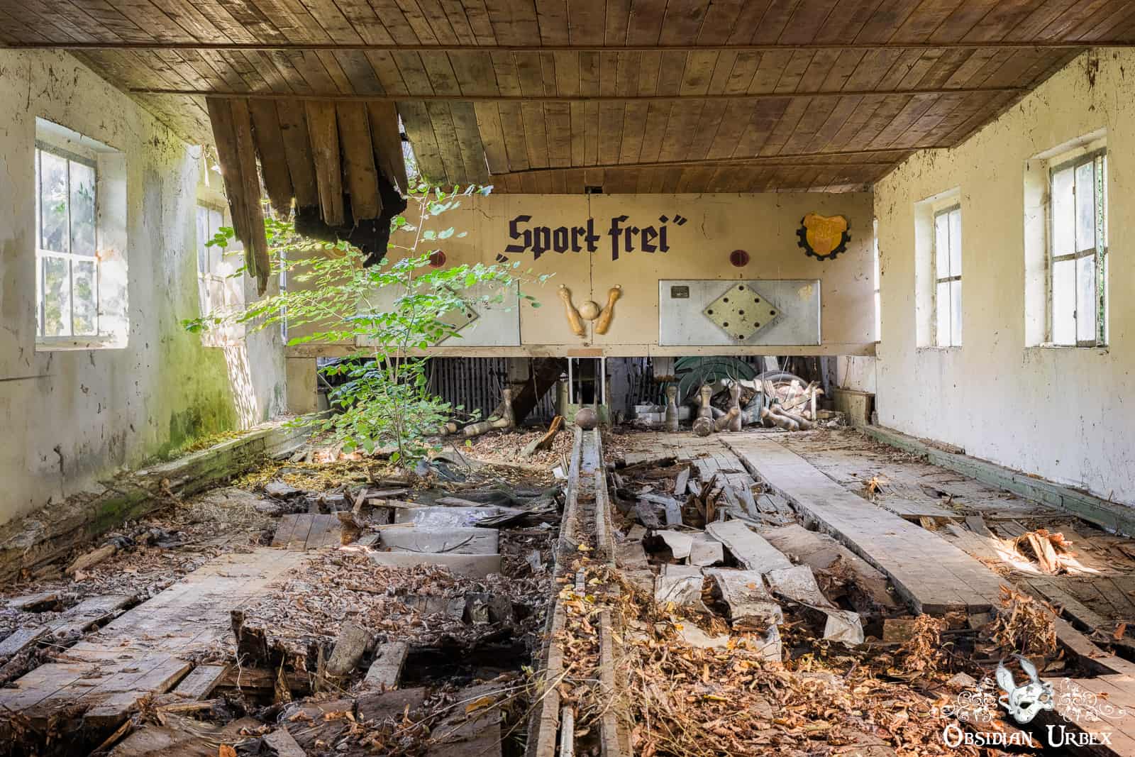 Today, the forgotten alley is a beautiful abandoned place that is quietly decaying. The wooden floor is splintered and rotting, cracking underfoot as you wall the lanes. Sapling trees sprout forth, adding a splendid touch of green to the photography.