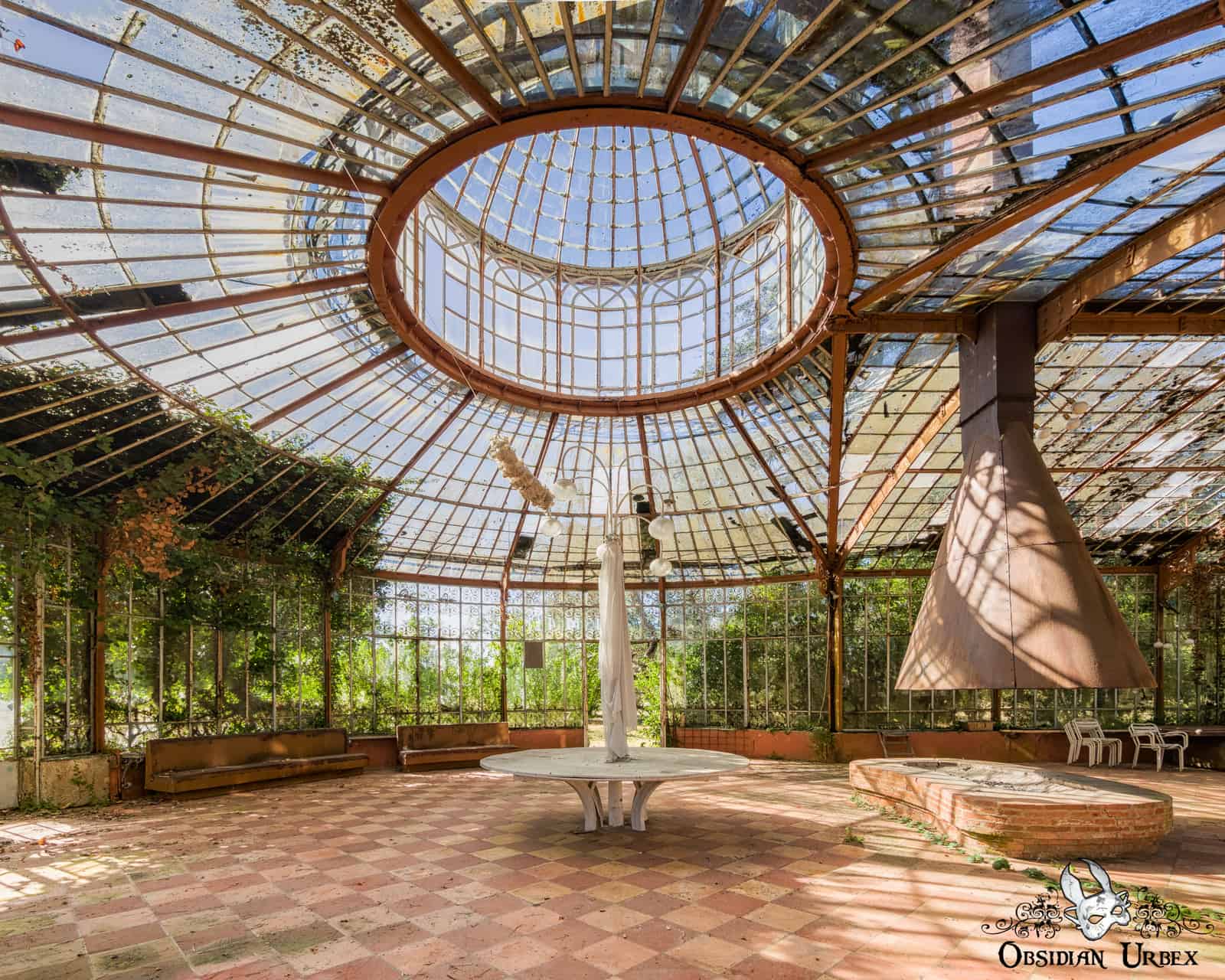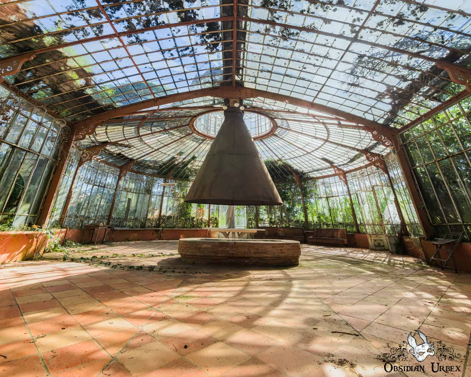In the middle of La Serre du Chirurgien is a firepit, constructed of brick. A large funnel-shaped chimney hangs above, rusty after use of neglect. Some strands of ivy sprawl across the floor at the foot of the firepit, exploiting some of the broken window panes to sneak inside the greenhouse.