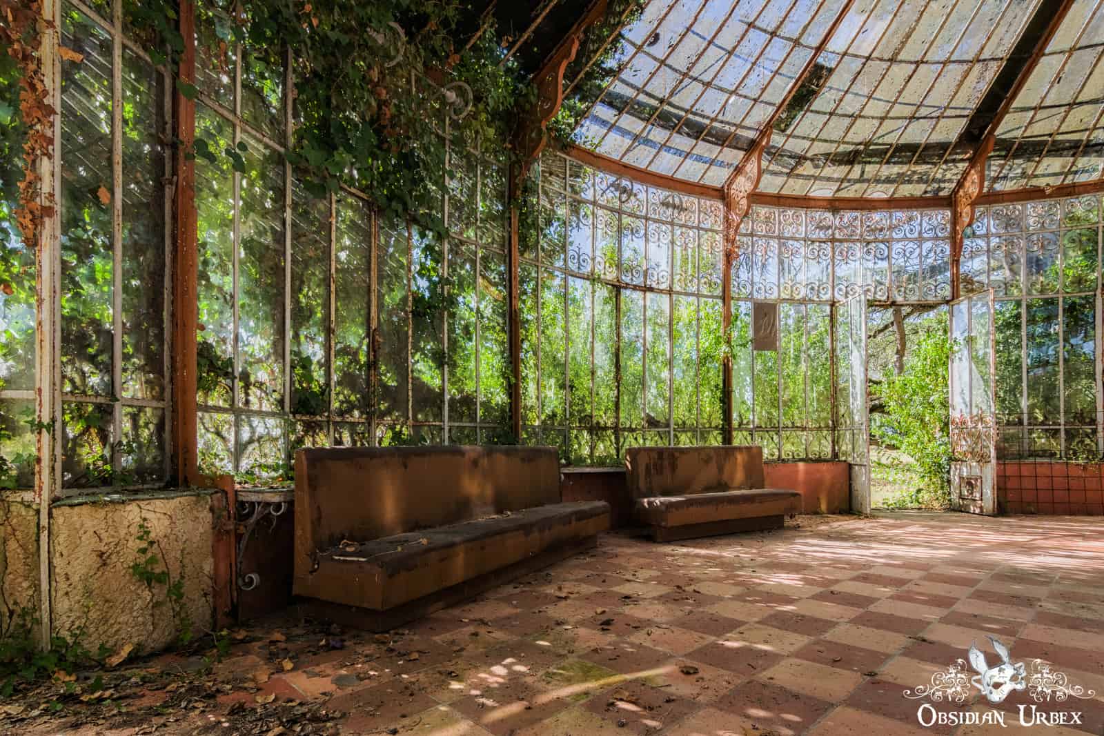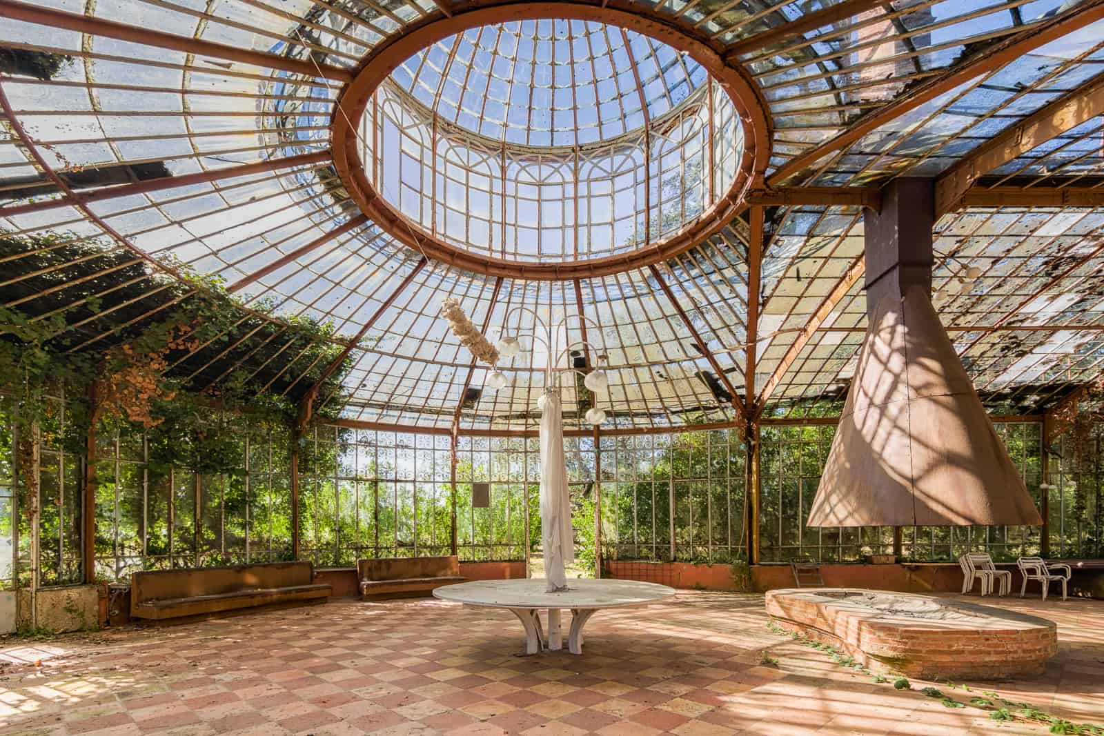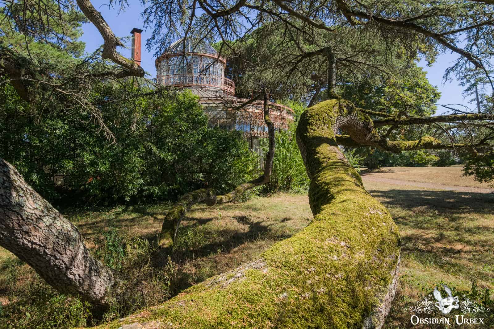I visited this location in the summer of 2018. We drove across southern France, on our way to Italy. Greenhouses are always my favourite locations. Witnesses verdant nature reclaim these flimsy glass and metal structures is always fascinating. I had wanted to visit this location for several years, and it was good to finally step inside. The weather was glorious, a perfect sunny day. I took the time to enjoy the surrounded trees and sounds of birds singing.
