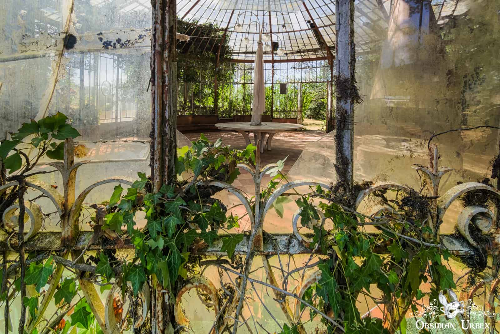 Outside there is a rusty spiral staircase, leading to a walkway at the top of the greenhouse. The exterior walls are partially overgrown by ivy and other scrambling plants.