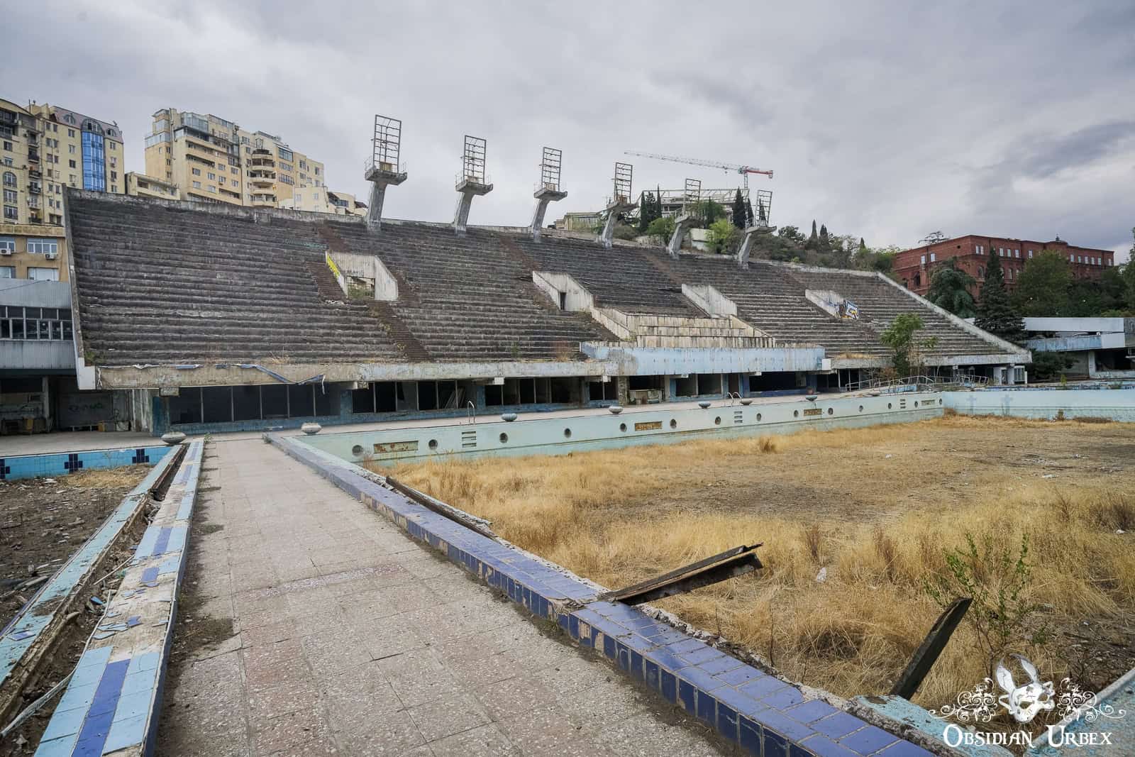 The complex consisted of three outdoor pools: a 50 × 25m Olympic competition pool, a 25 × 20m diving pool, and a 25 × 10 m training pool. The diving pool has boards at 3m, 5m, 7.5 meters, and 10m (the 10m for Olympic-standard diving). Seating capacity for spectators could accommodate 5,500 people. The diving tower above the pool is cast in exposed concrete, a hallmark of Soviet Brutalist expression. At the front, the façade featured a large mosaic by artist Koka Ignatov, crafted in the smalti-glass technique. This mosaic panel remains one of Georgia’s longest decorative artworks.