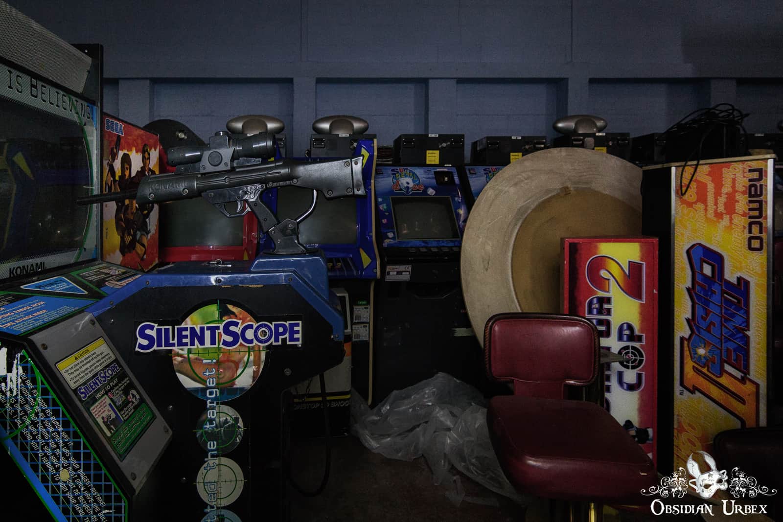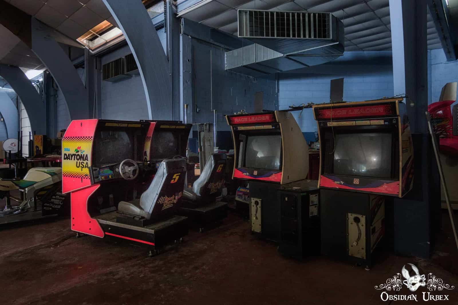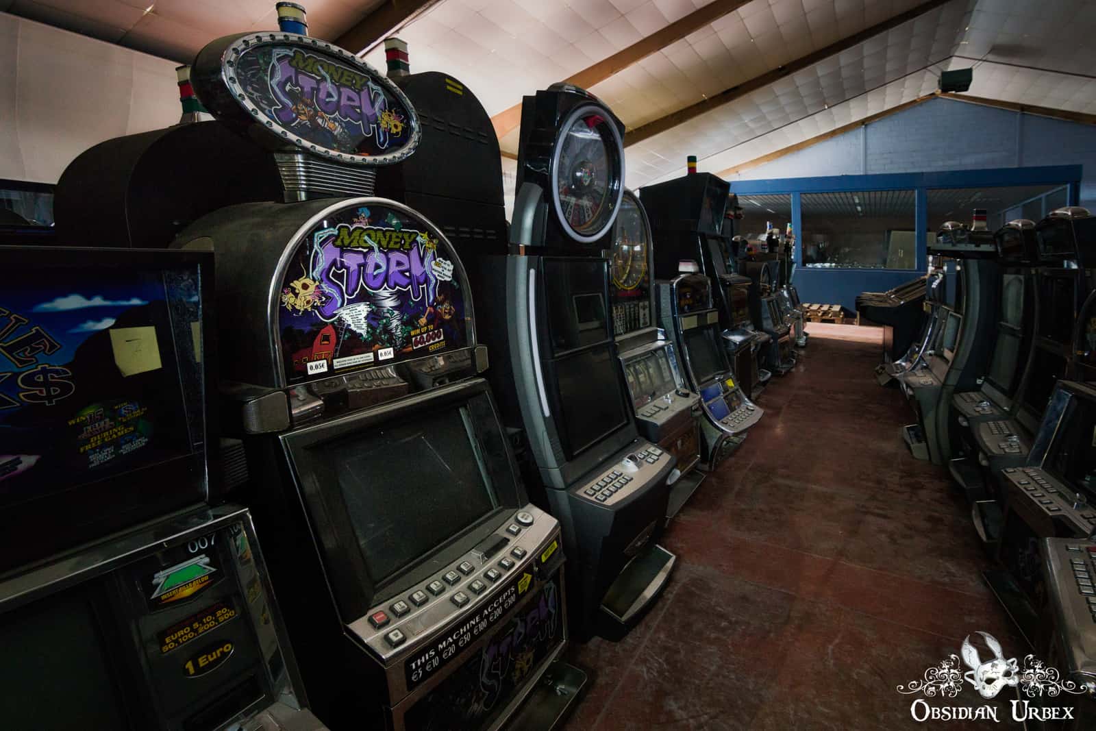 Lost Vegas Arcade is a large collection of video game arcade cabinets and gambling machines, which are stored in an old car dealership in Belgium. At one side of the warehouse, are a vast number of red slot machine chairs emblazoned with a smiling clown logo. It is not currently known why these machines are stored here, or by whom. It is likely that the machines and chairs represent the remnants of a failed casino/arcade, and are being stored here until they can be sold on or a new venue found to house the collection.