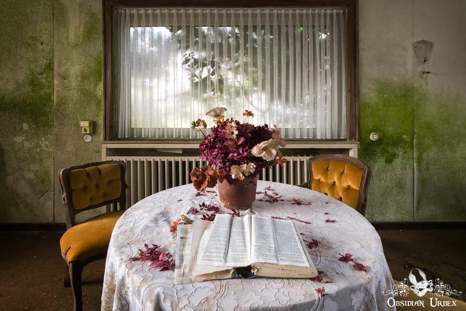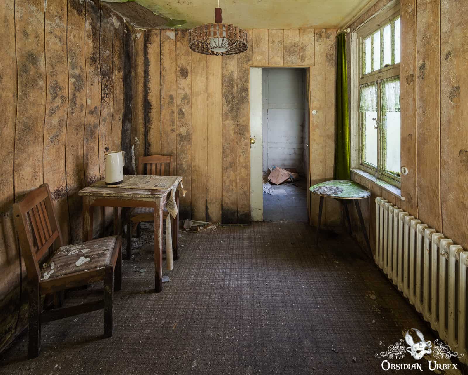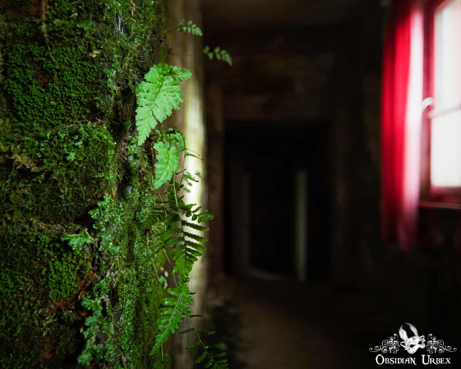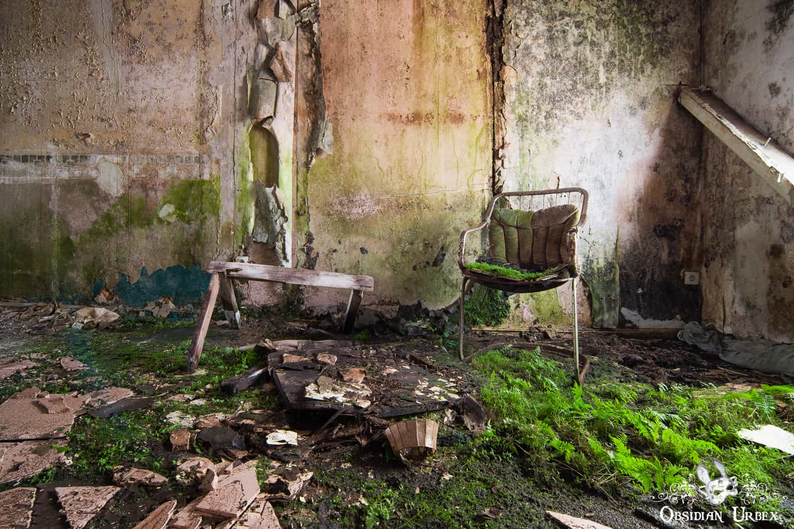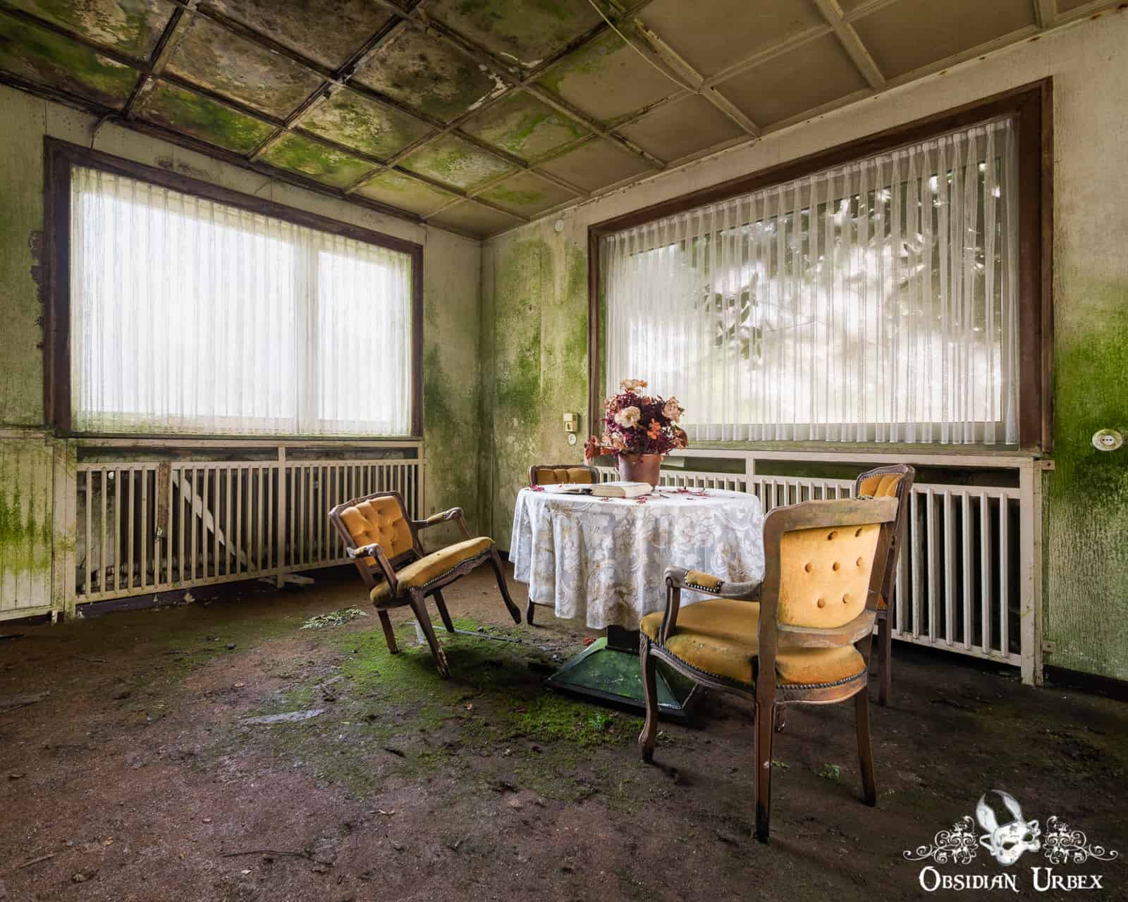 However, the second building is where the code name begins to make more sense. The main area of interest for a photographer of decay, is the restaurant. The dated decor is offset by wonderful vivid green moss growing on the carpet. Four mustard yellow chairs stand at a single round table, with an almost pristine white tablecloth. Additionally one of the legs of the chair has rotted away and it stands at a jaunty angle. On top of the table is a vase of faux flowers. The scene is highly staged after years of photographer intervention, of course.